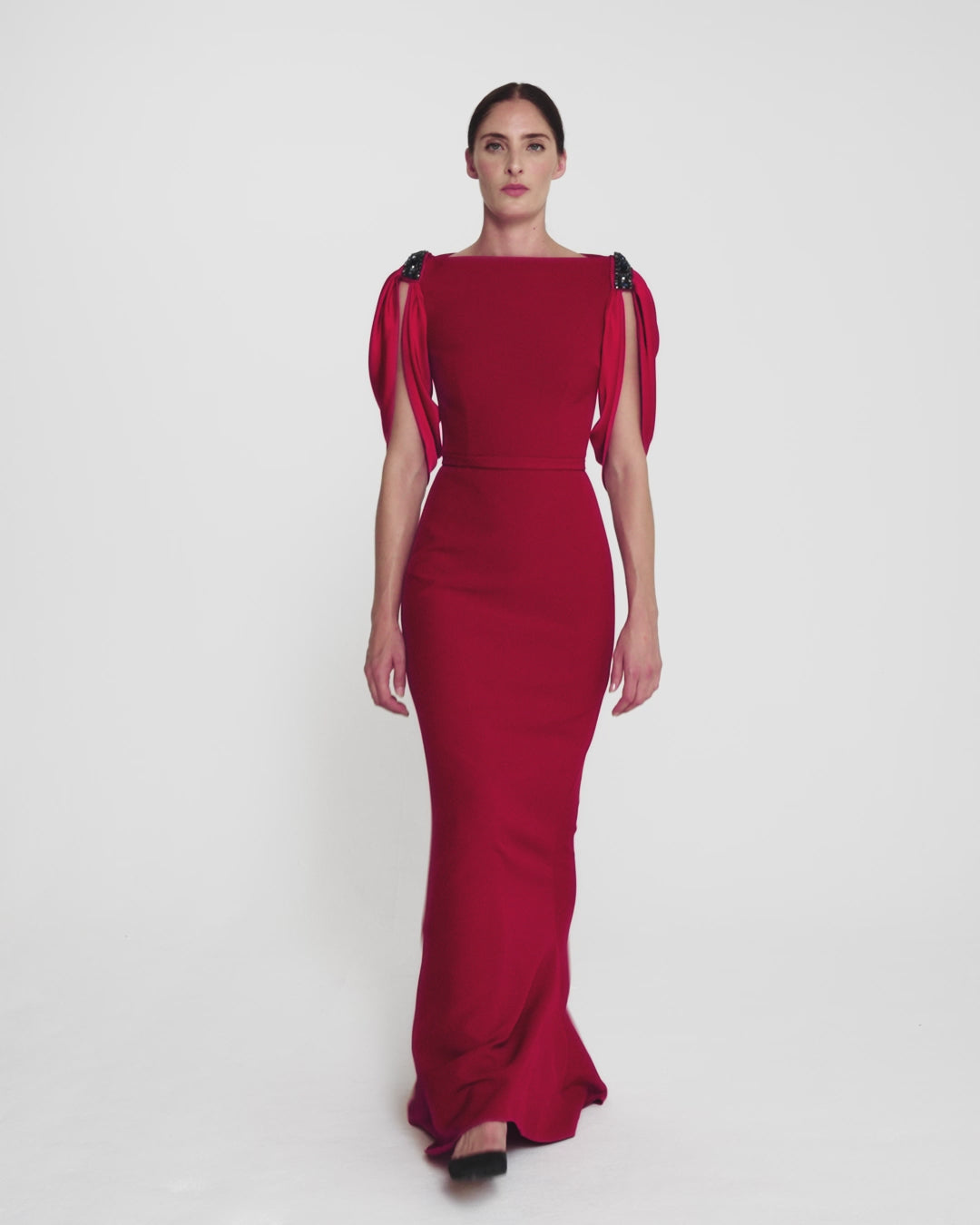 From the Spring Summer ’26 collection, the Mariah Dress in cherry red on azalea red with multi-blues explores structure through subtle contrast. A square neckline and sculpted bodice are offset by ribbon-tied strap sleeves, while the matching Jonia belt draws the line inward before the skirt flares gently toward the floor.