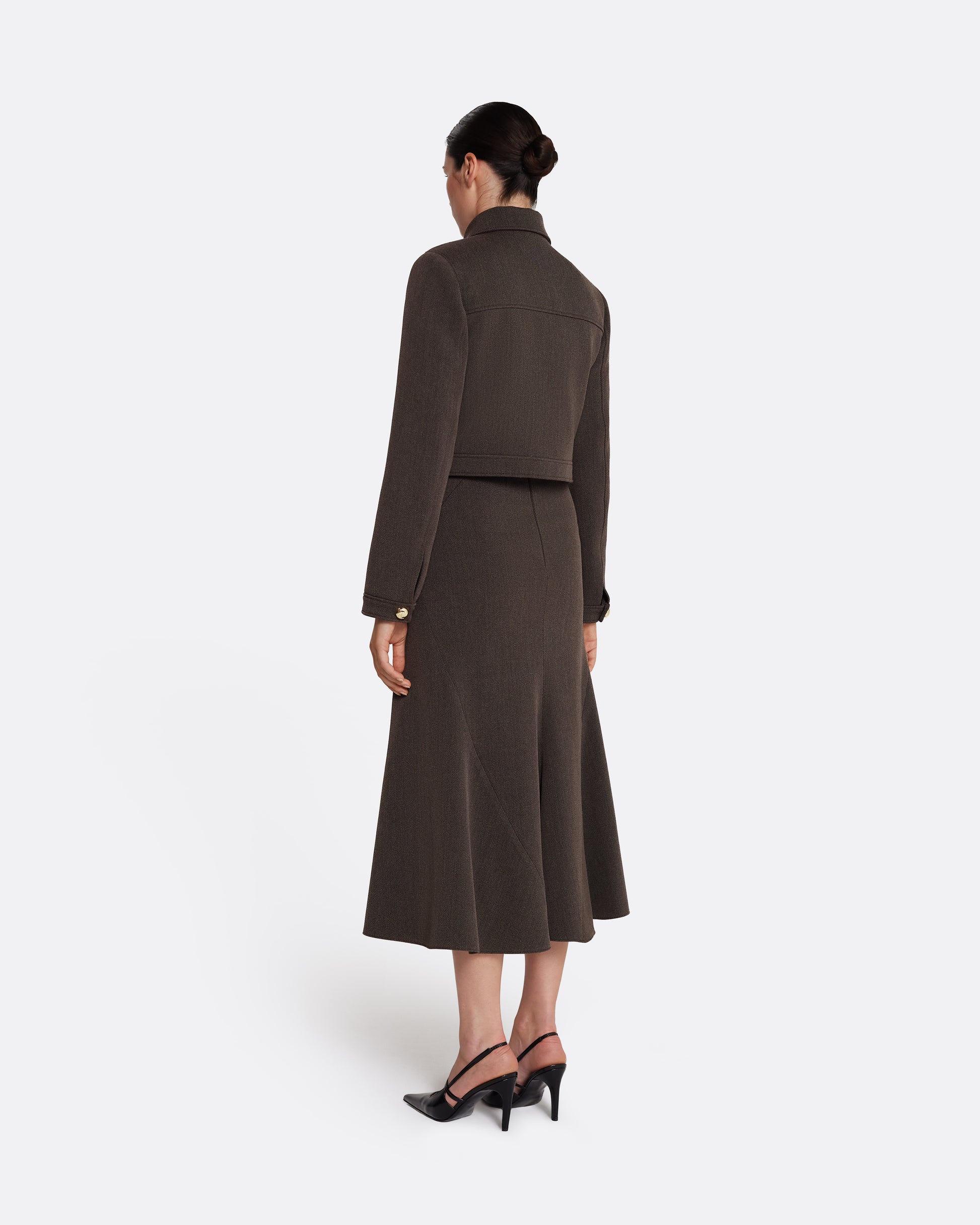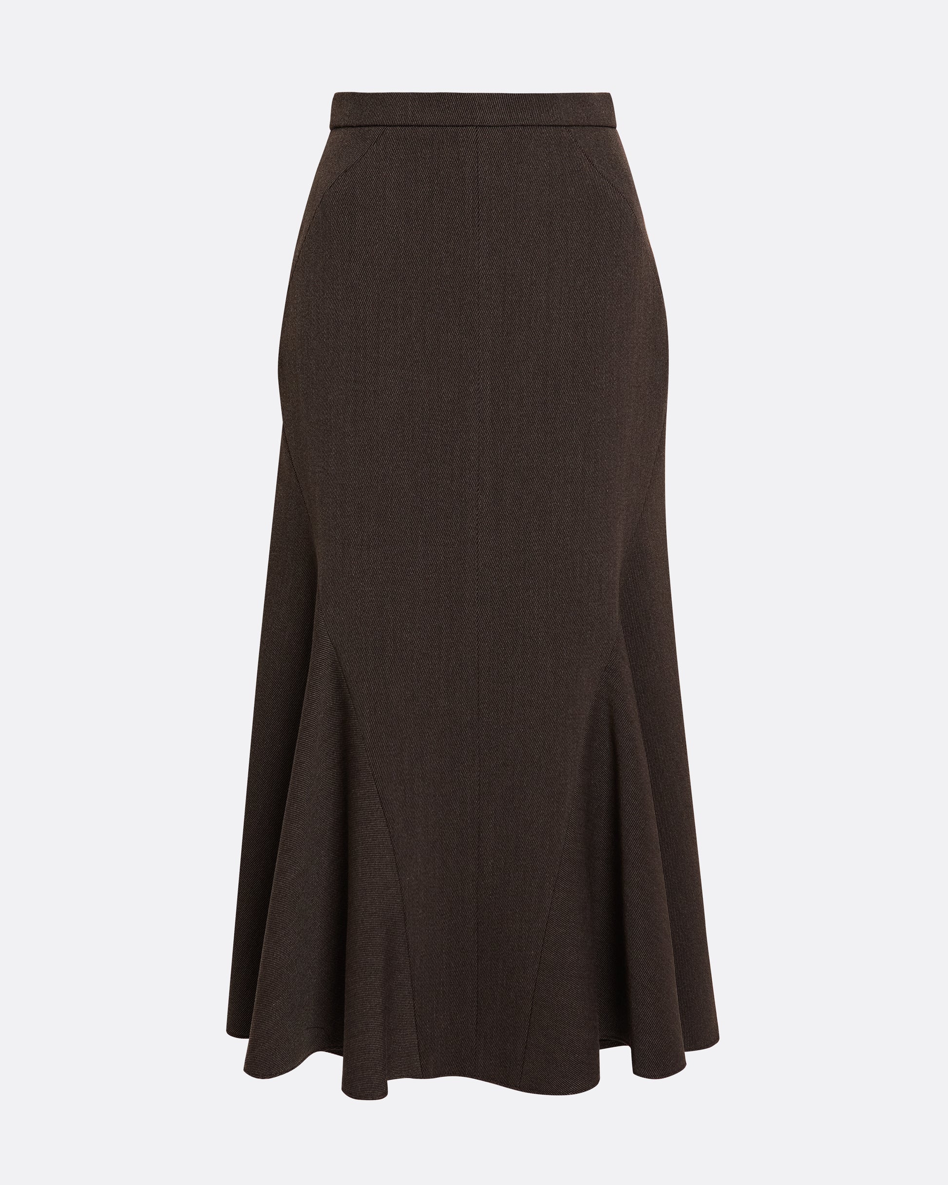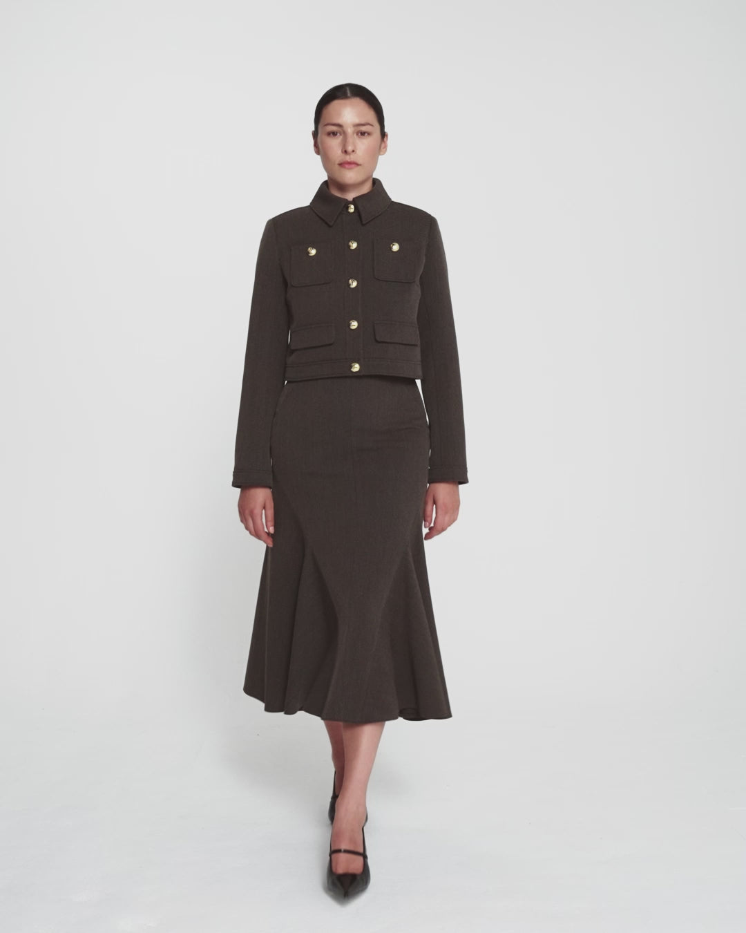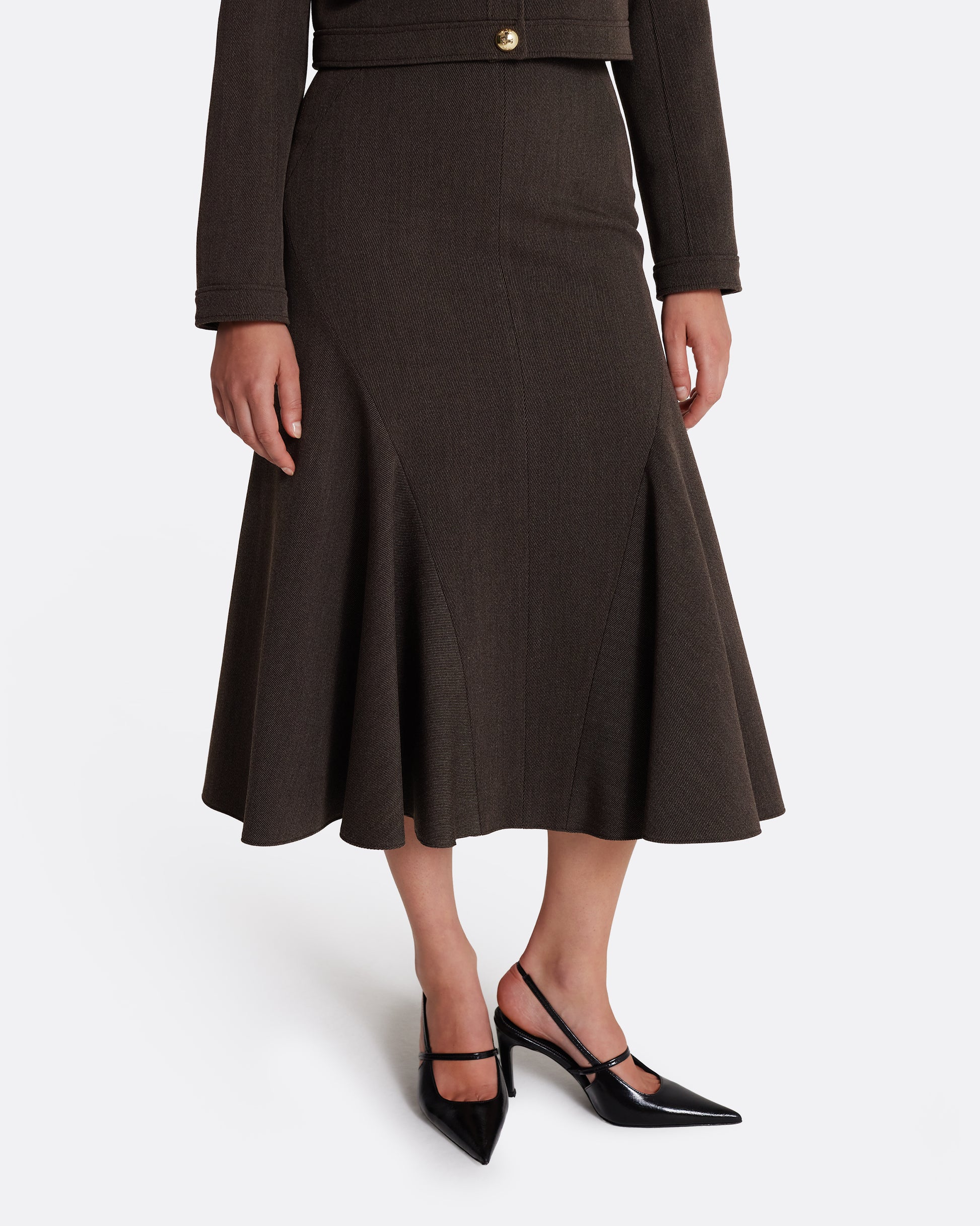 From the Spring Summer ’26 collection, the Marialuisa Skirt in soft brown offers a structured approach to fluidity. Fitted through the waist and hips before softening into a flared hem, the shape creates a refined sense of motion.