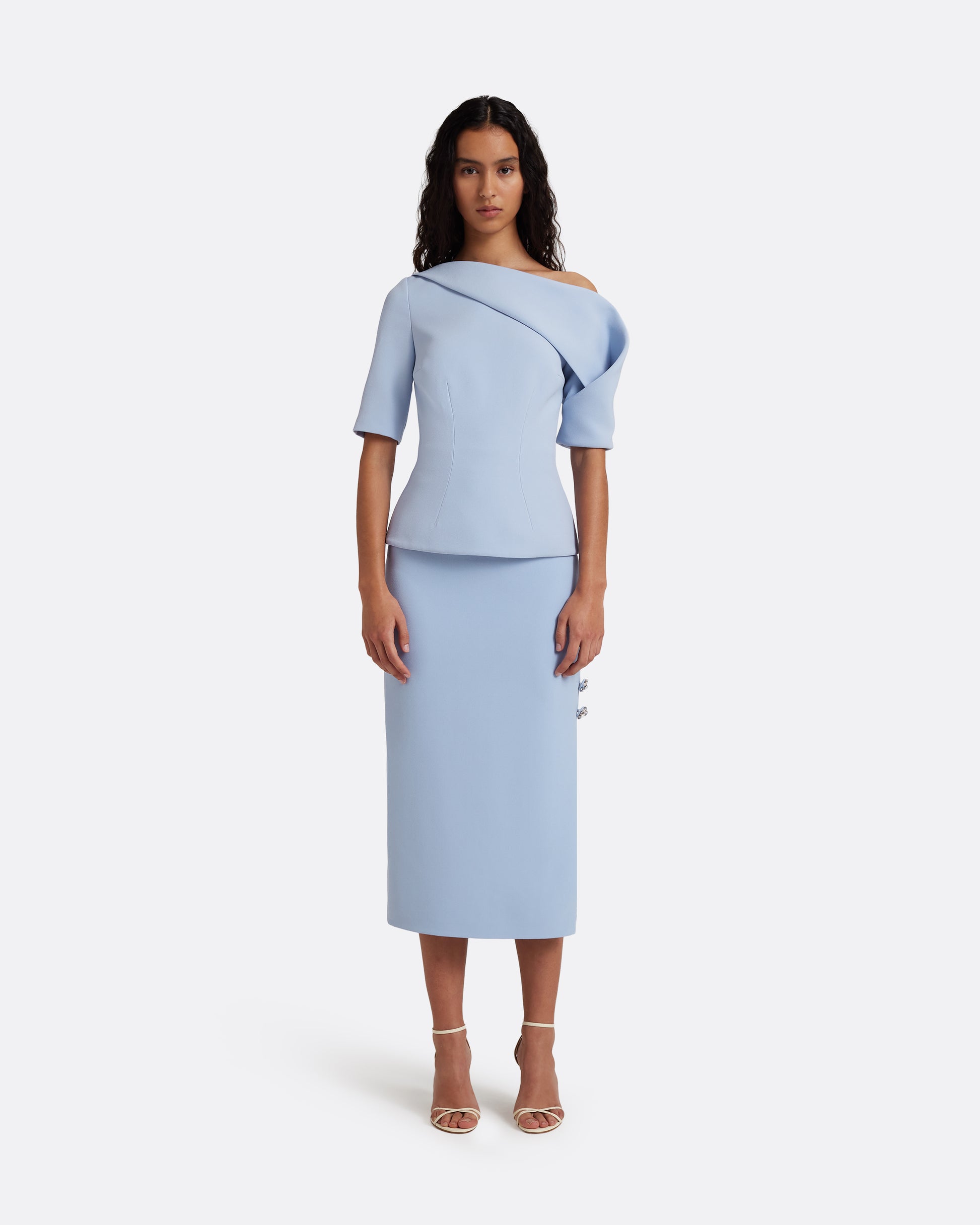 From the Pre-Fall ’26 collection, the Marley Top in soft sky is a short-sleeve top designed for occasion dressing and elevated separates styling. Crafted in Heavy Crepe, it features sculpted draping that defines the silhouette with a clean, structured finish. Designed to pair with the matching Alexa Trousers or Georgie Skirt.