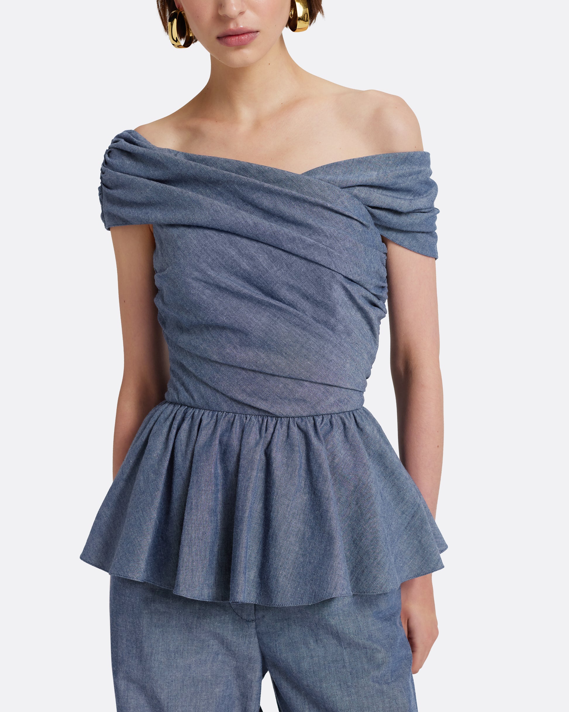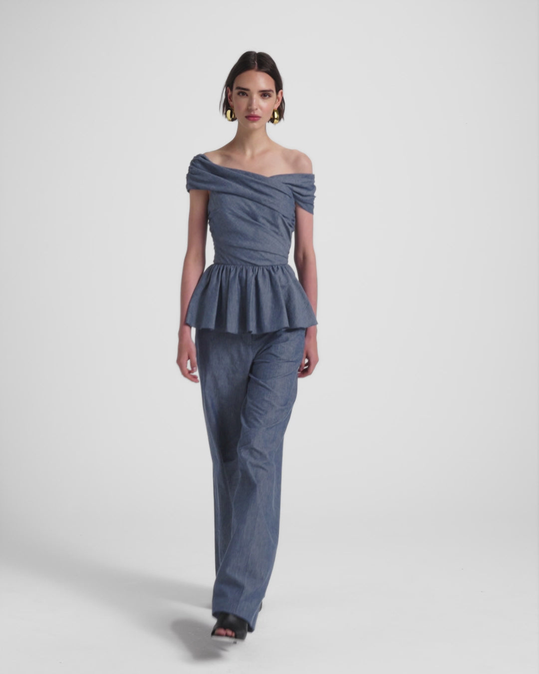 From the Pre-Fall ’26 collection, the Melanie Top in blue blend is an off-the-shoulder top designed for elevated daywear and modern occasion dressing. Crafted in chambray, the silhouette is softly draped with a peplum detail that defines the waist while maintaining ease. Designed to pair with matching chambray bottoms for a coordinated look.