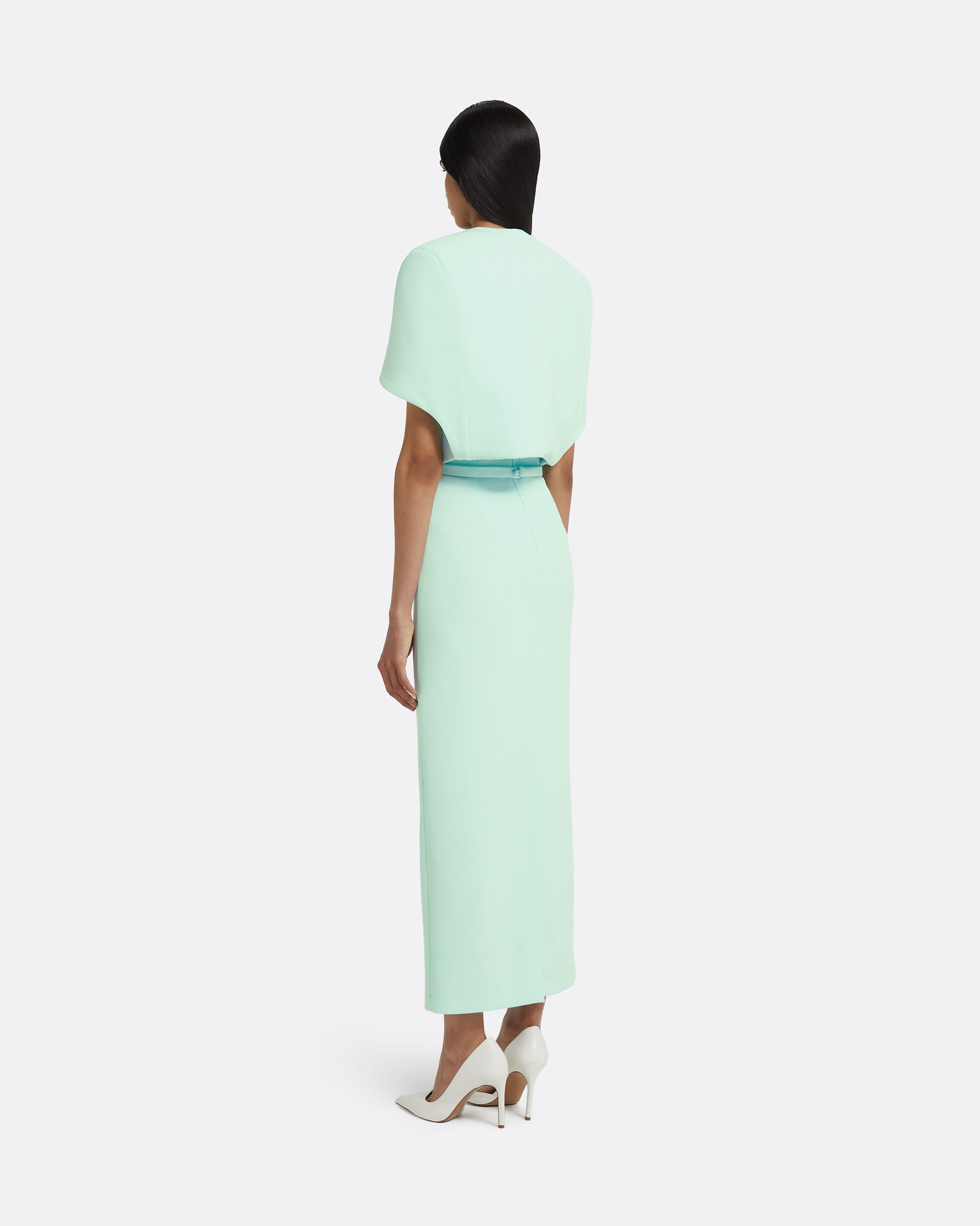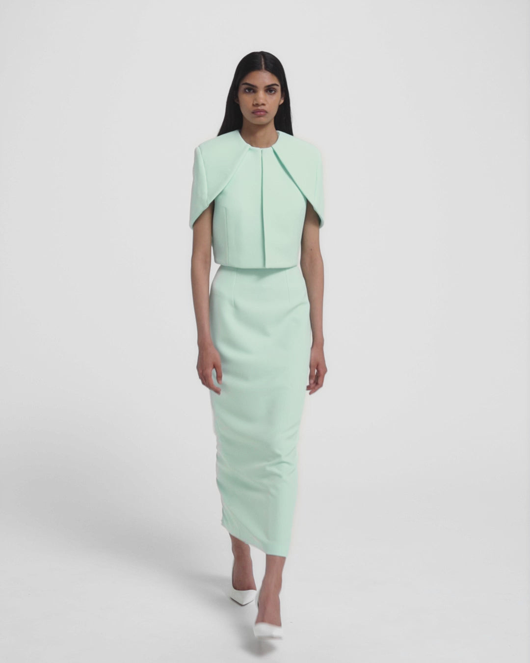 From the Resort ’26 collection, the Micah cape in frost reinterprets classic tailoring with sculptural clarity. Cropped at the waist and precisely folded at the shoulders, its curved lines and clean closure bring quiet drama to day or evening looks.