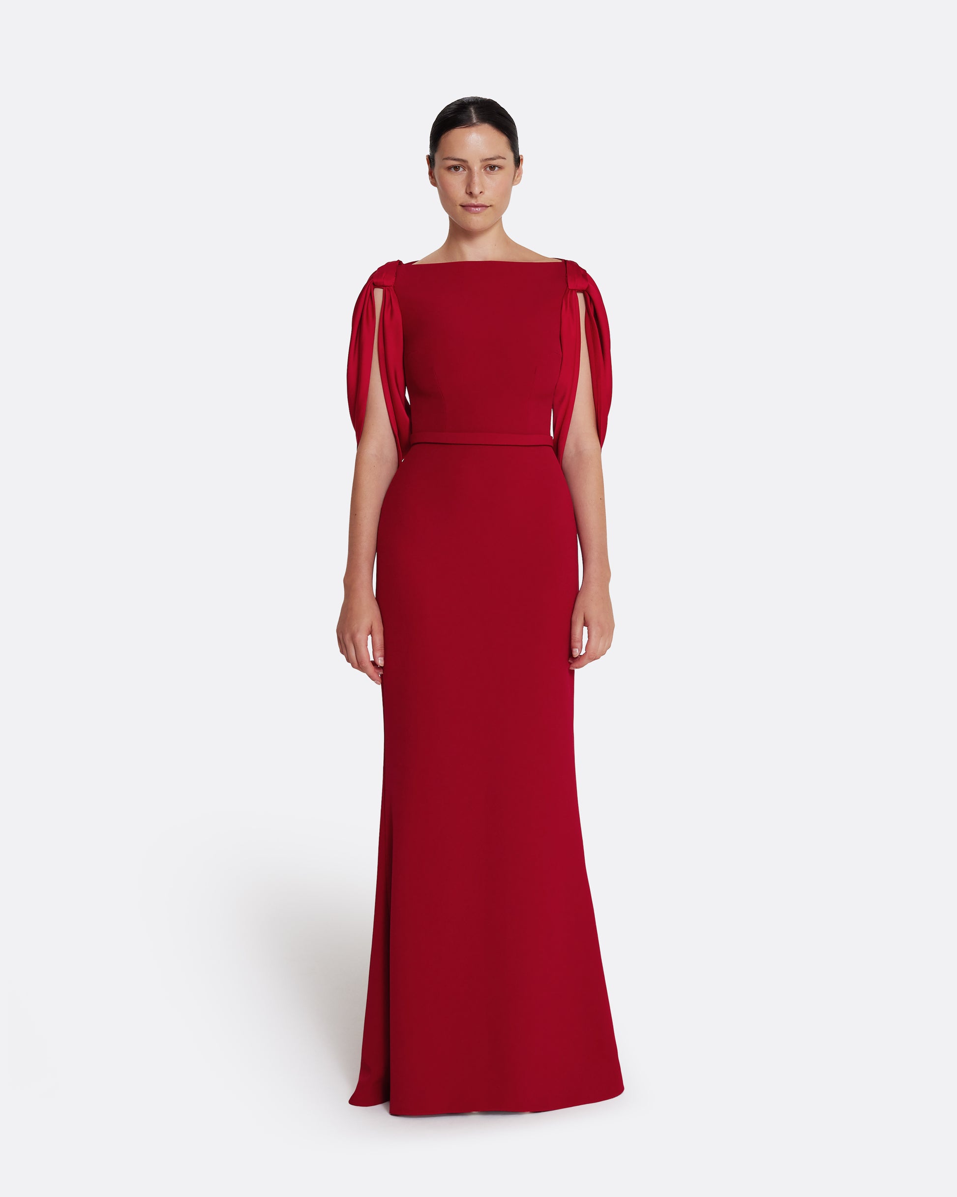 From the Spring Summer ’26 collection, the Mimi Dress in cherry red on azalea red with multi-blues reimagines clean lines with softened structure. Tied strap sleeves bring contrast to the squared neckline, while the tonal Jonia belt defines the waist and balances the flared hem.