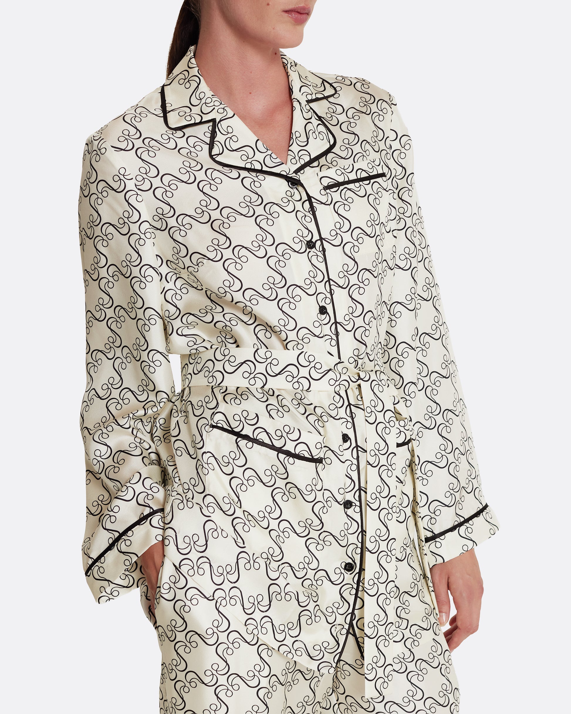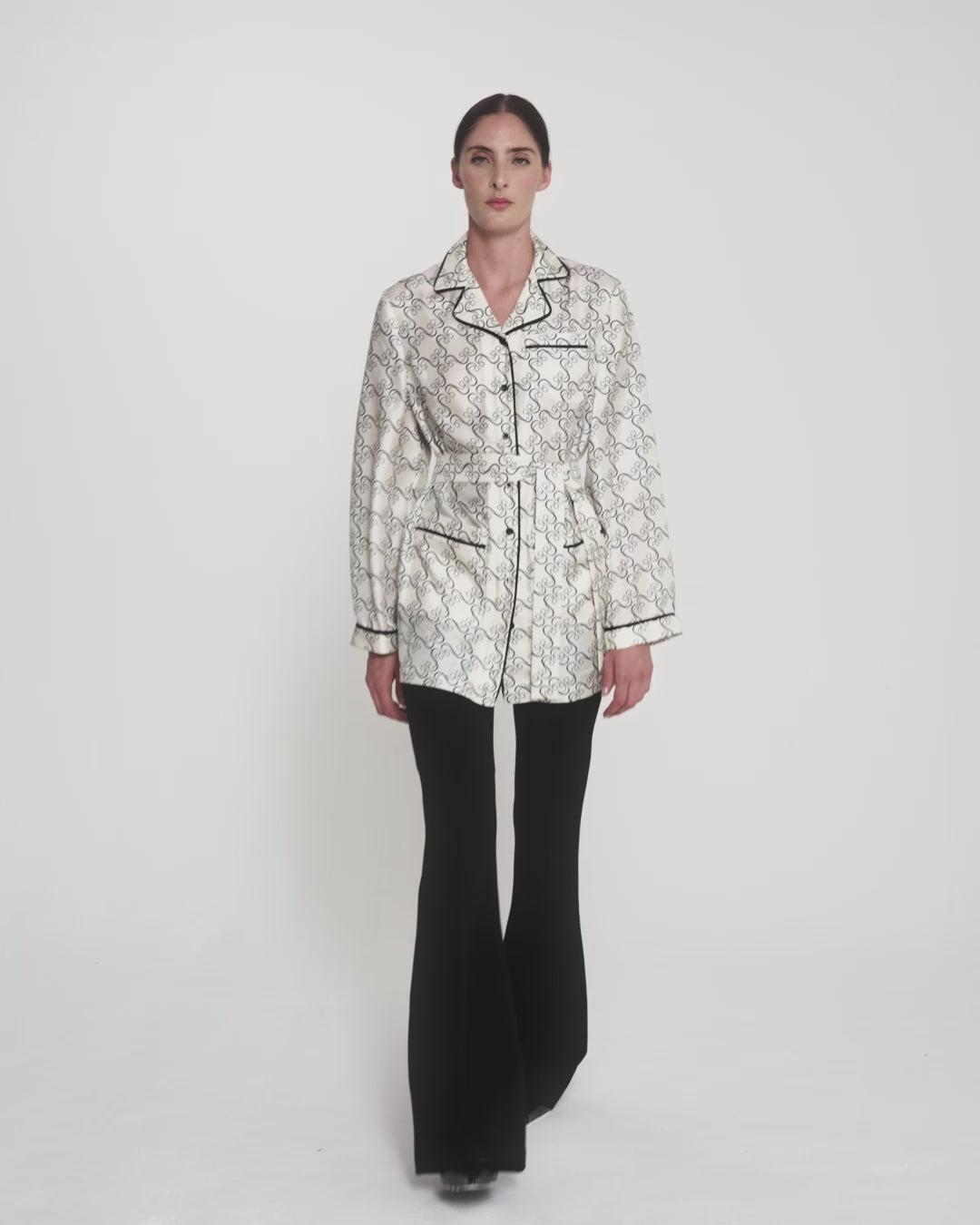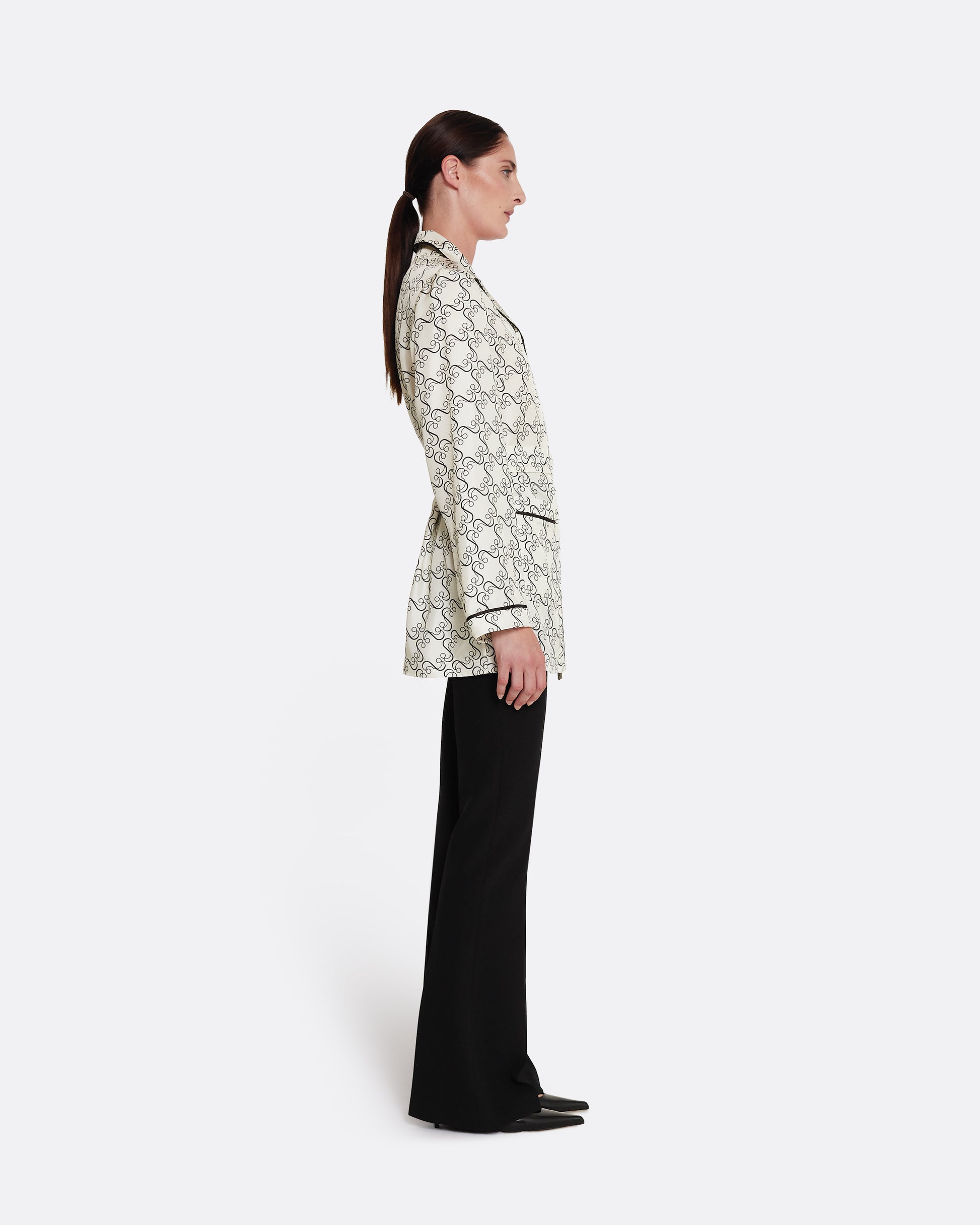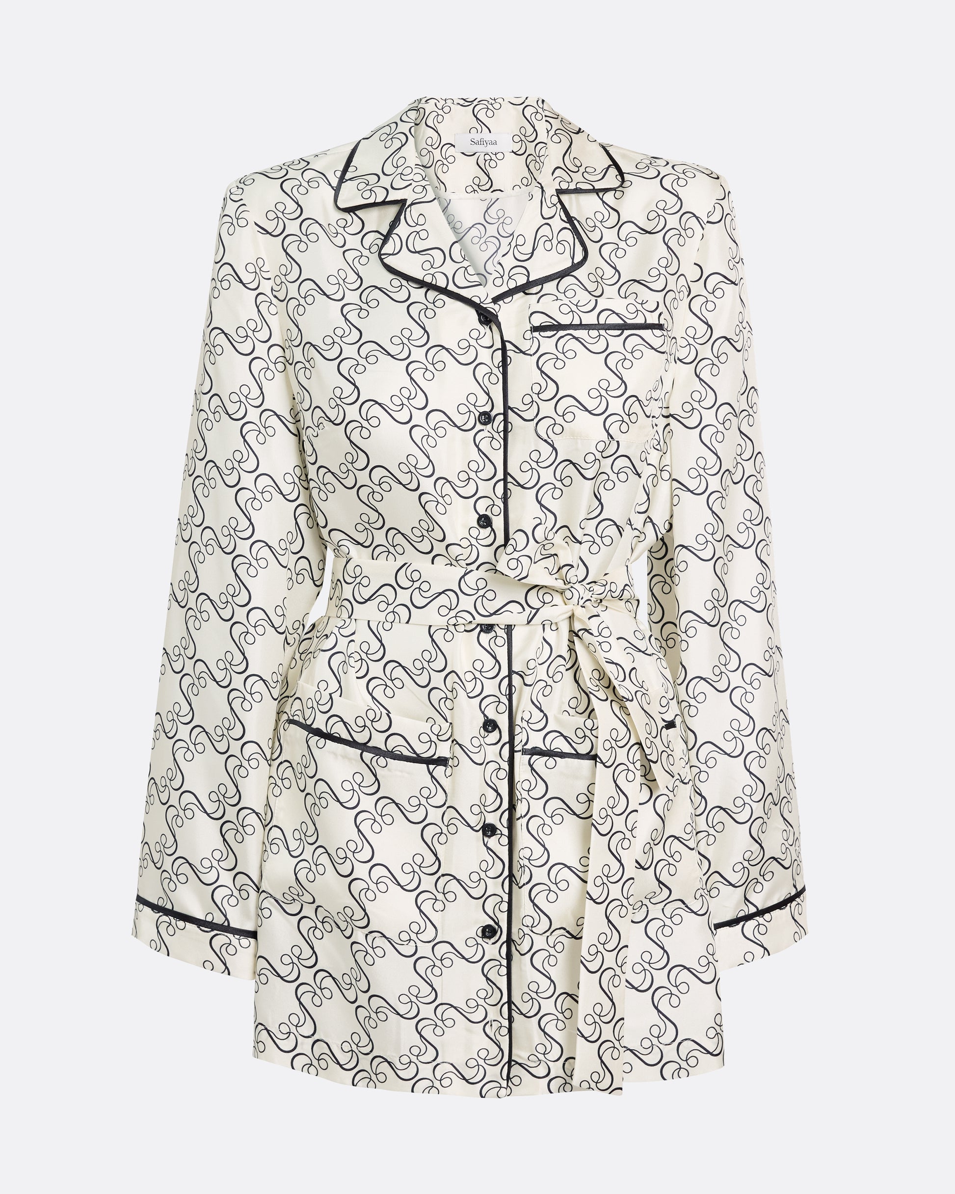 From the Spring Summer ’26 collection, the Mirella Top in black on ecru introduces a graphic note through contrast and pattern. The design is precise and composed, offering a structured yet wearable statement.
