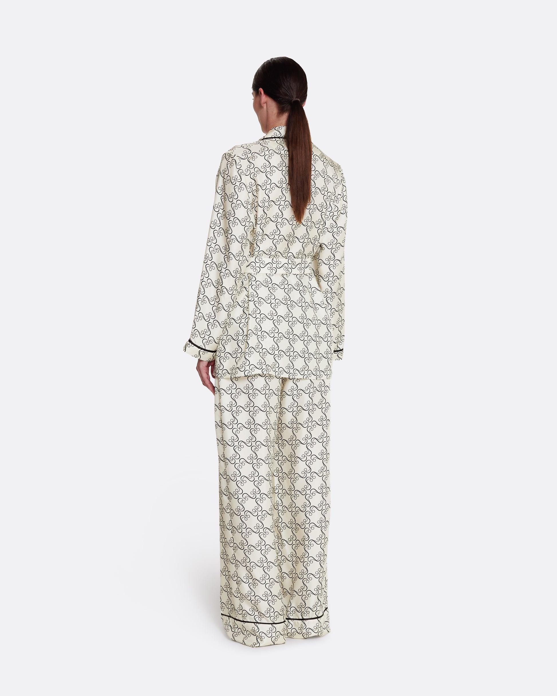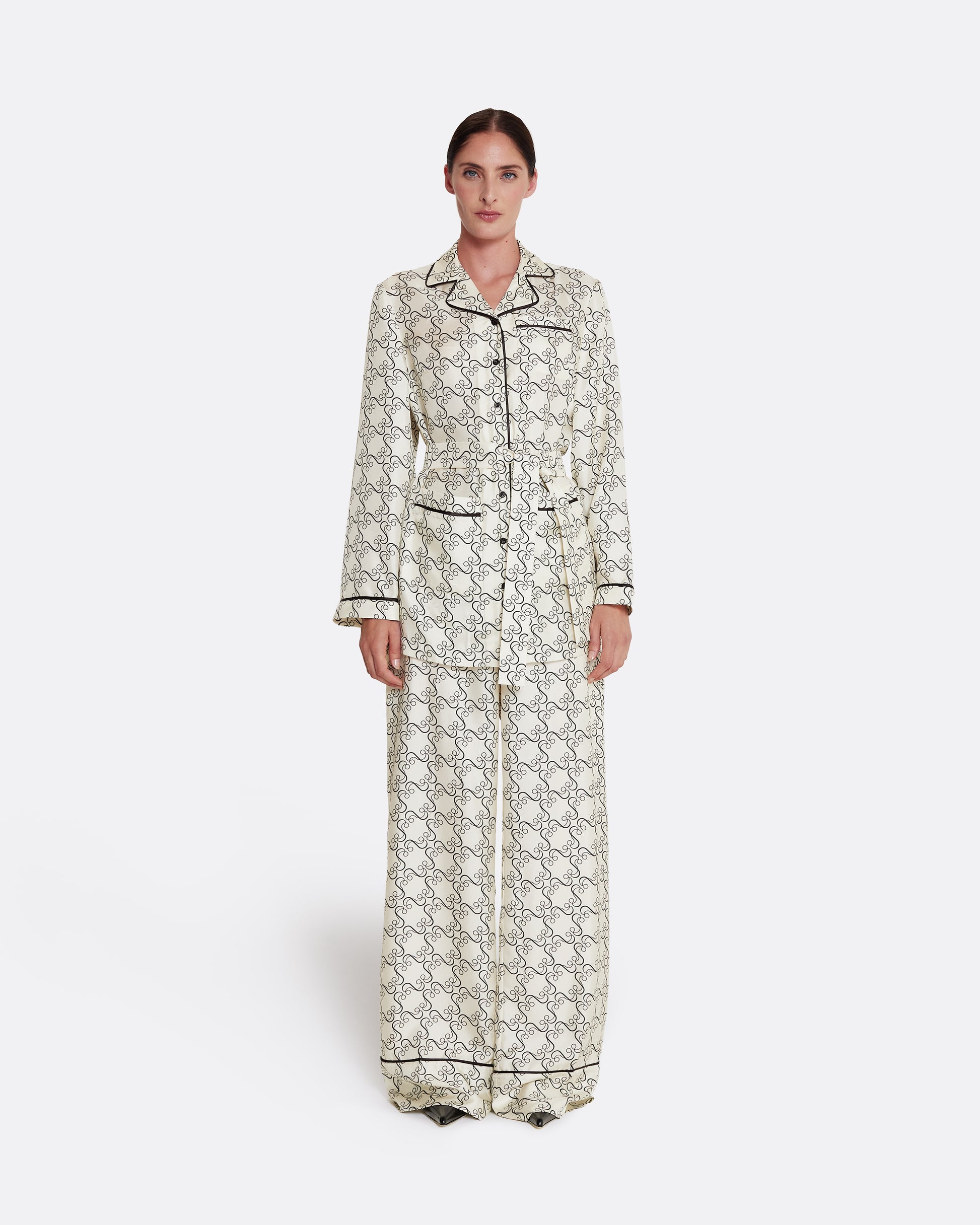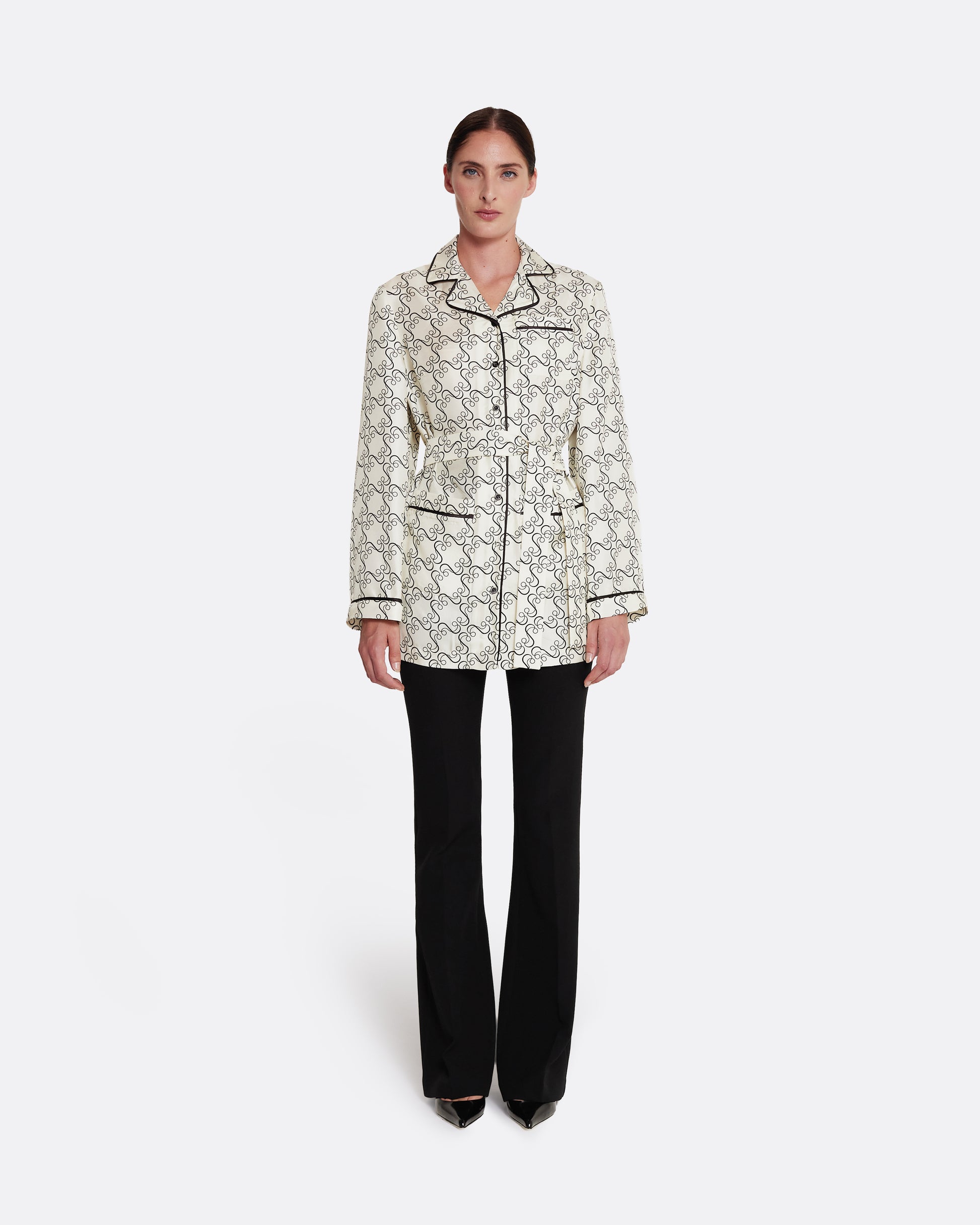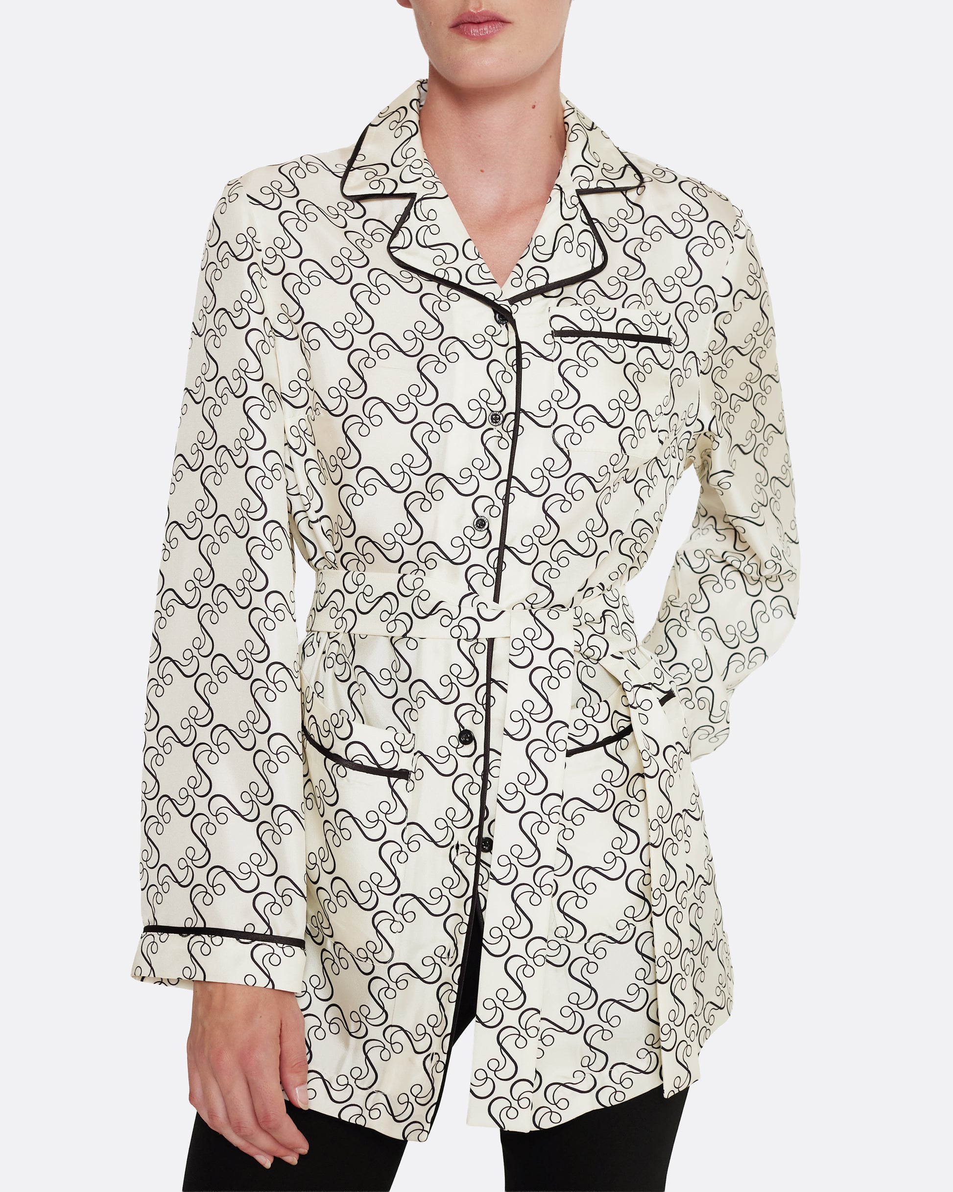 From the Spring Summer ’26 collection, the Mirella Top in black on ecru introduces a graphic note through contrast and pattern. The design is precise and composed, offering a structured yet wearable statement.