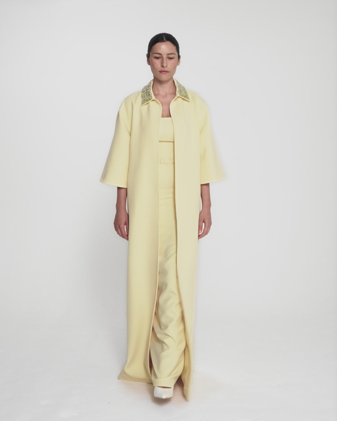 From the Spring Summer ’26 collection, the Ninetta Jacket in pale yellow with gold takes a bold, architectural stance. Designed to be worn open, it offers a clean vertical line that contrasts with the sculpted collar and soft gleam of embellishment.