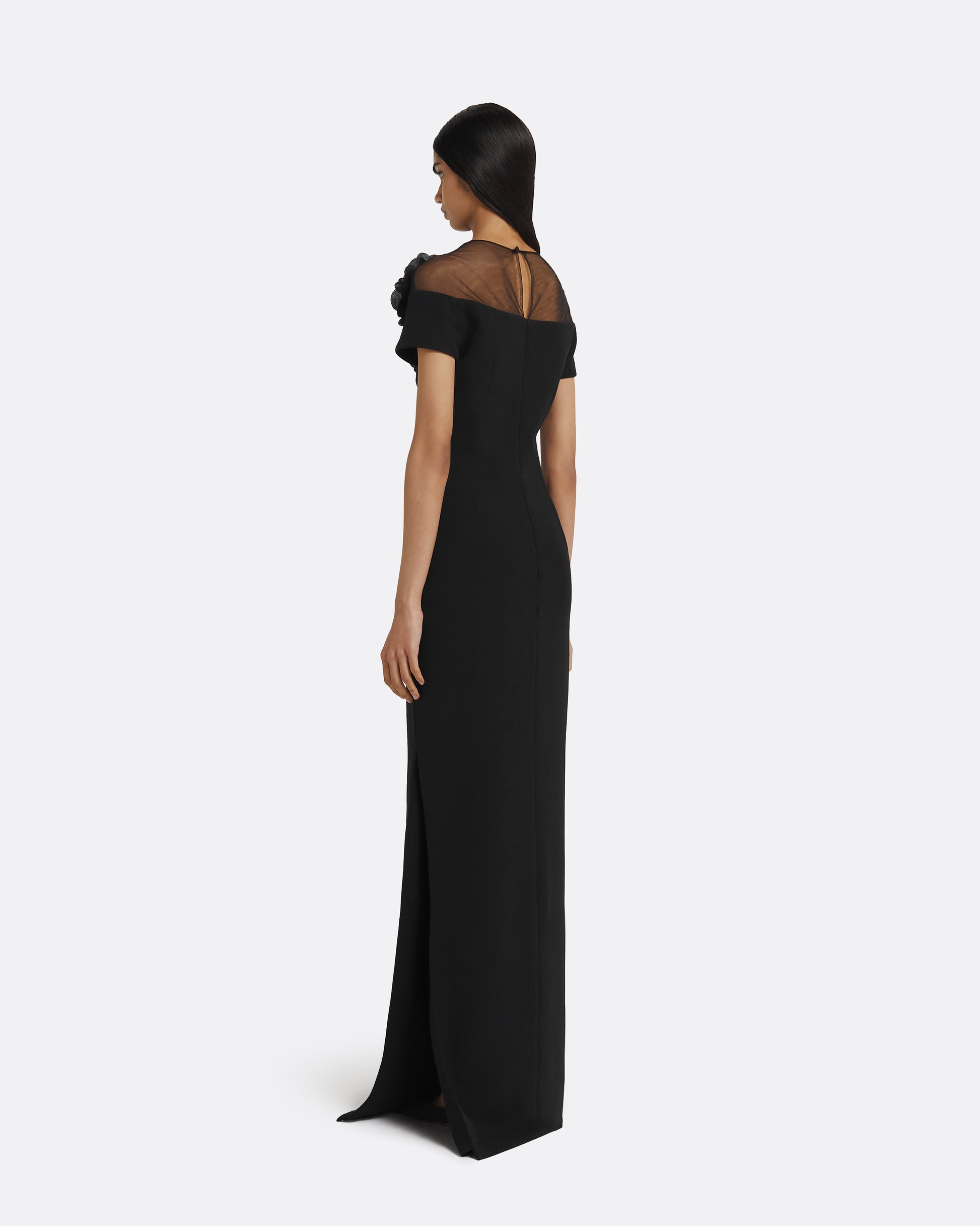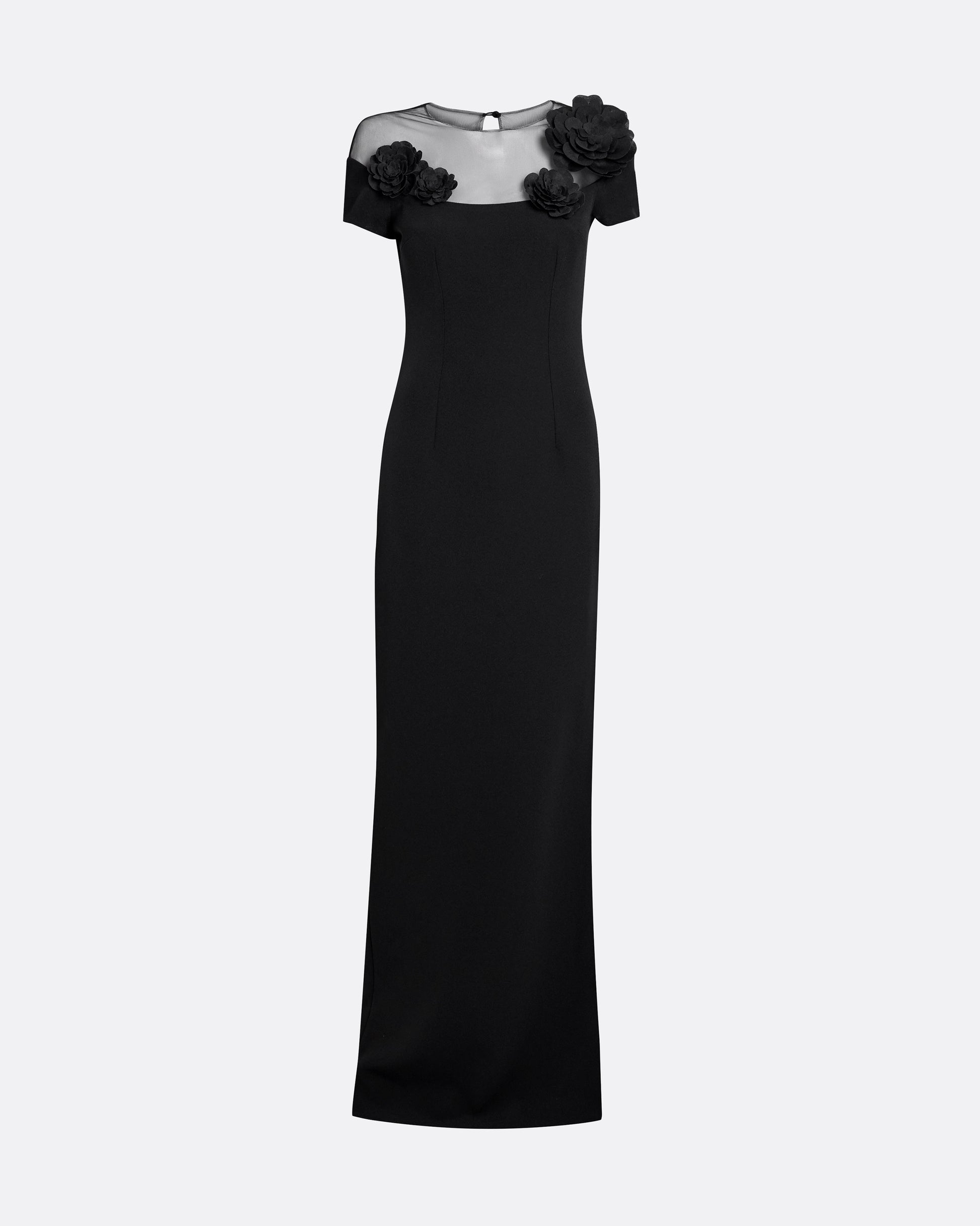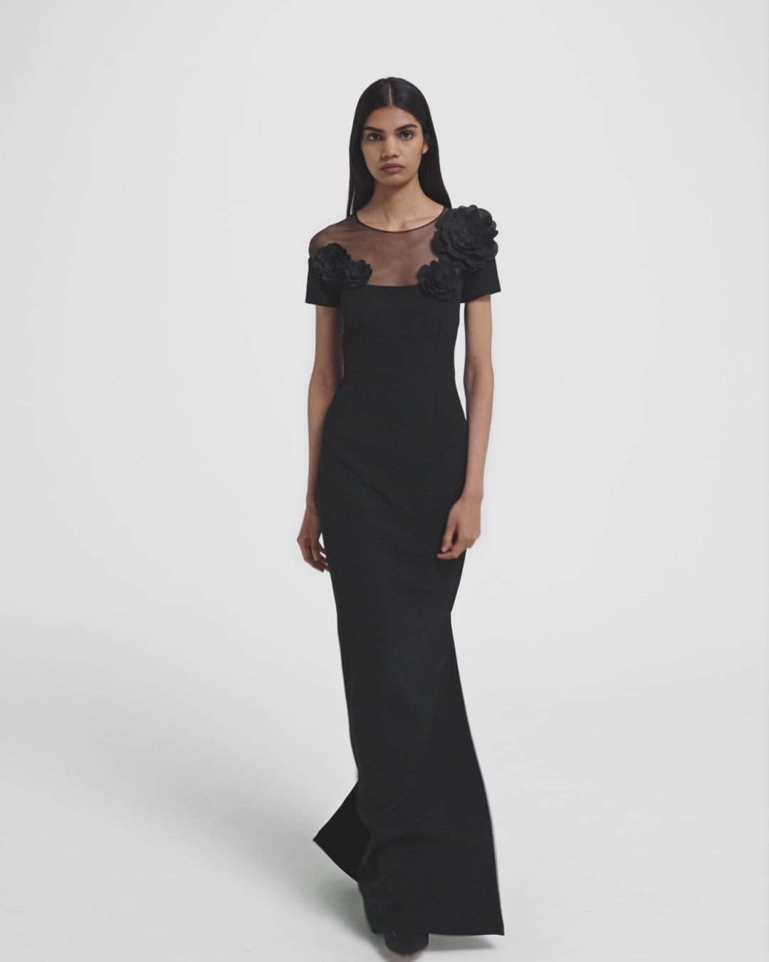 From the Resort ’26 collection, the Noah gown in black explores contrast through transparency and depth. Its illusion construction frames the body with subtle layering, while the round neckline and short sleeves maintain a precise finish.