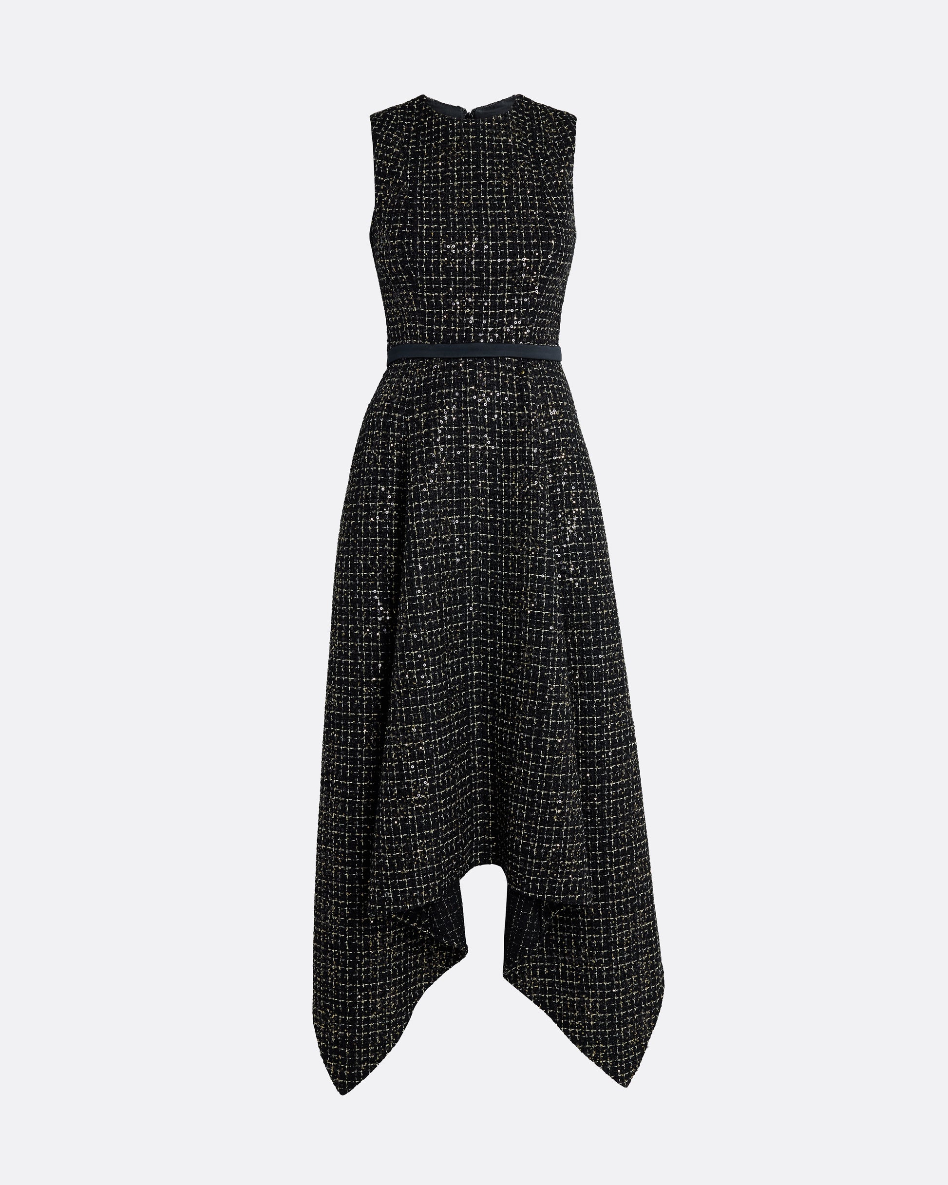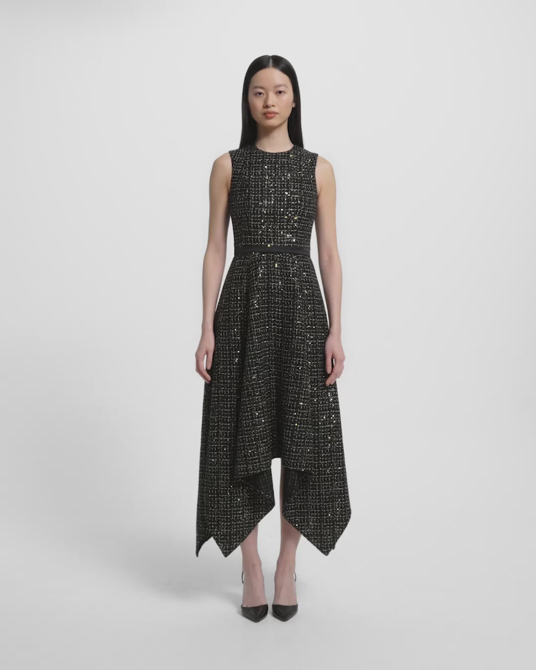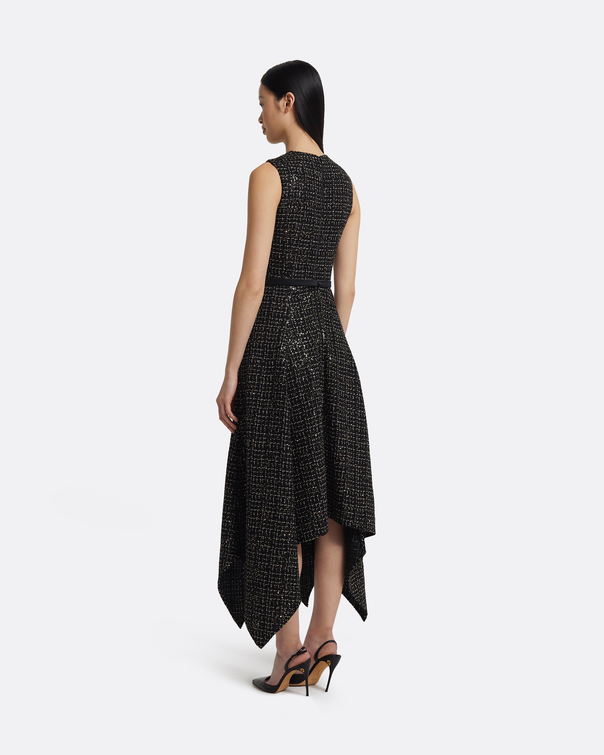From the Autumn Winter '25 collection, the Okimi dress in black on gold explores sculptural contrast. The high-low hem brings a sense of movement to its crisp, sleeveless cut, while layered tones add dimension and richness.