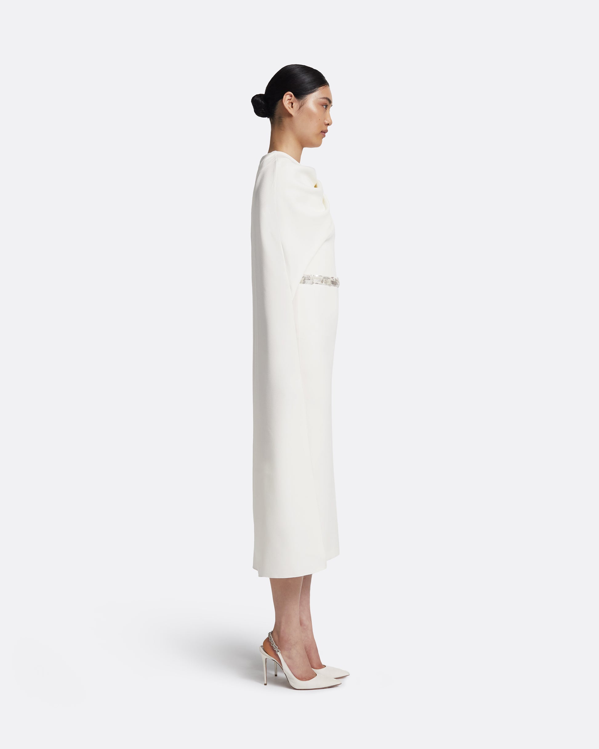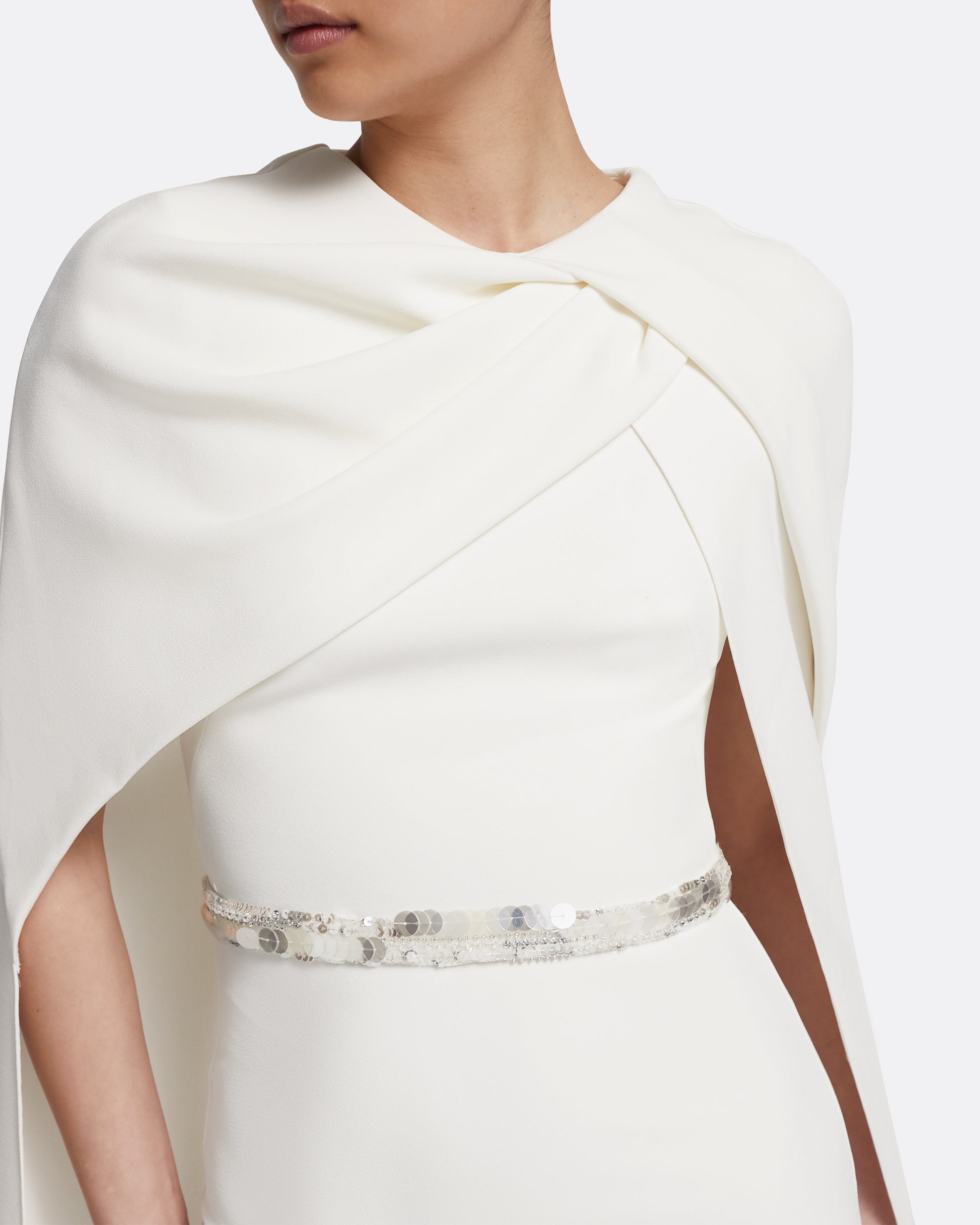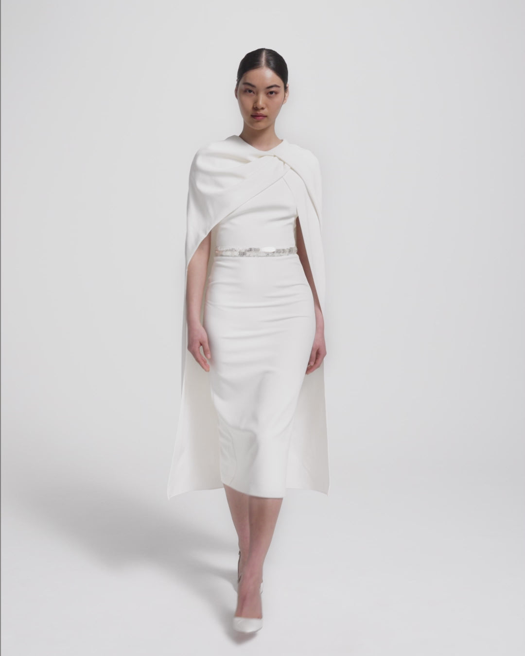 From the Bridal '26 collection, the Oria midi dress in ivory is defined by its pleated asymmetric cape, introducing a sculptural element to its clean, mid-length cut. A refined accent is added at the waist with a crystal-embellished belt.