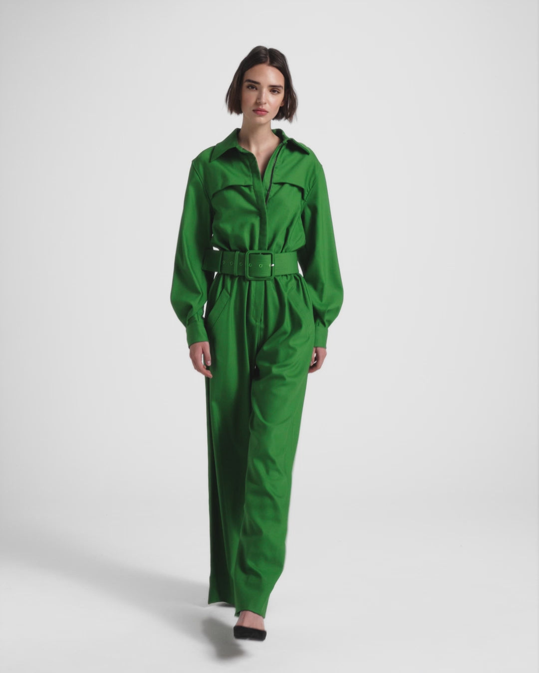 From the Pre-Fall ’26 collection, the Ottilie Jumpsuit in blade green offers a tailored take on the classic boiler suit for day-to-evening dressing. Cut in wool with long sleeves, the structured silhouette is defined by a matching belt that cinches the waist for a clean, refined finish.