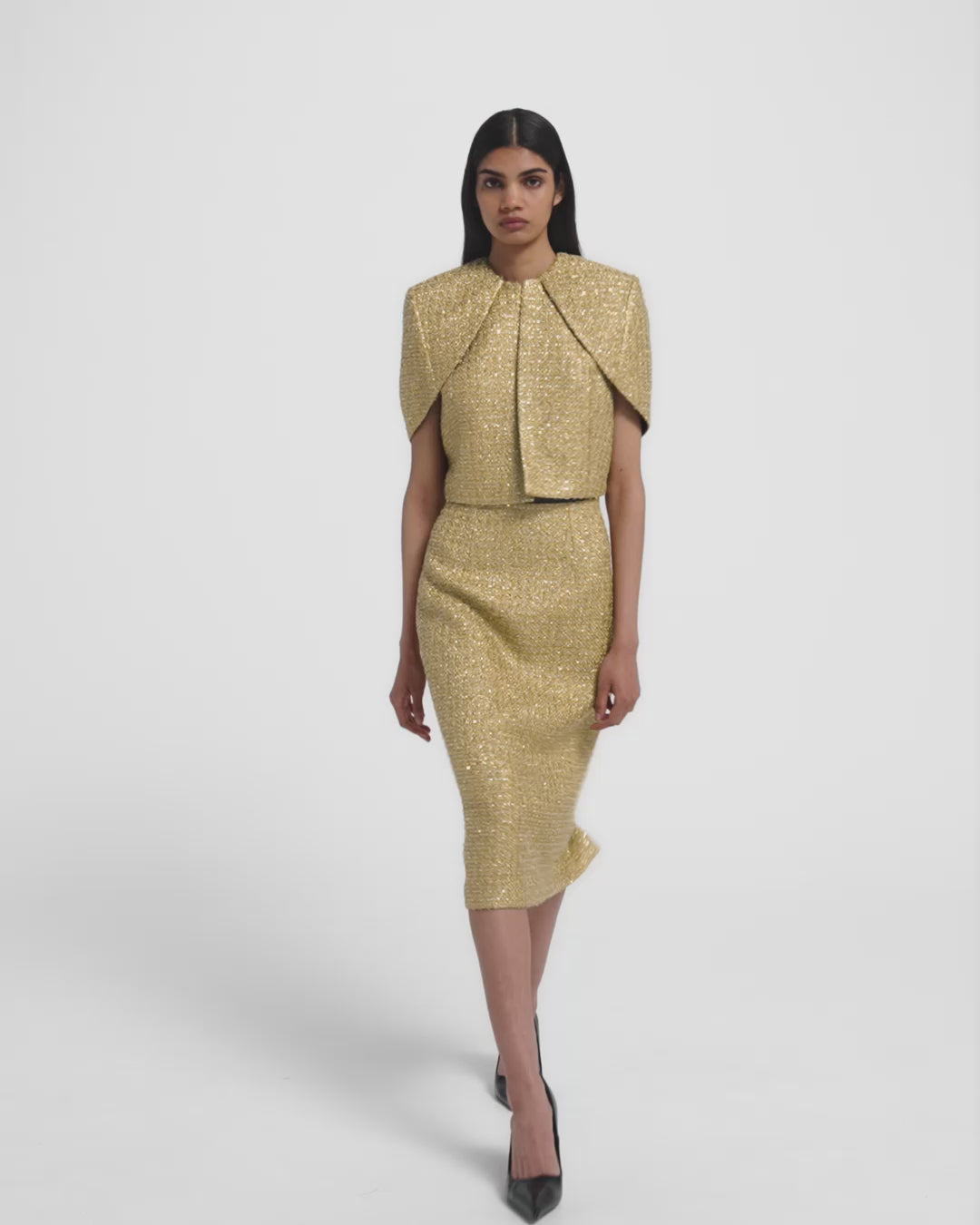 From the Resort ’26 collection, the Palmer cape in yellow gold blends polish with precision. Designed with architectural structure, the cropped shape is anchored by a clean front closure and sculpted shoulders, offering a sharp counterpoint to softer silhouettes.