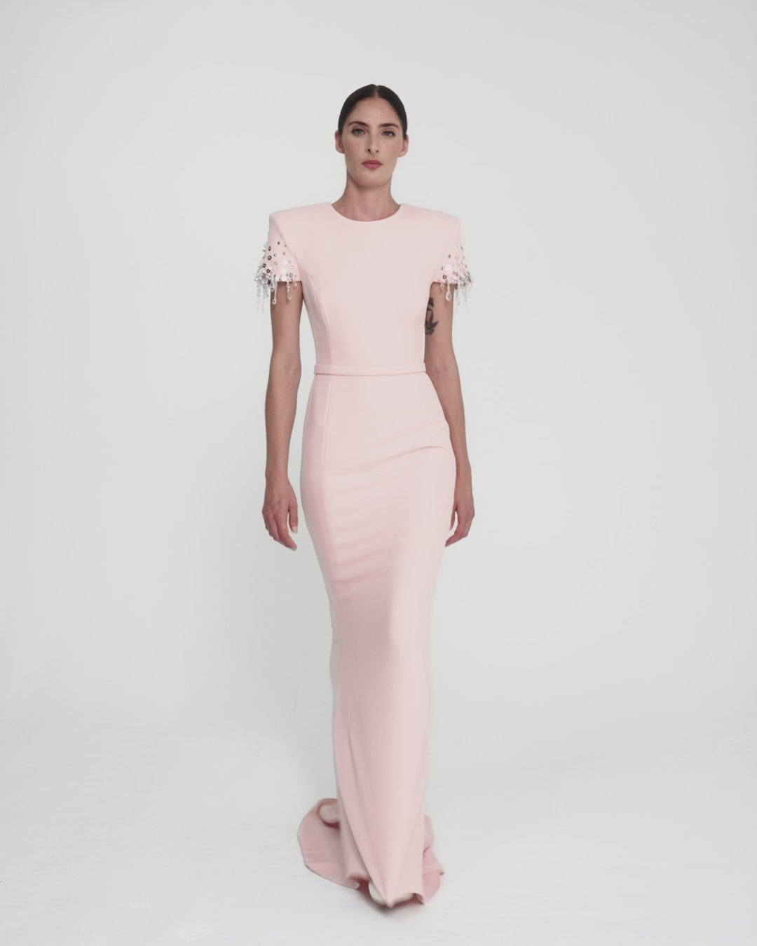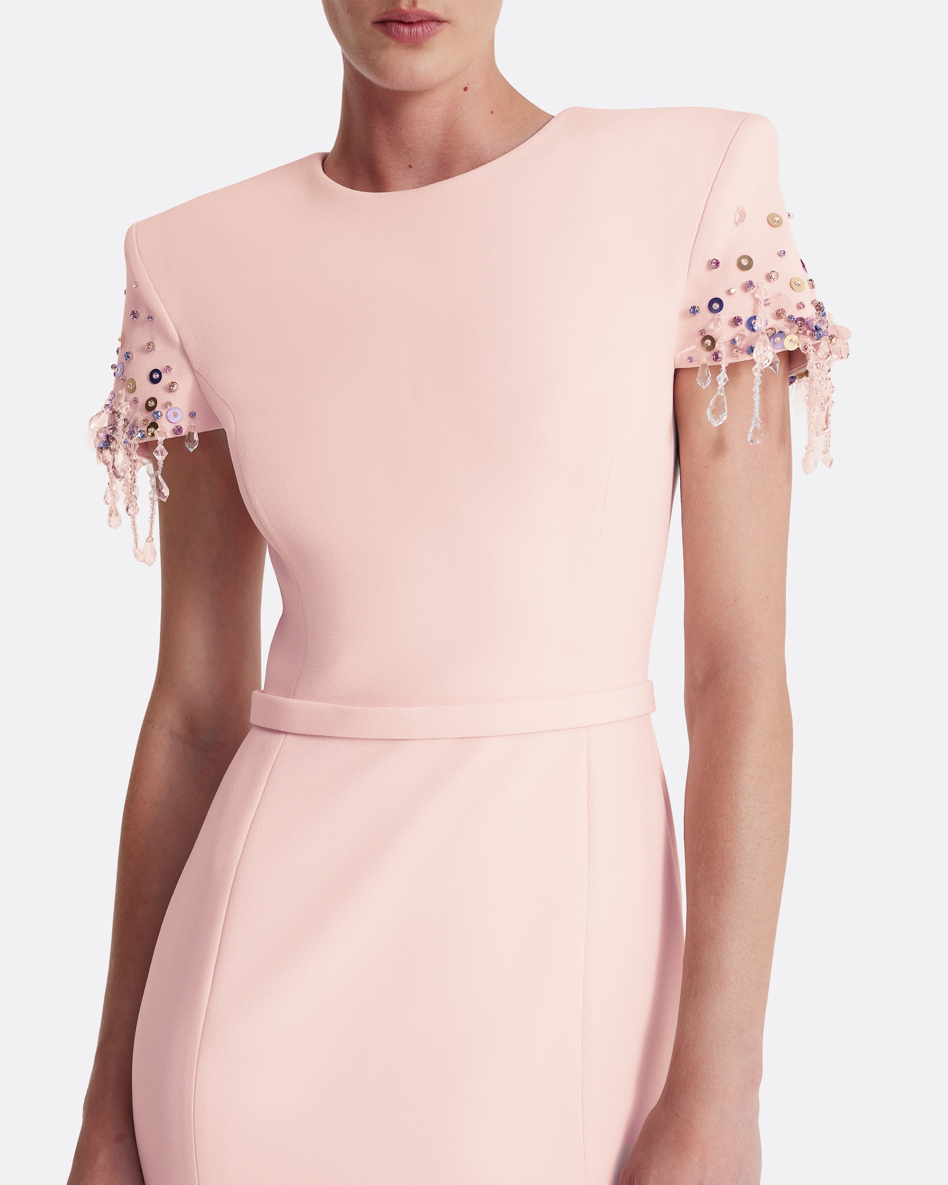 From the Spring Summer ’26 collection, the Parker Long Dress in pale pink is defined by a clean, elongated line and a considered sense of evening structure. A sculpted shoulder is accented with multi-pastel scattered embroidery, while crystals cascade delicately across the shoulder line, introducing subtle luminosity against the soft spring tone.