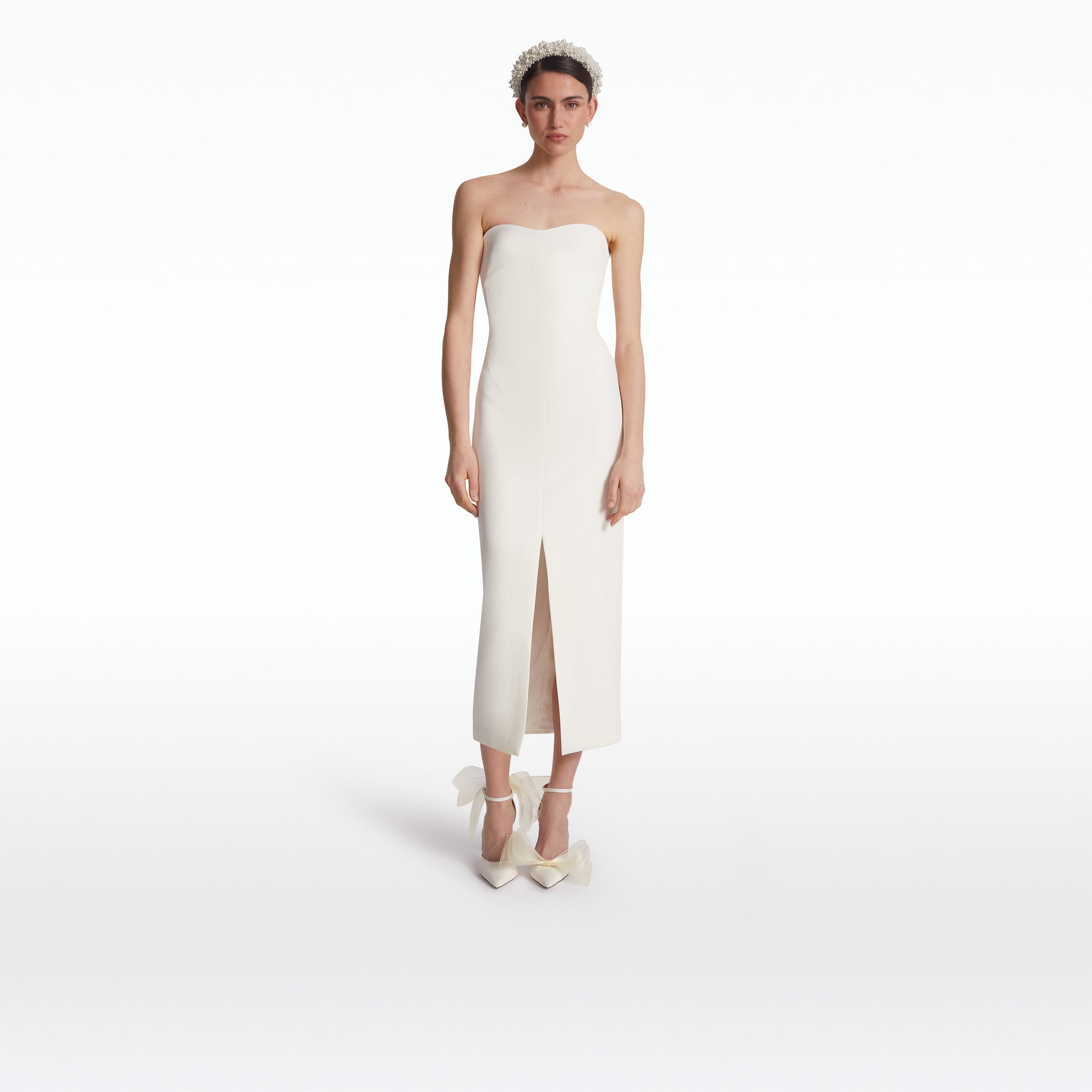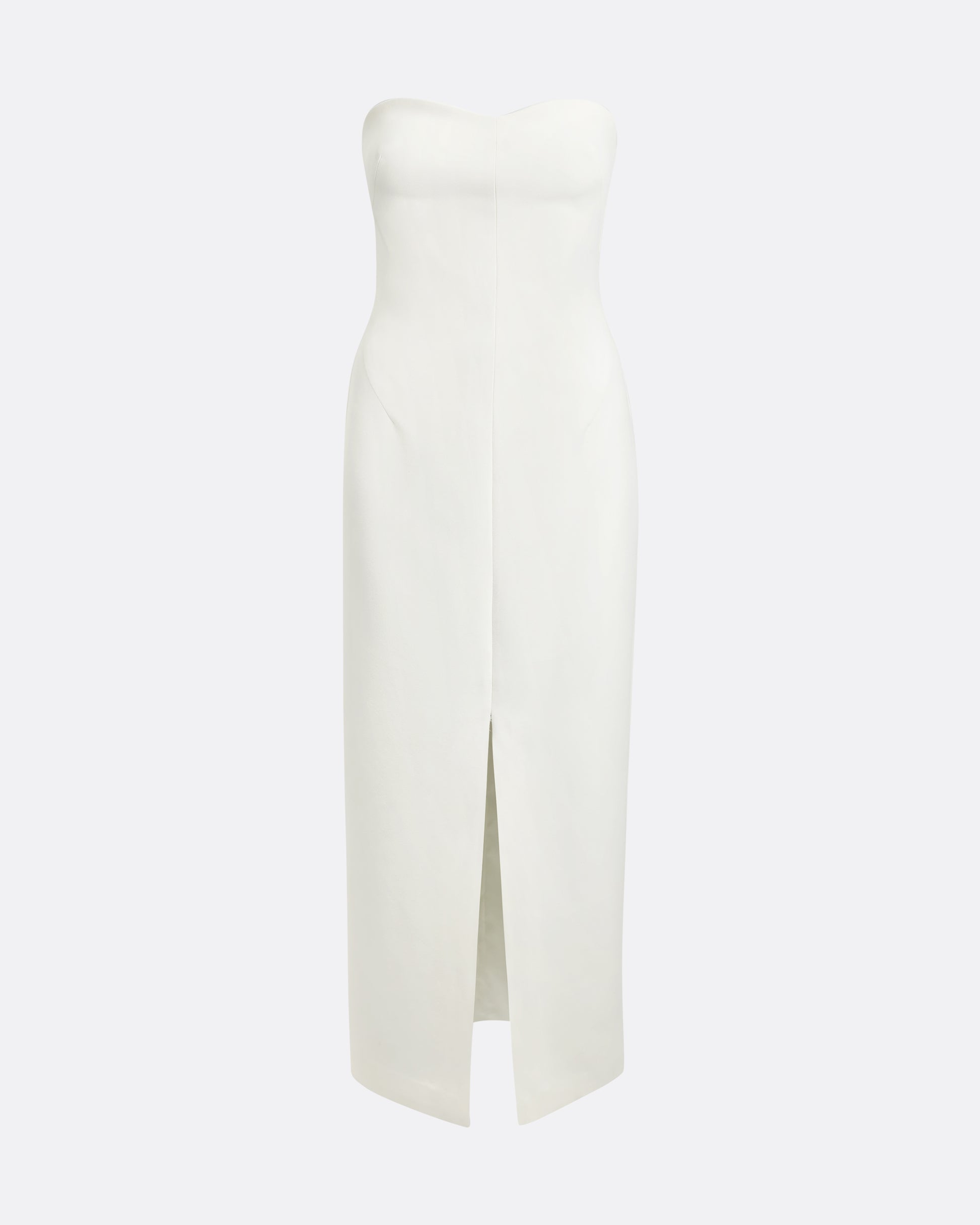 Bustier cocktail dress with centre front split in ivory Heavy Crepe.