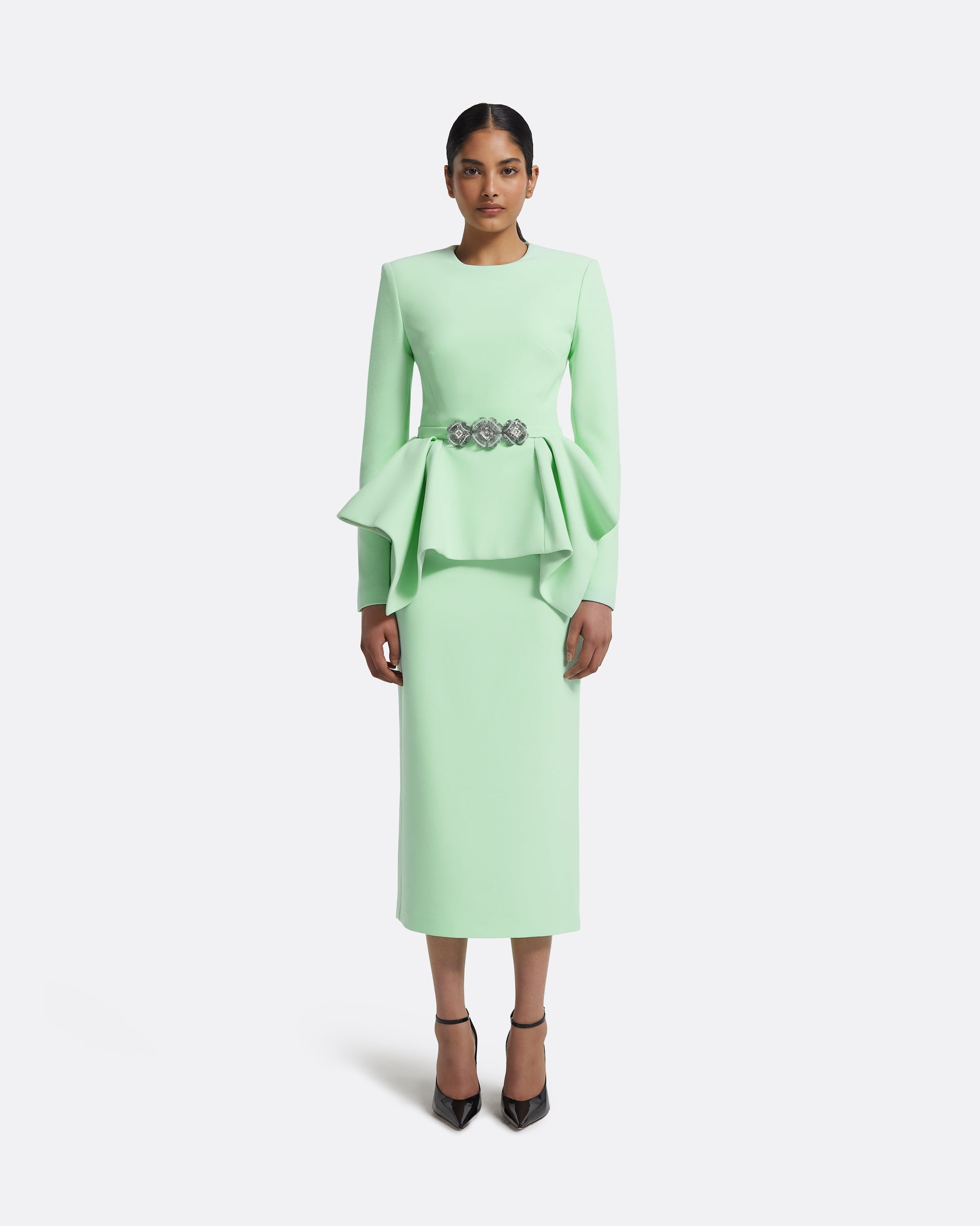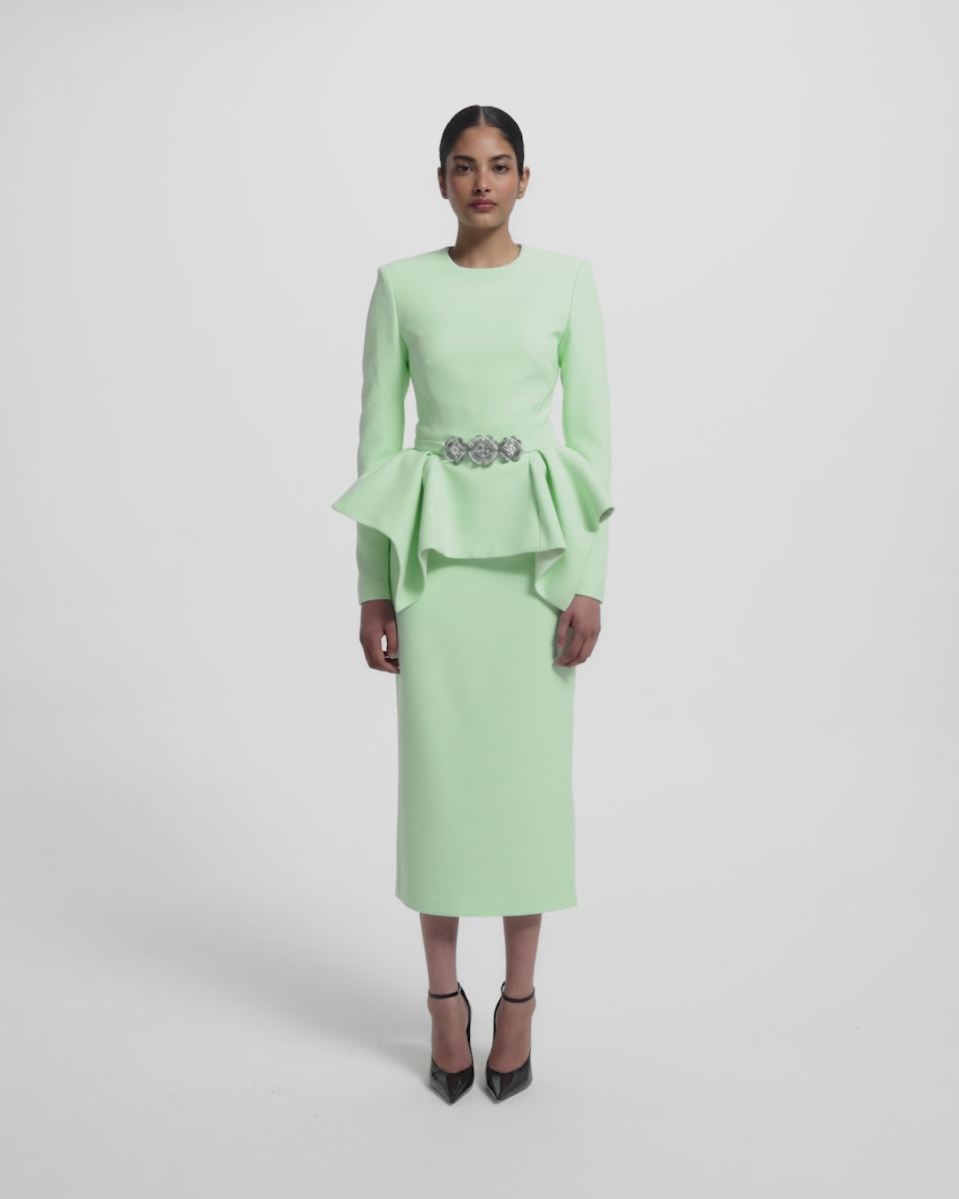 From the Autumn Winter '25 collection, the Pomona skirt in brook green is a study in quiet structure. Its clean, elongated line creates a grounded counterpoint to softer forms.