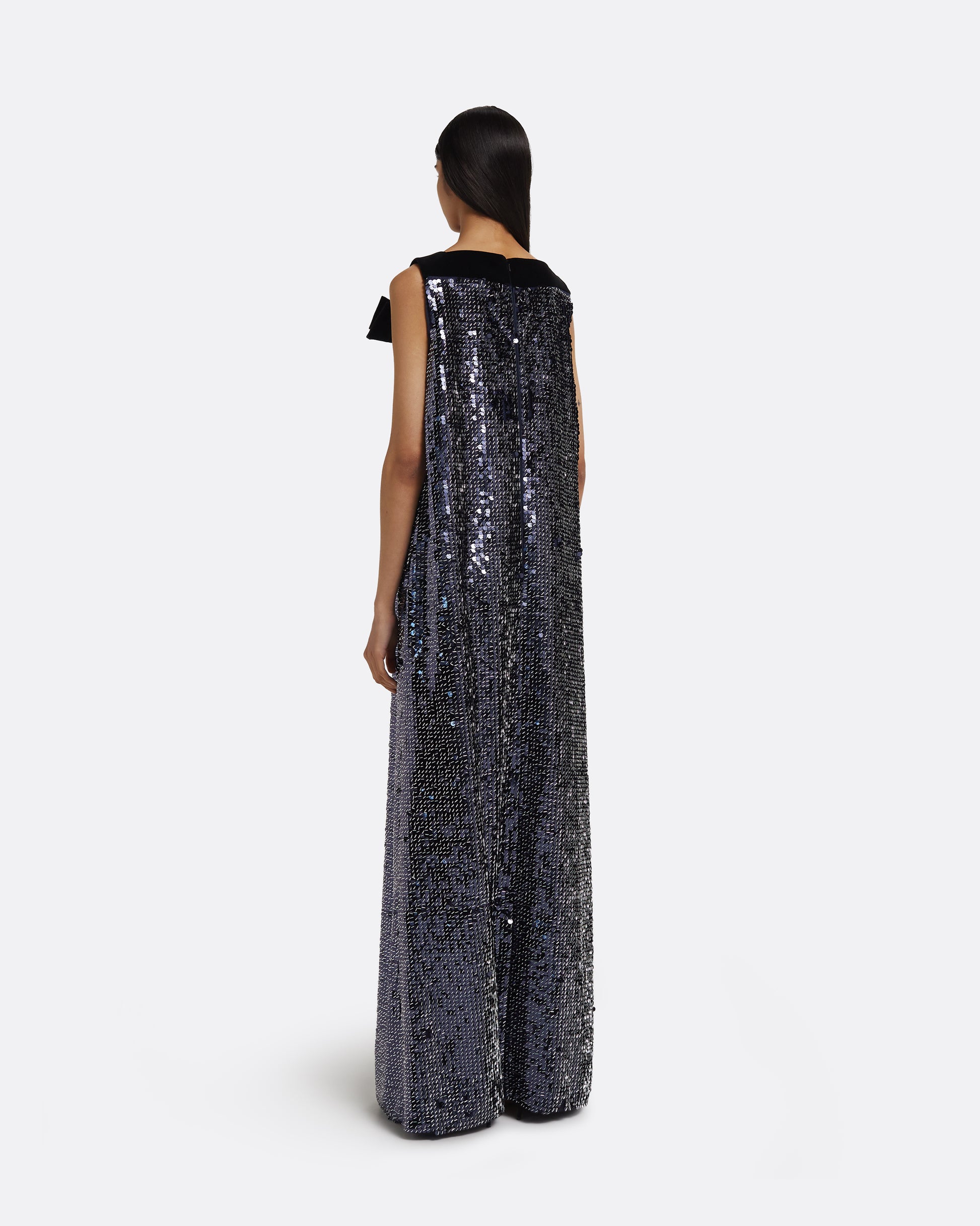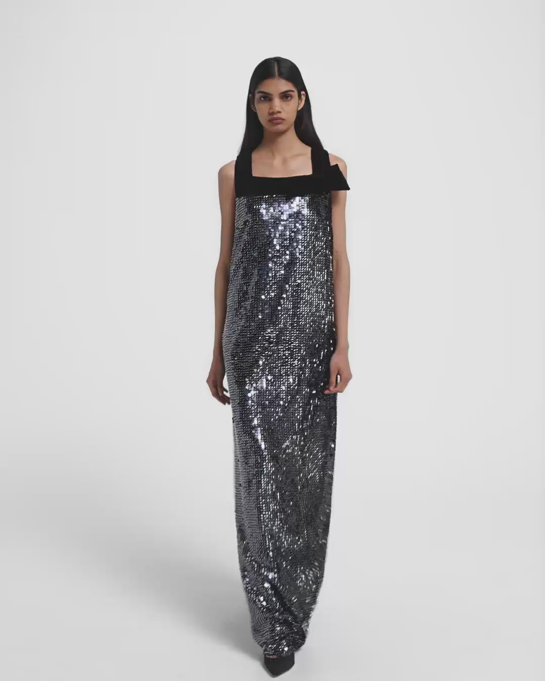 A play of light and line defines the Quincy Dress. Shaped with a square neckline and an easy A-line cut, this floor-length gown balances structure and sparkle. The contrast bow at the shoulder adds a final note of softness to the liquid-like shimmer of the surface.