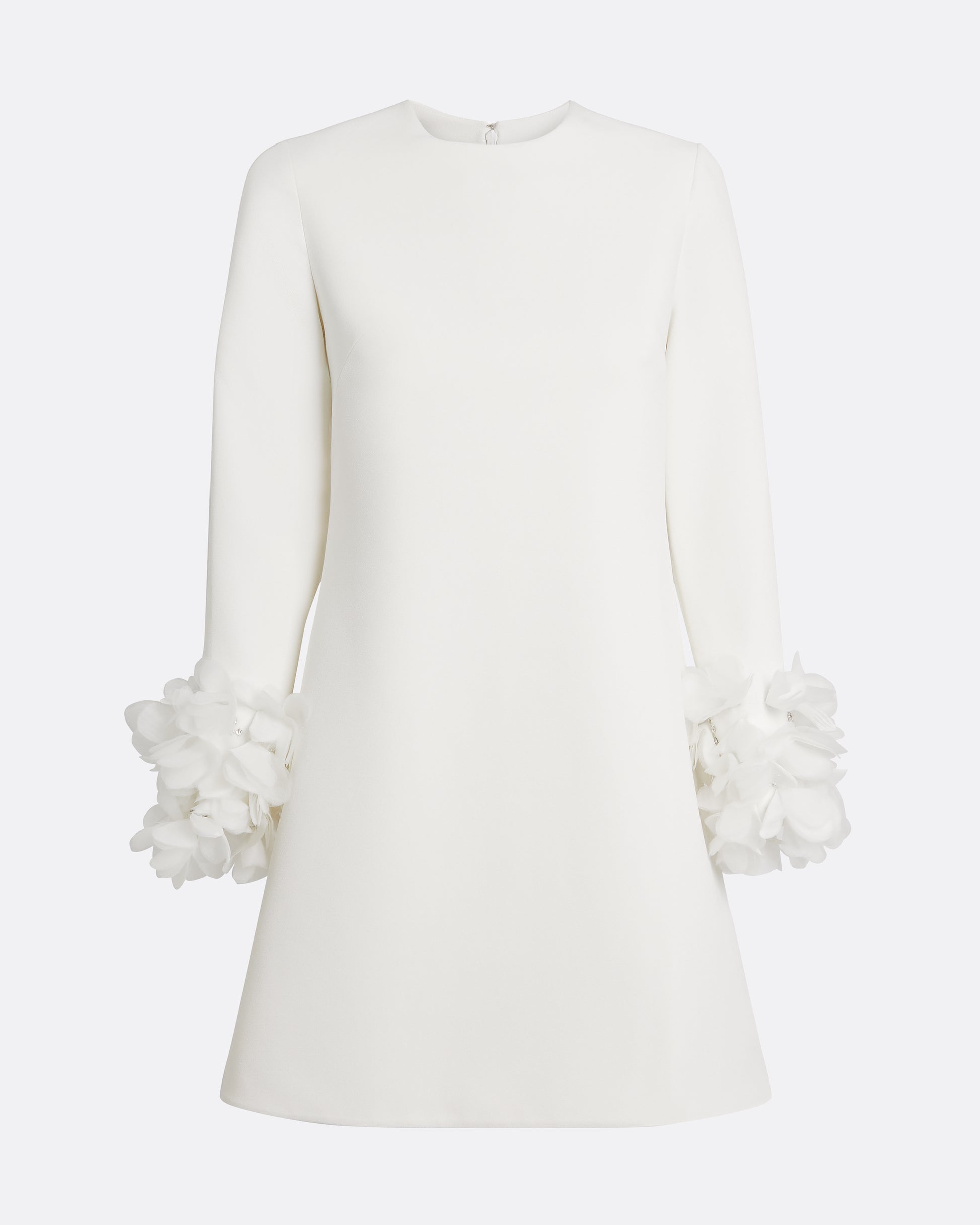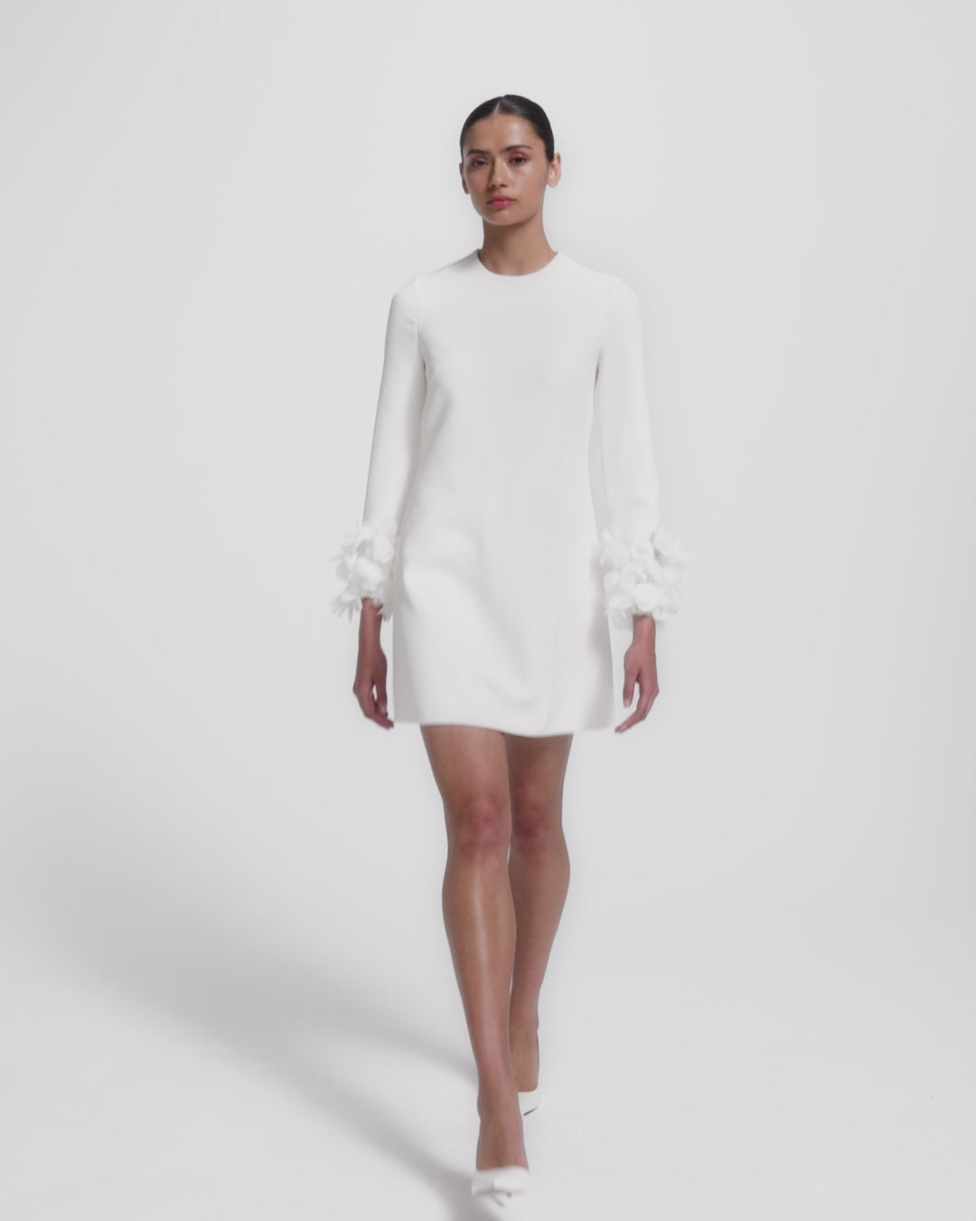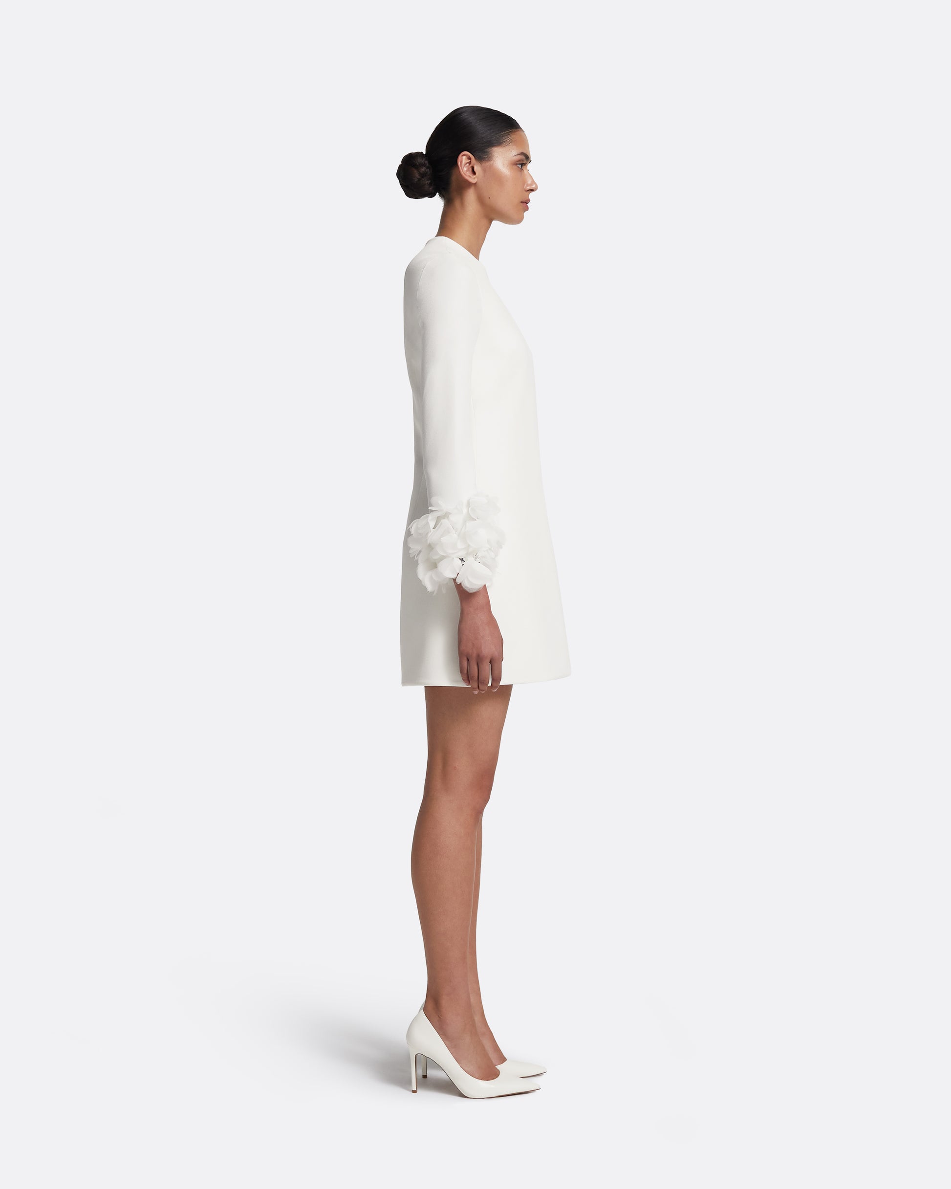 From the Bridal ’26 collection, the Reffie dress in ivory reimagines the mini shift with subtle dimension. Long sleeves are finished with an appliqué trim, introducing a sculptural detail to its clean cut.