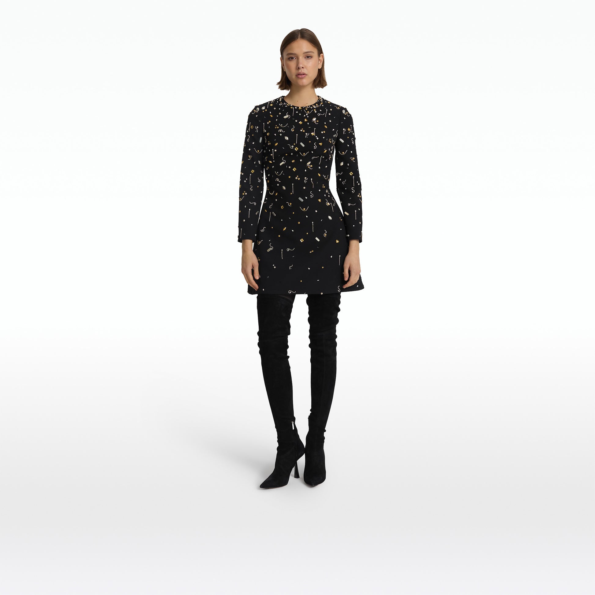 Mini A-line dress with long sleeves in black Heavy Crepe with silver/gold Celestial Scatter embroidery.