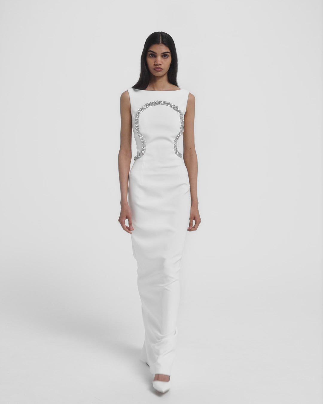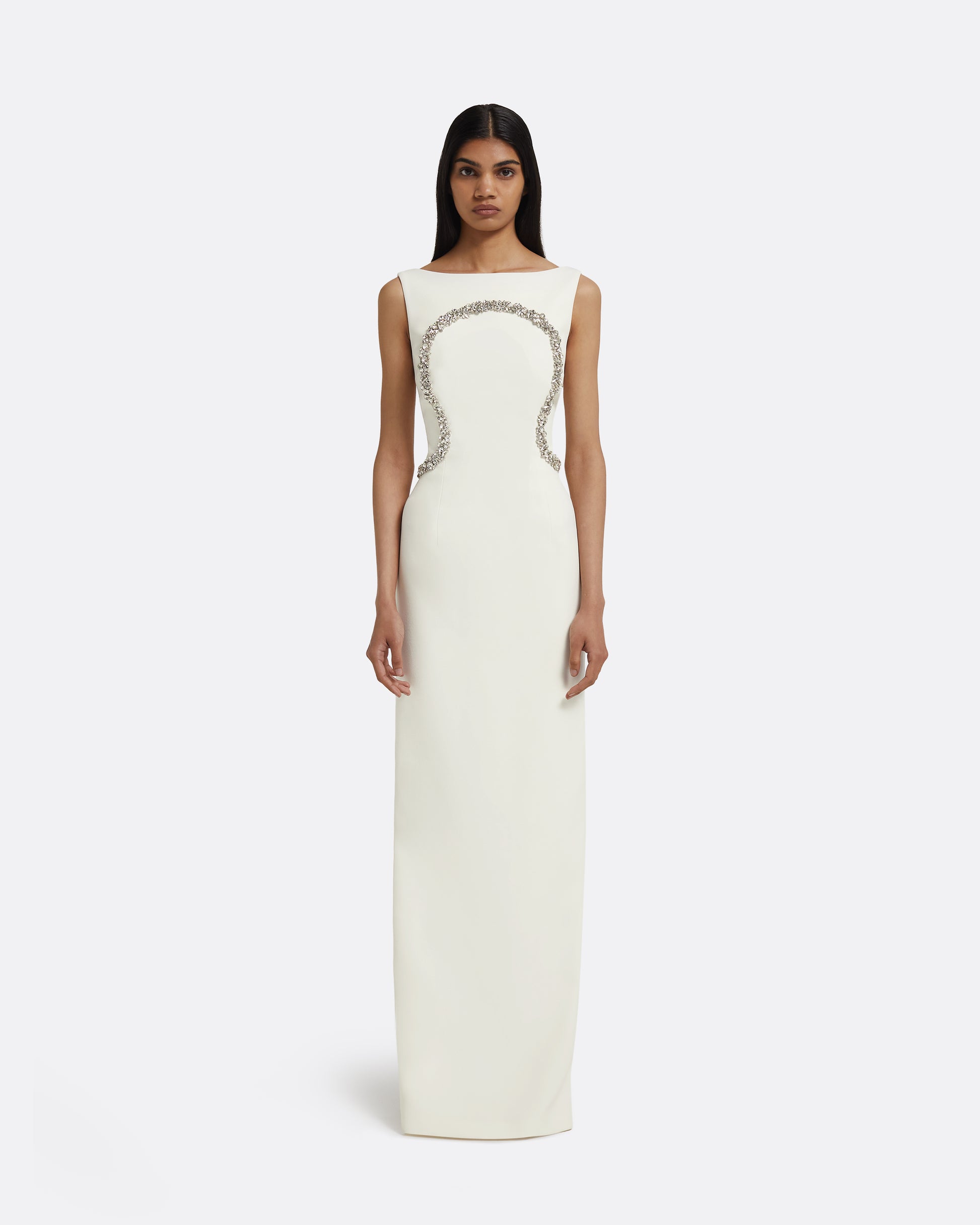 From the Resort '26 collection, the Riley gown in ivory embodies sculpted clarity. Its pared-back design is elevated with a crystalline finish that catches the light with deliberate subtlety.