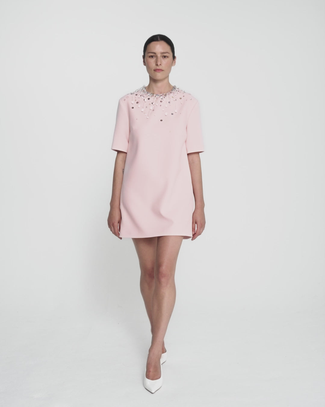 From the Spring Summer ’26 collection, the Ripley Mini Dress in pale pink reimagines the classic T-shirt silhouette as an elevated party dress. Scatter embroidery at the neckline catches the light with subtle brilliance, bringing a refined finish to an otherwise relaxed shape. Effortless yet considered, a dress designed for modern celebrations.