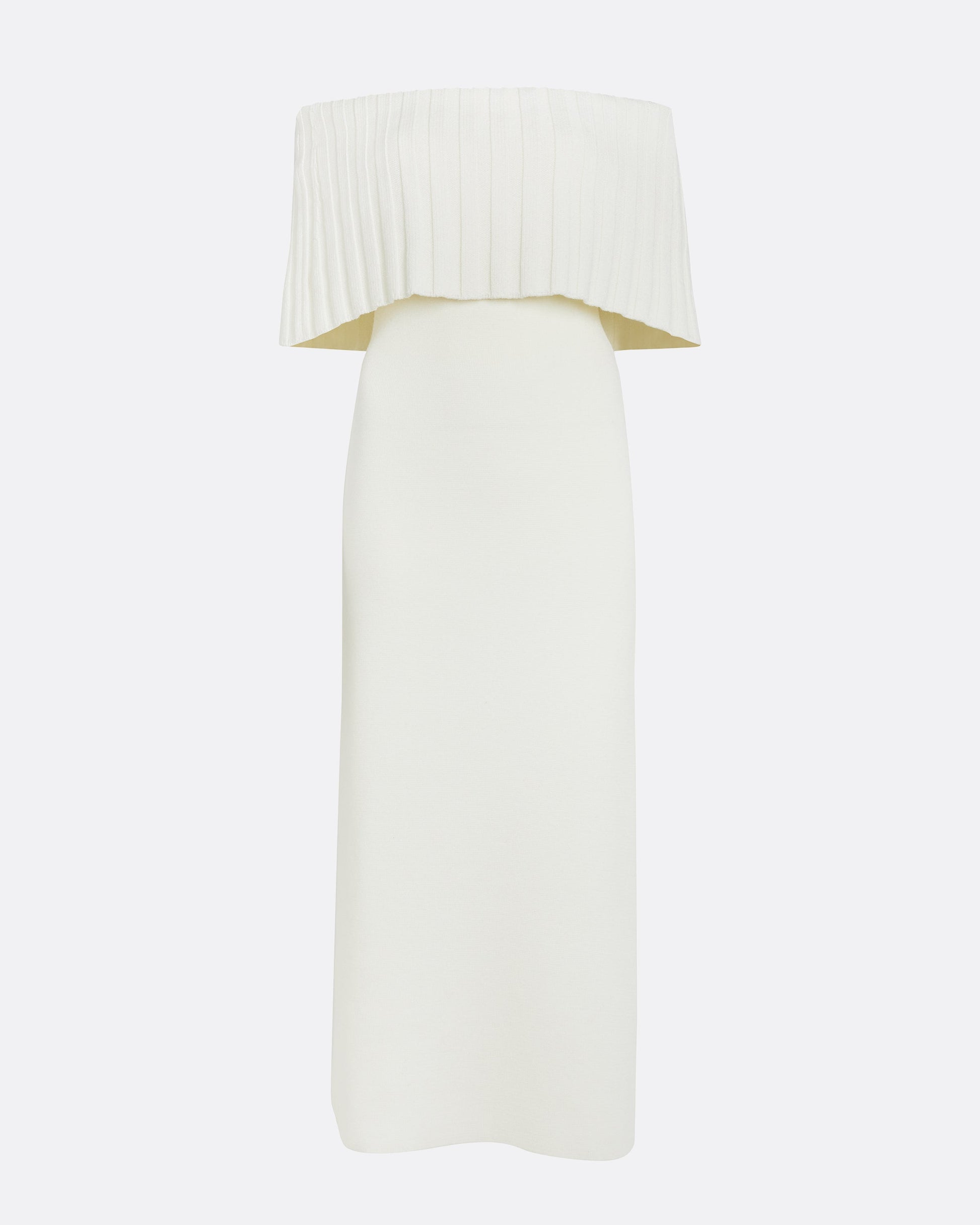 Off the shoulder dress with folded overlay top and flared skirt in ivory.