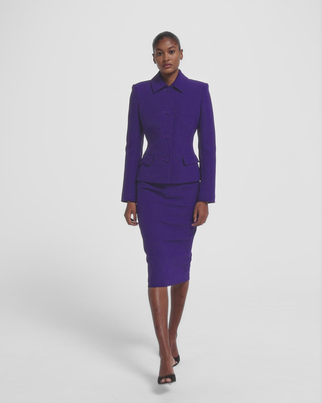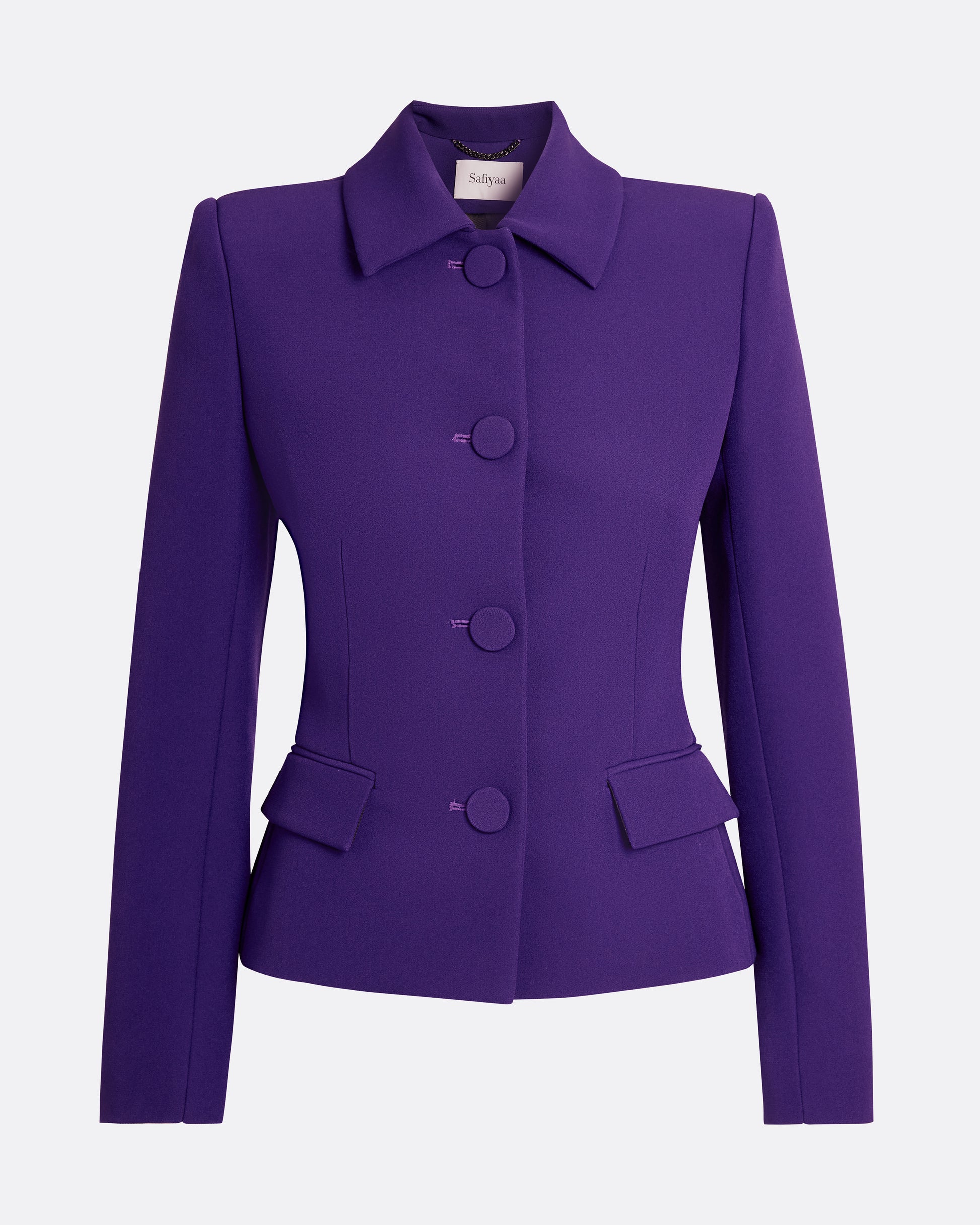 From the Resort ’26 collection, the Robyn jacket in pansy defines a confident line. Its tailored cut and precise finish evoke composure, heightened by the depth of its colour.