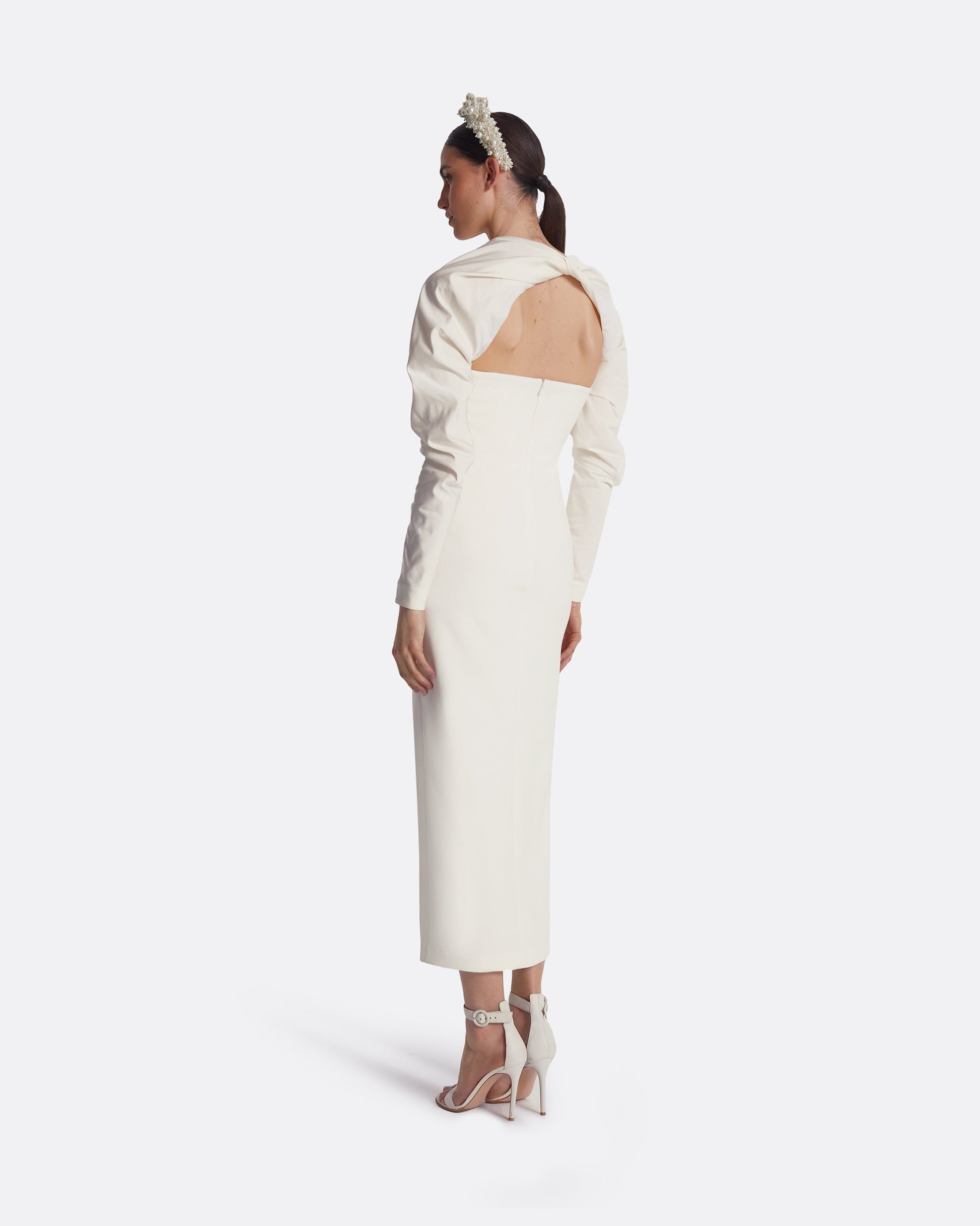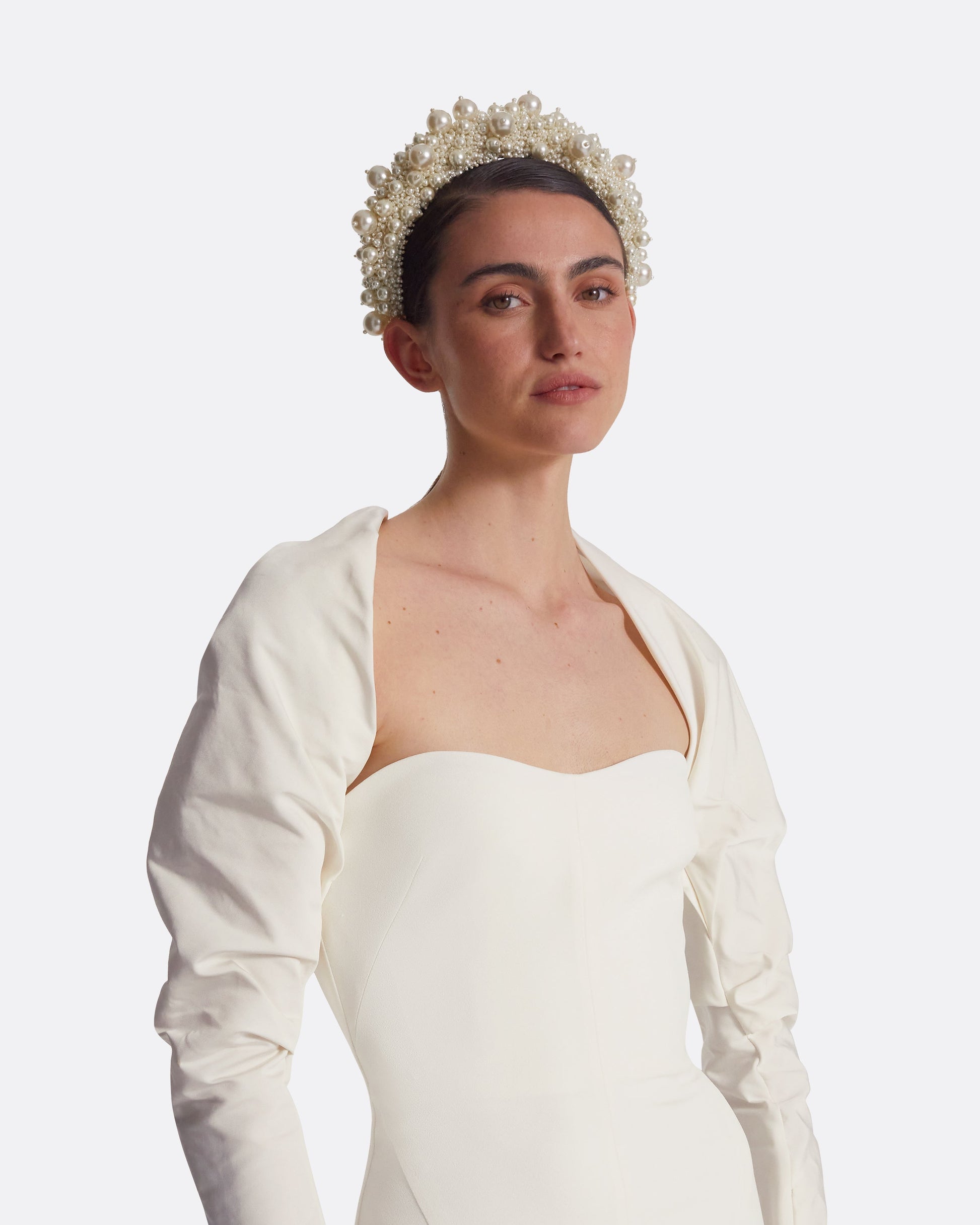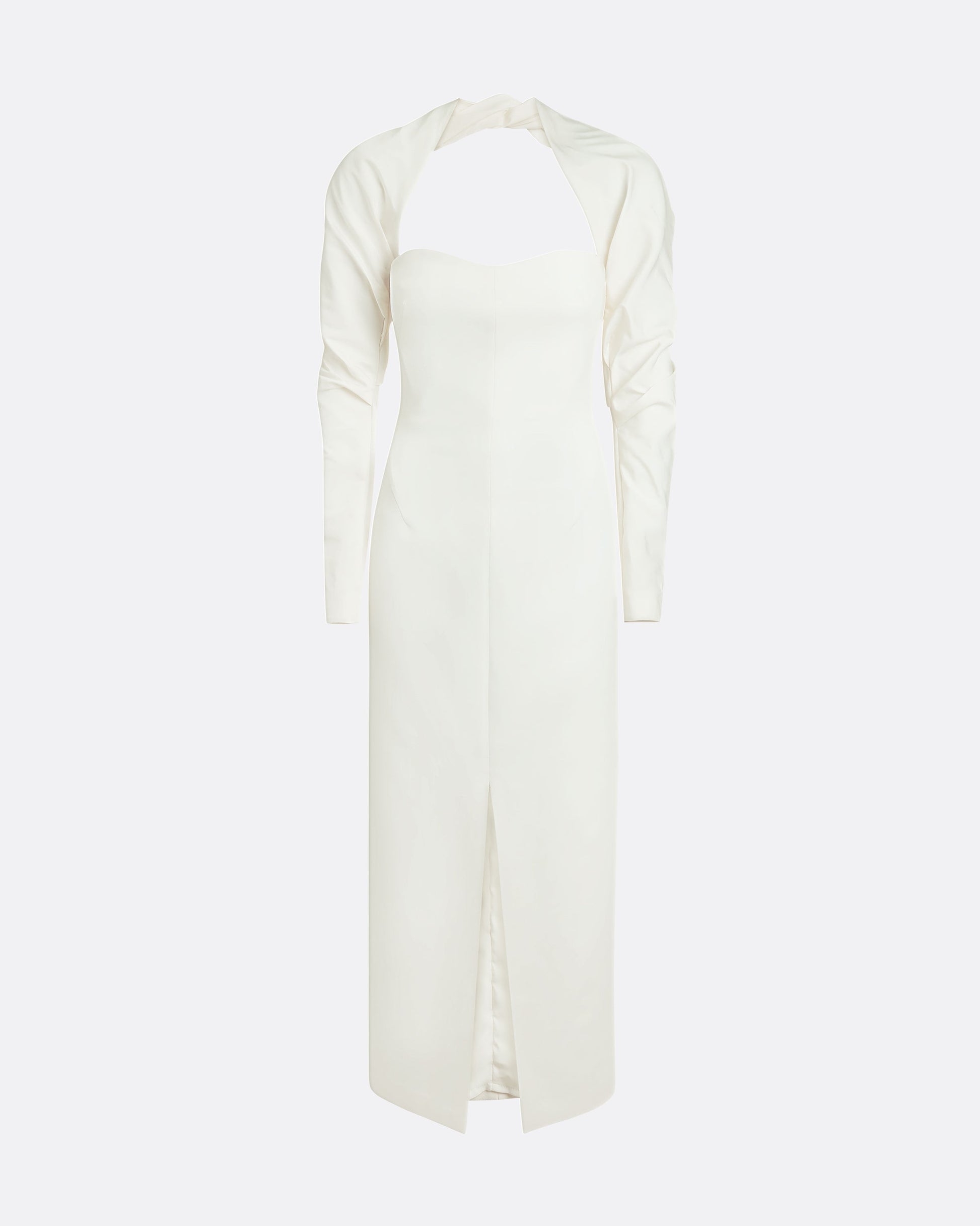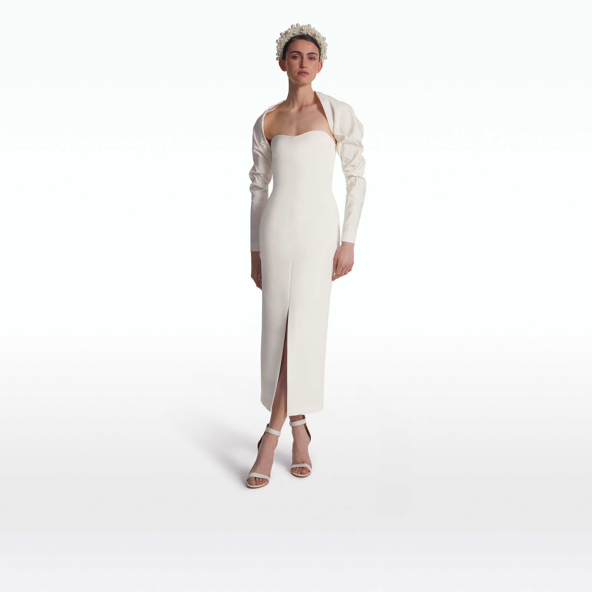 Bustier cocktail dress with centre front split and separate bolero with twist back detail in ivory Heavy Crepe and Faille.