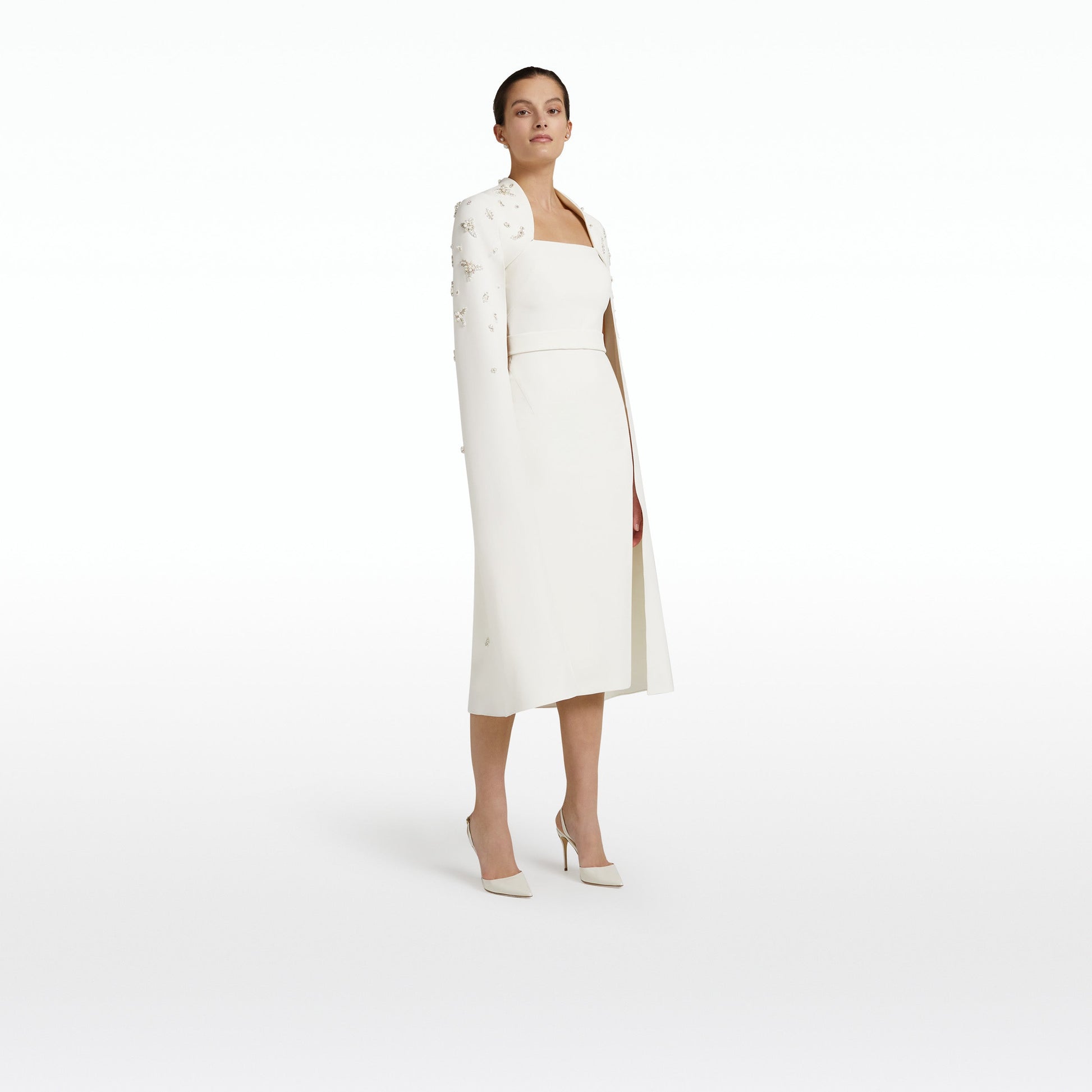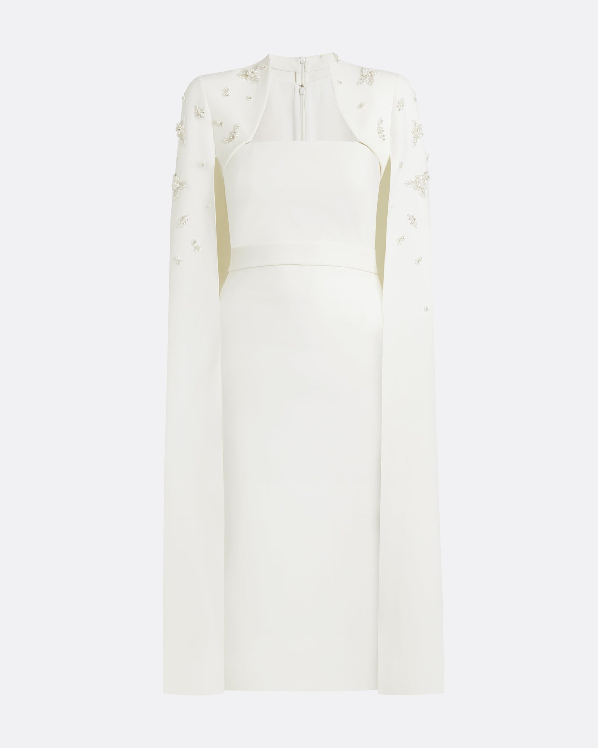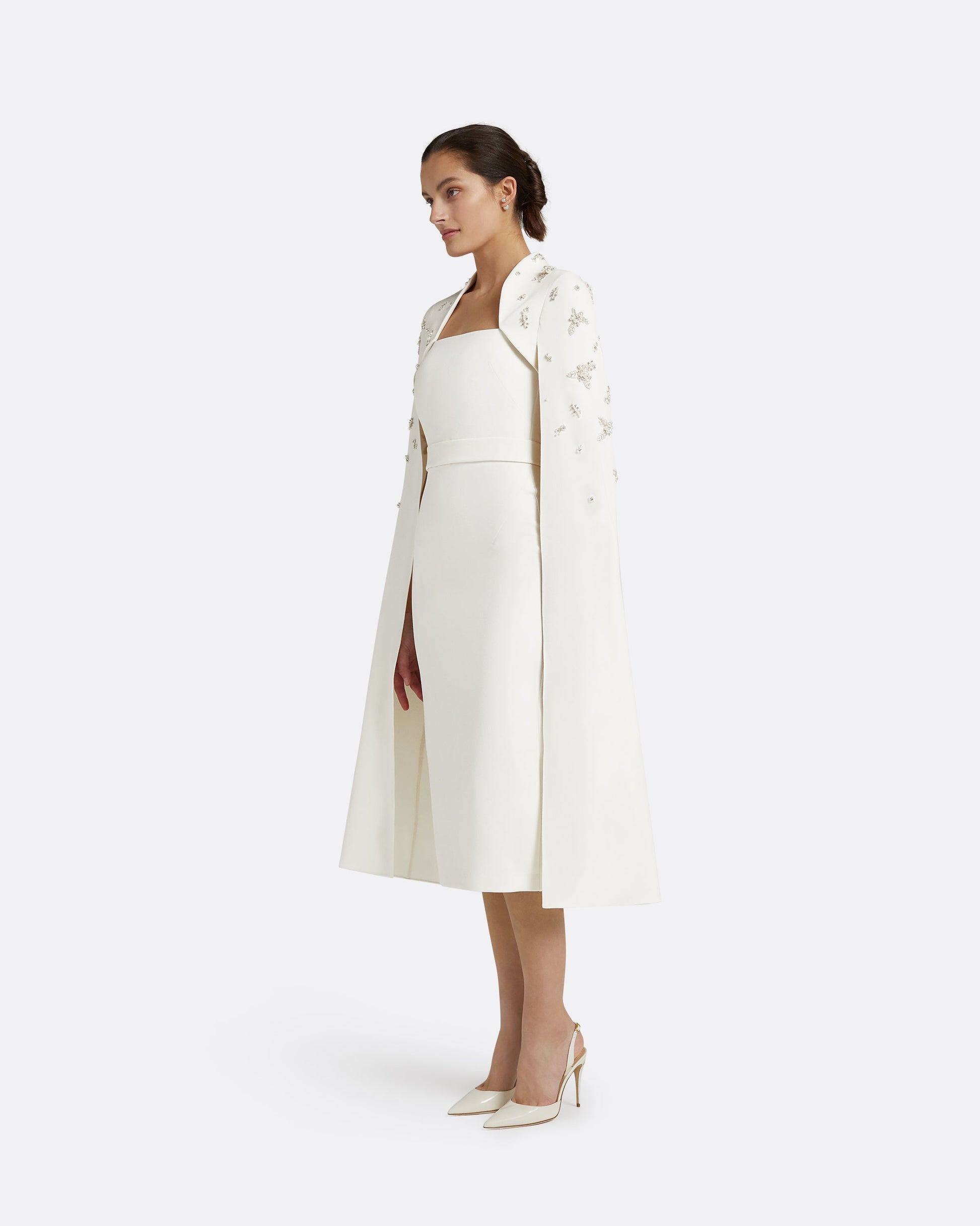 Caped back, A-line, cocktail dress in ivory with Pearl Floral embroidery.