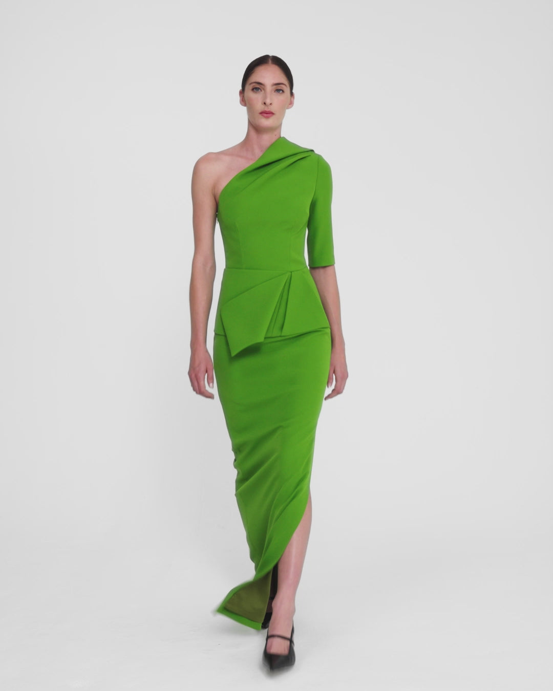 From the Spring Summer ’26 collection, the Rosalinda Gown in verdant green explores asymmetry through fluid draping and sculpted structure. A draped neckline extends into a single sleeve, balanced by a peplum detail at the waist that defines the silhouette before falling into a streamlined column skirt. An elevated choice for summer formal occasions and black-tie events.