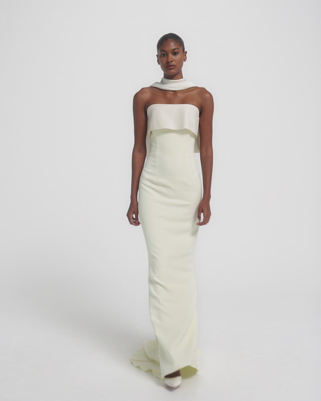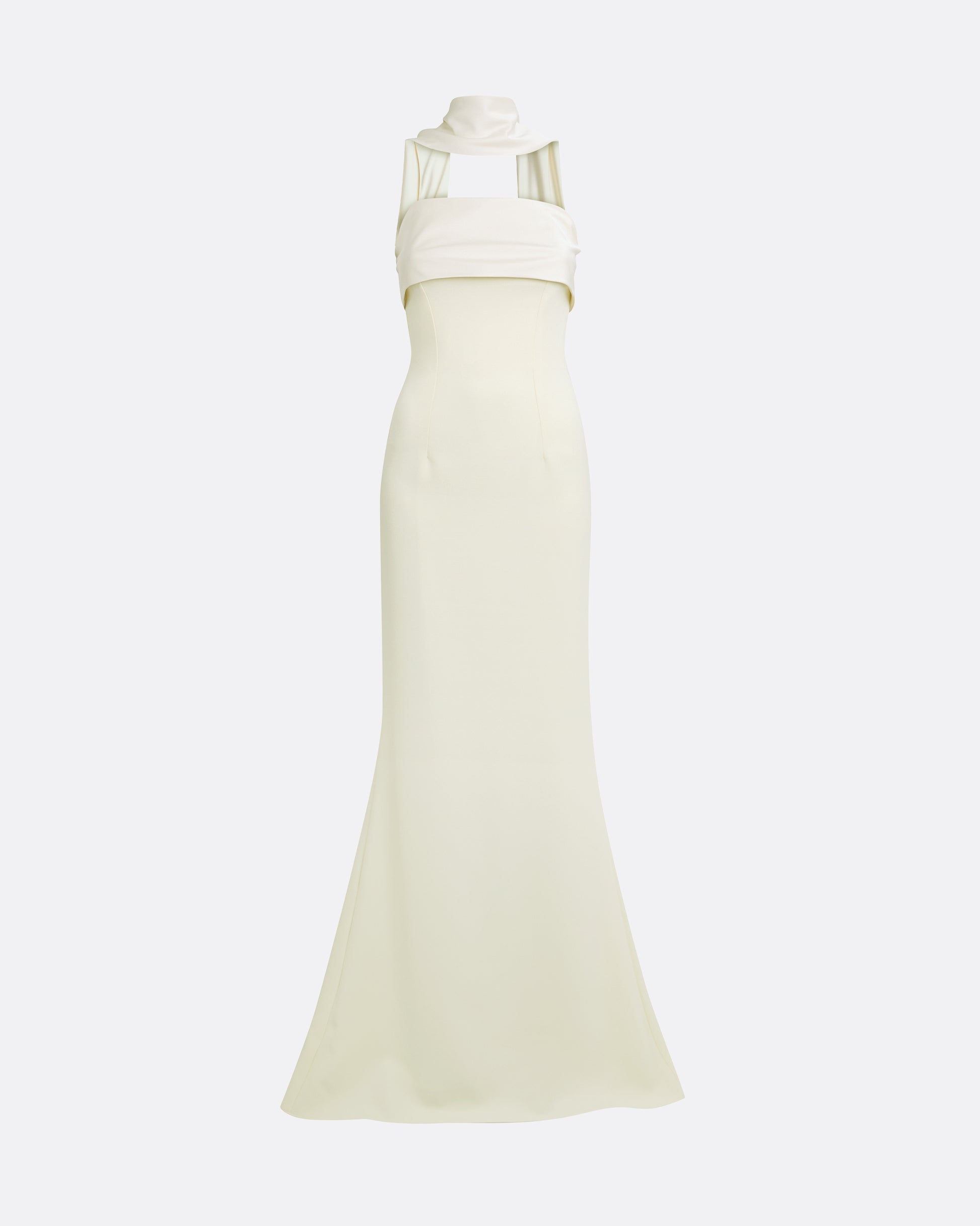 Gown with soft fishtail skirt and scarf detail in sorbet Light Satin Back Crepe on Heavy Crepe.