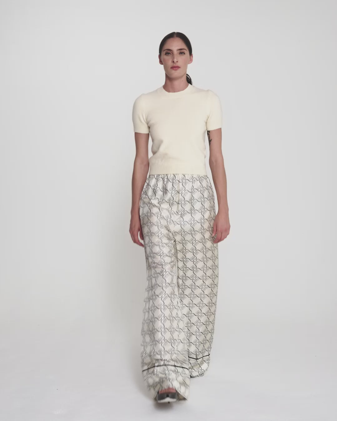 From the Spring Summer ’26 collection, the Rossana trousers in black on ecru introduces a graphic element to a relaxed, tailored shape. The patterned finish draws the eye, while the overall line remains clean and considered.