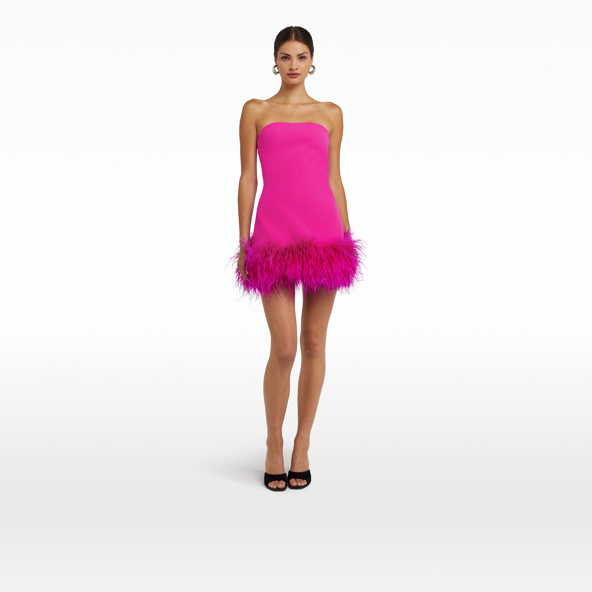 Mini A-line, strapless dress with statement feather trim in wild strawberry Heavy Crepe and Ostrich Feathers.