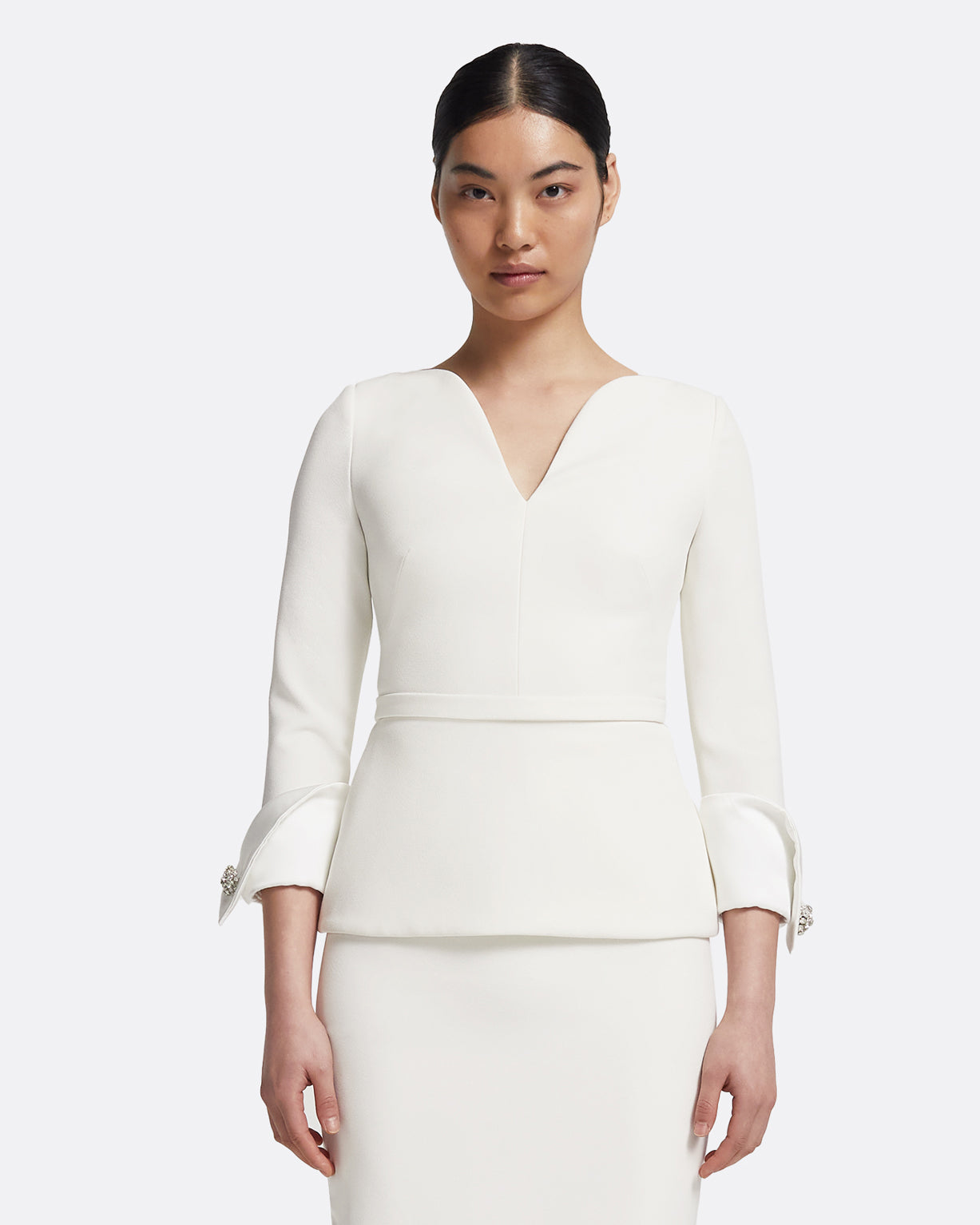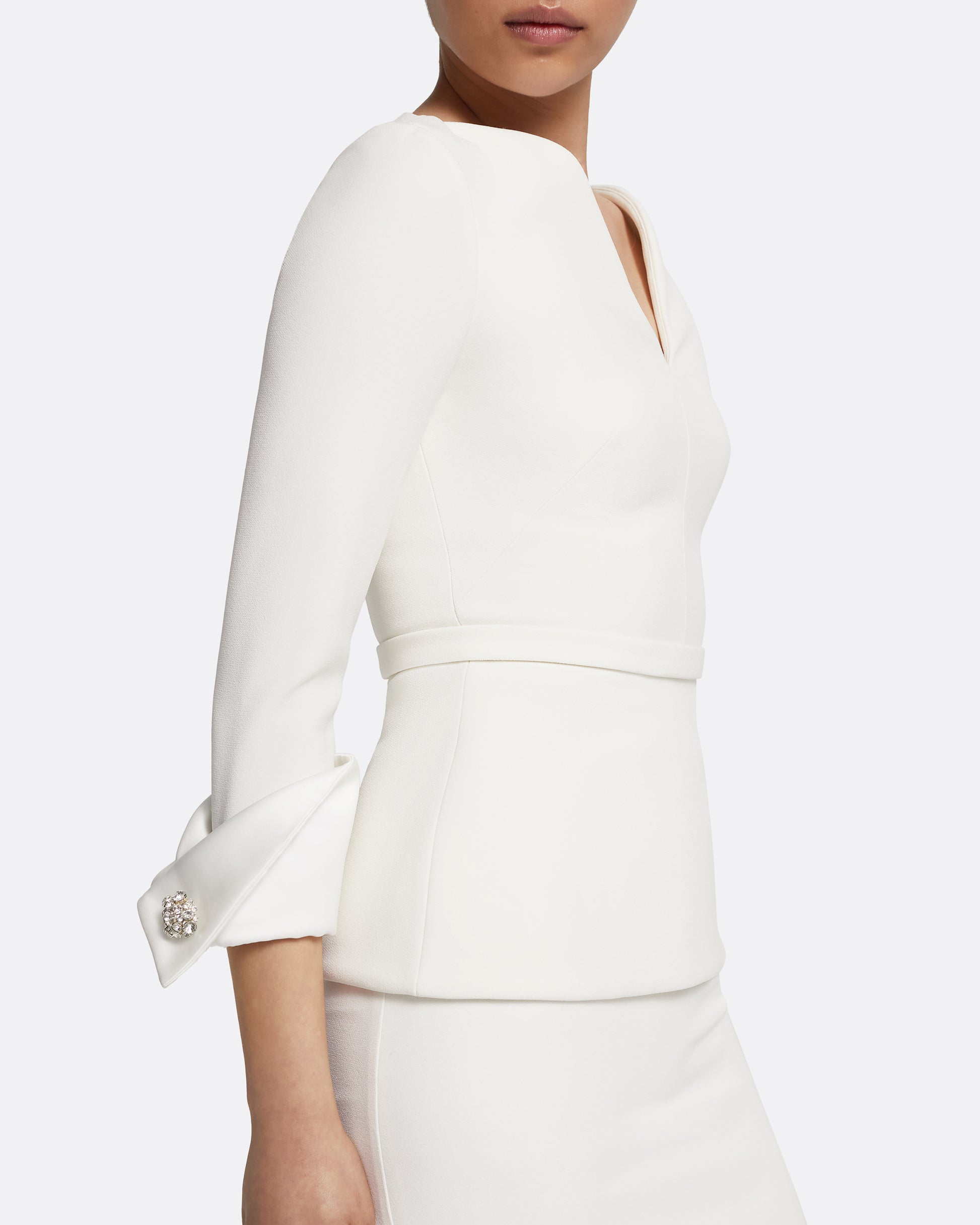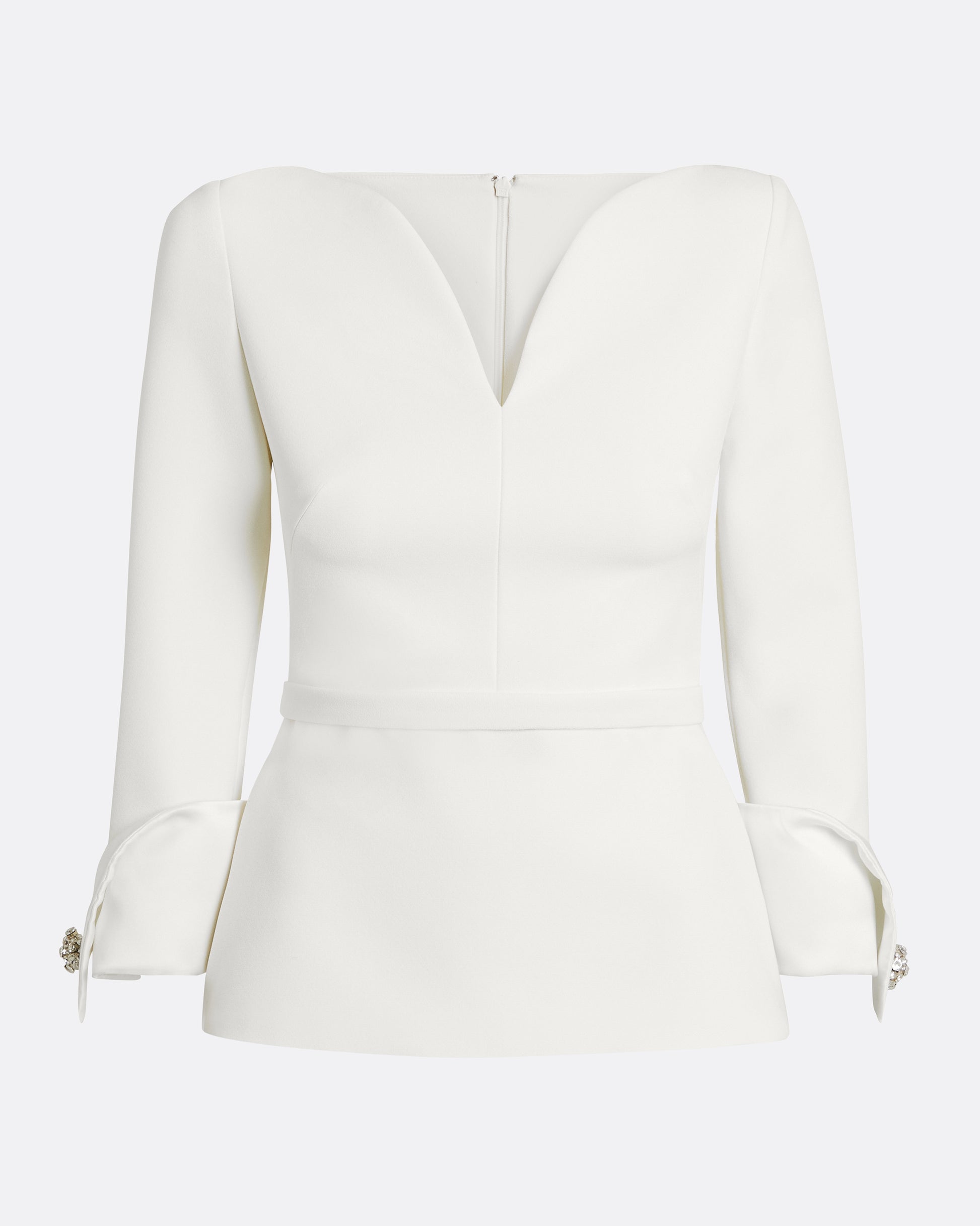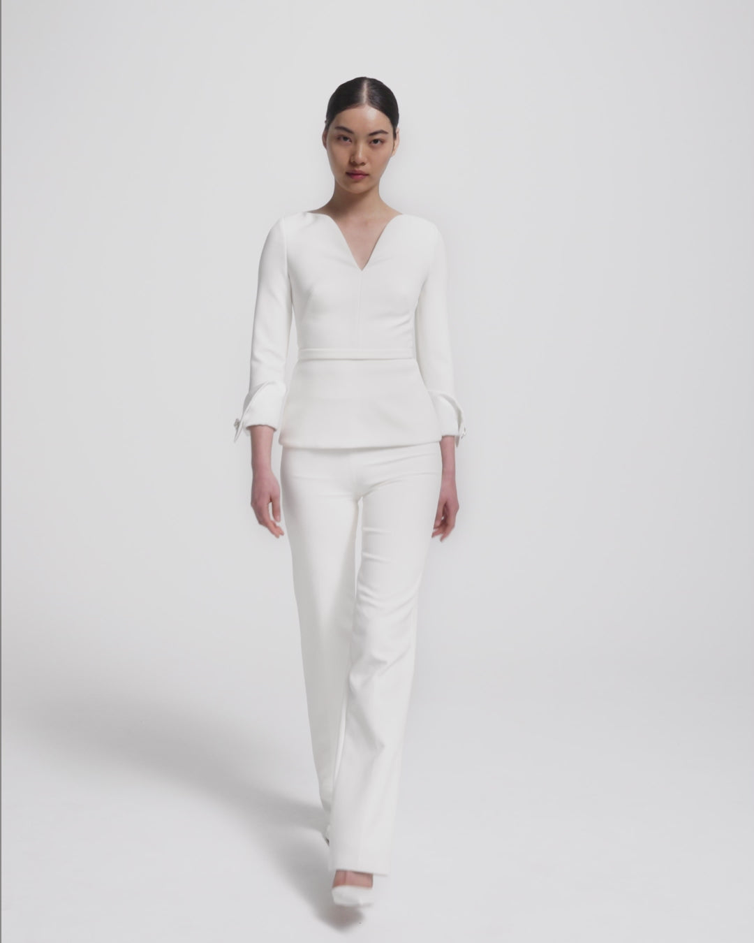 From the Bridal ’26 collection, the Tinetta top in porcelain on ivory is paired with the Jonia belt, creating a composition of softness and definition. Draped sleeves fall into sculpted cuffs, while the crystal belt introduces a note of light at the waist.