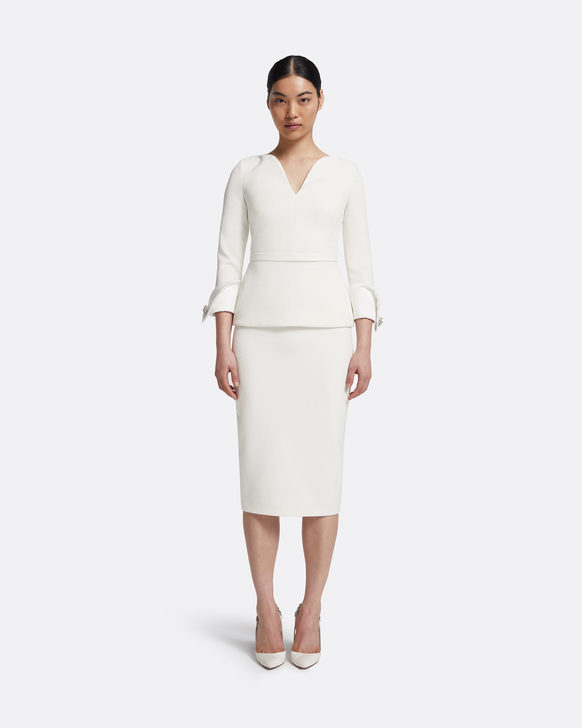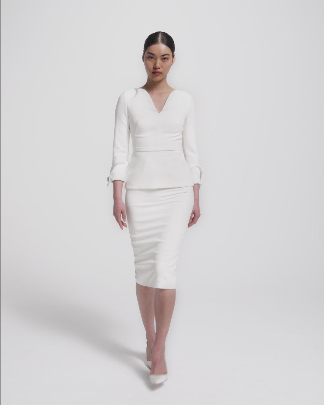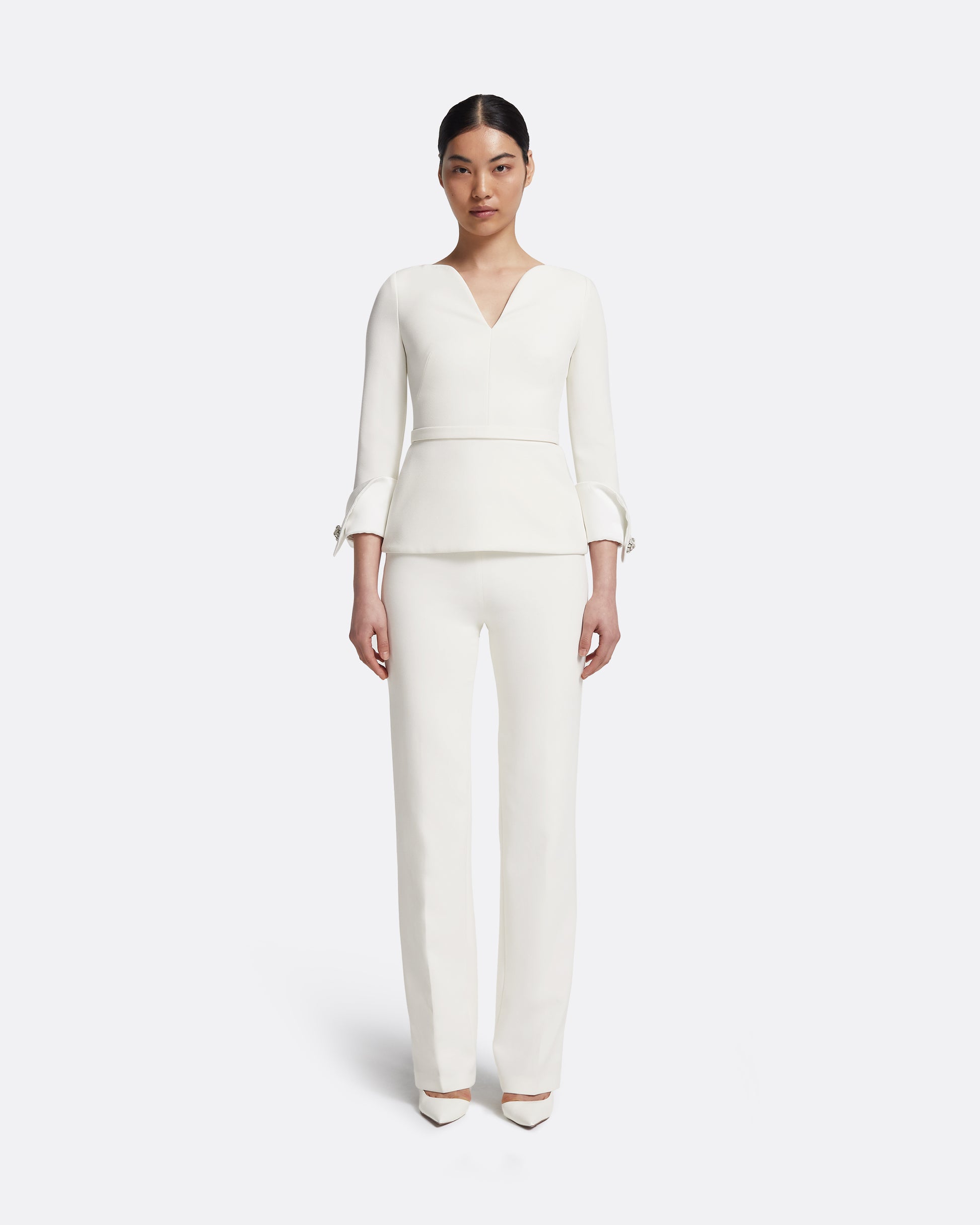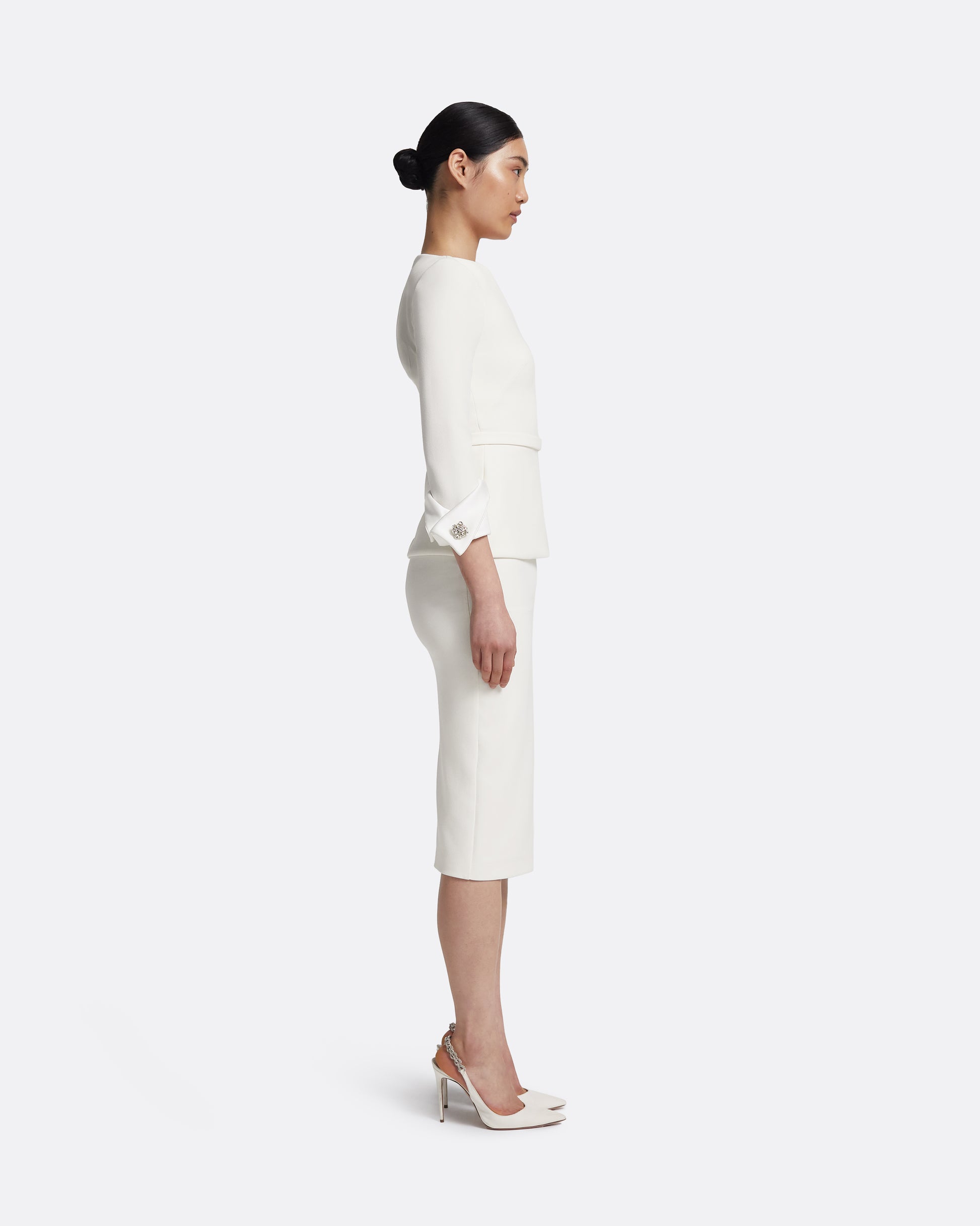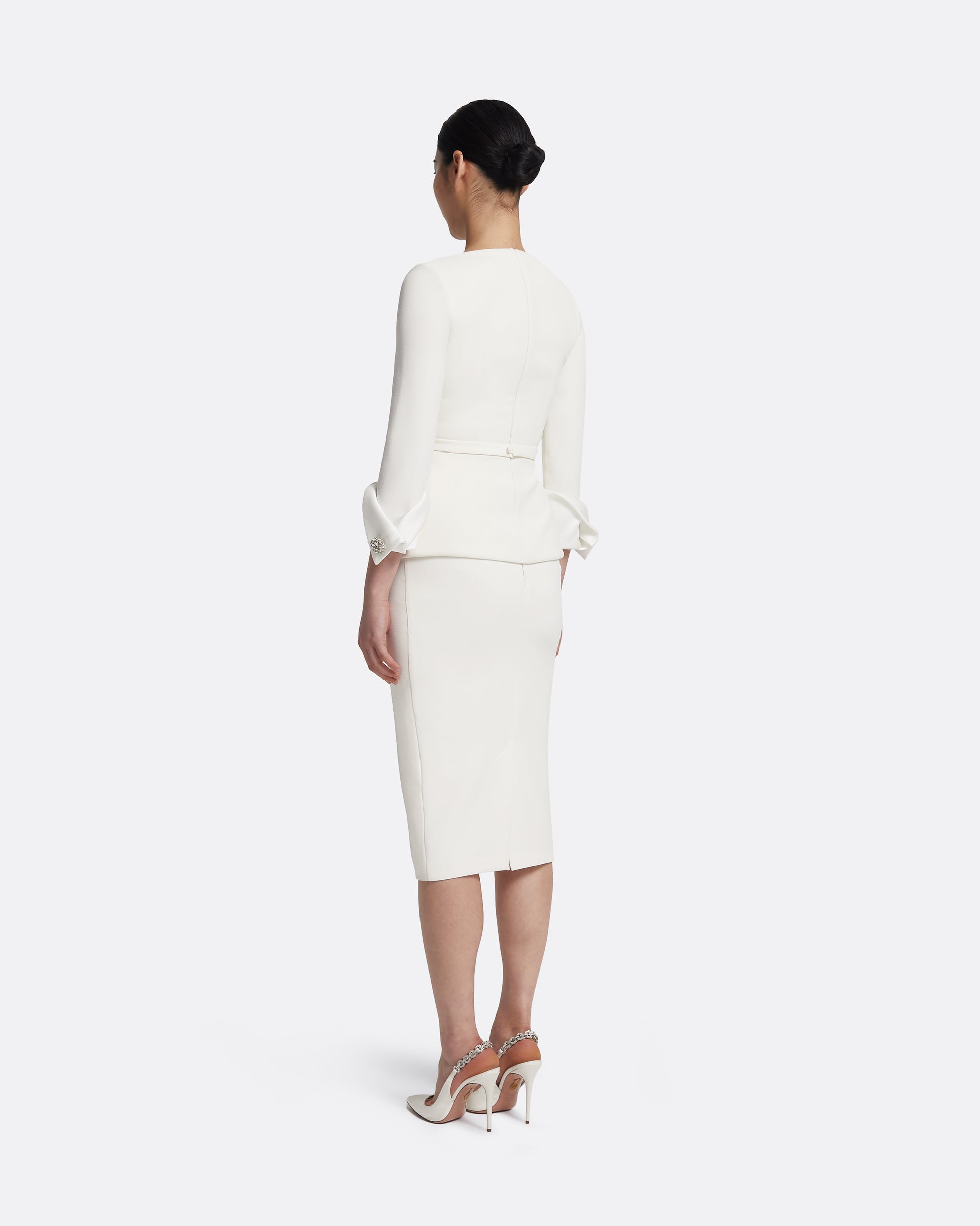From the Bridal ’26 collection, the Tinetta top in porcelain on ivory is paired with the Jonia belt, creating a composition of softness and definition. Draped sleeves fall into sculpted cuffs, while the crystal belt introduces a note of light at the waist.