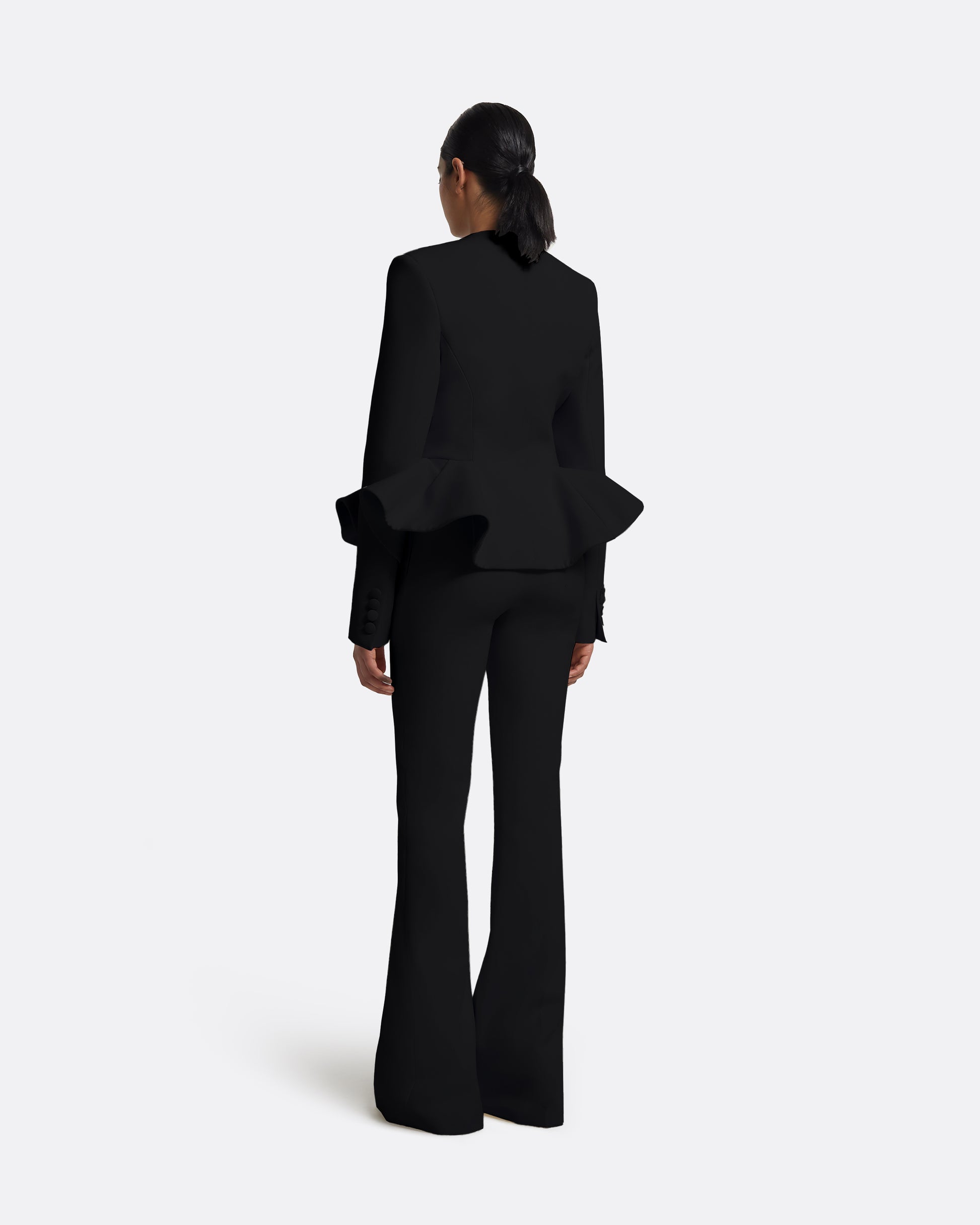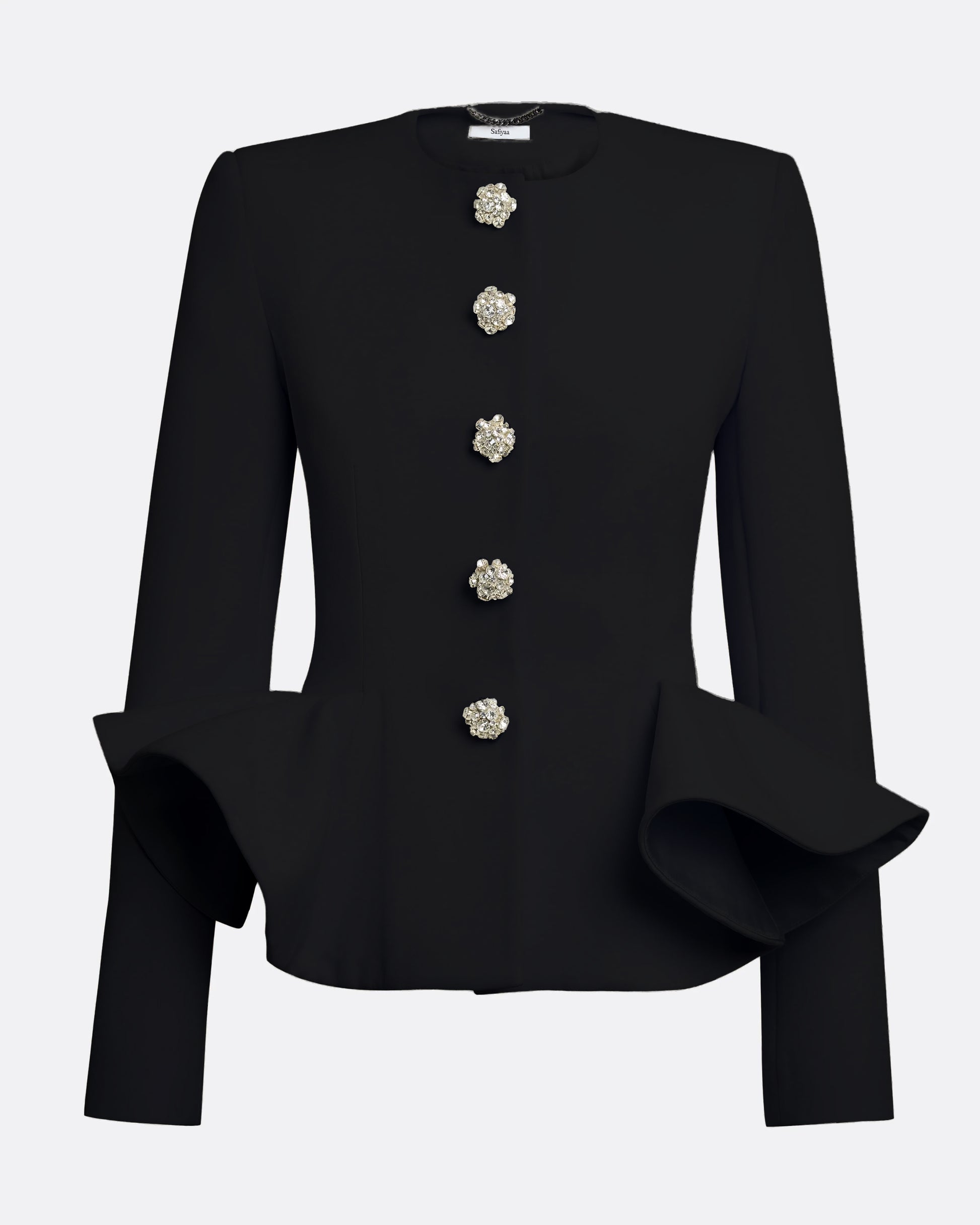 From the Autumn Winter ’25 collection, the Tomomi jacket in black with crystal blends tailored restraint with a softened shape. Its statement silhouette adds dimension, while embellishment lends quiet radiance.