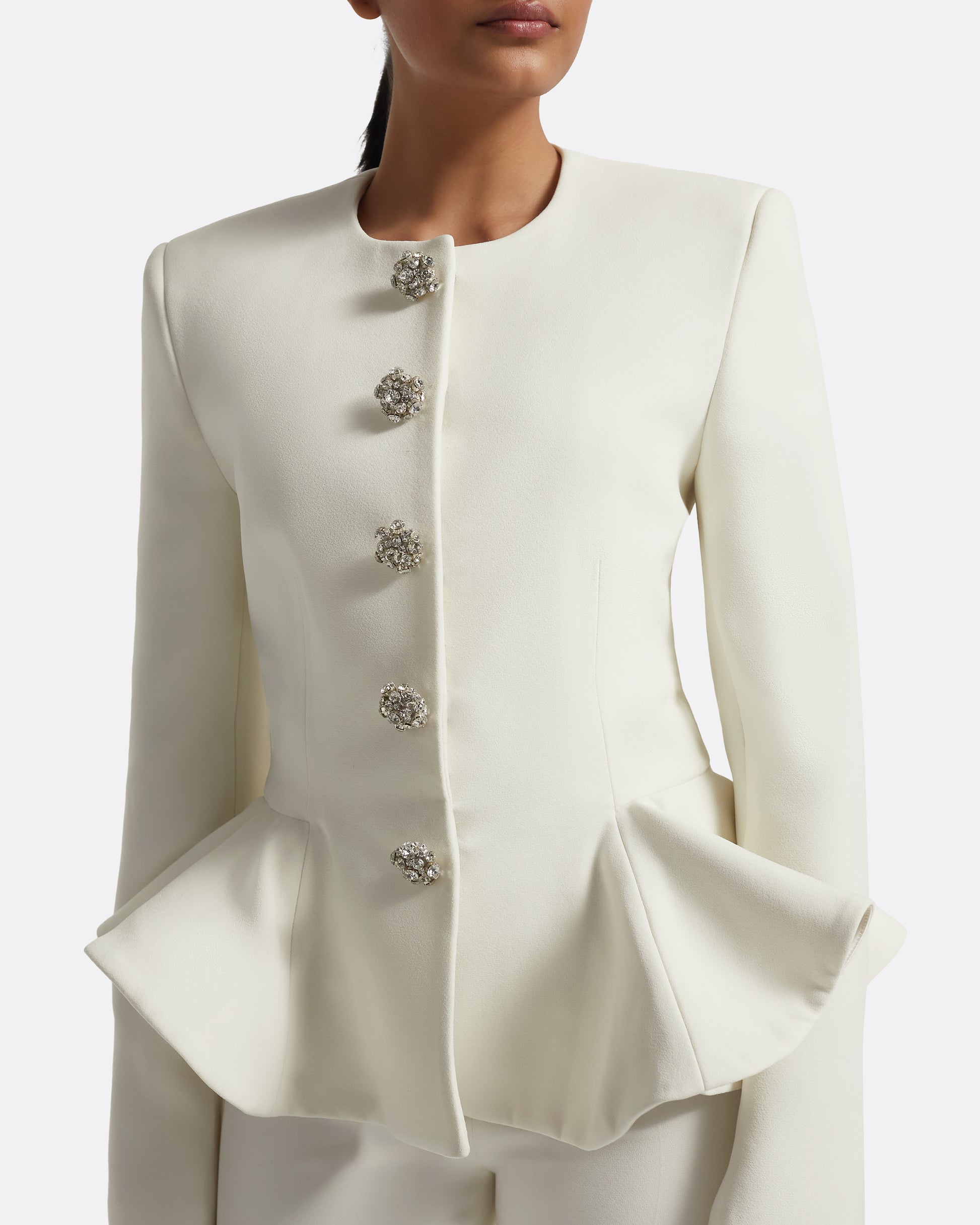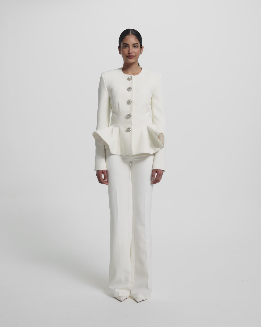 From the Autumn Winter ’25 collection, the Tomomi jacket in ivory with crystal blends tailored restraint with a softened shape. Its statement silhouette adds dimension, while embellishment lends quiet radiance.