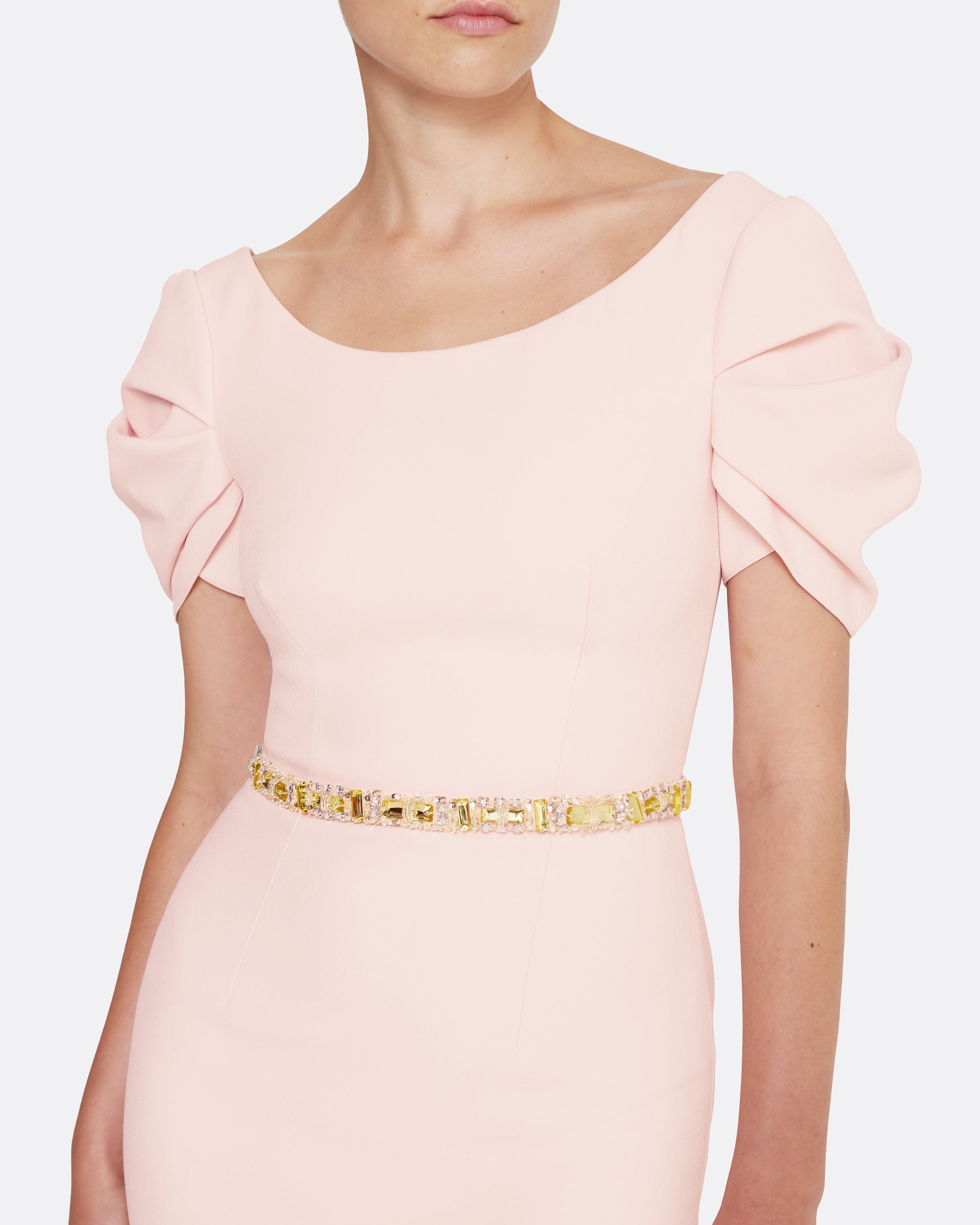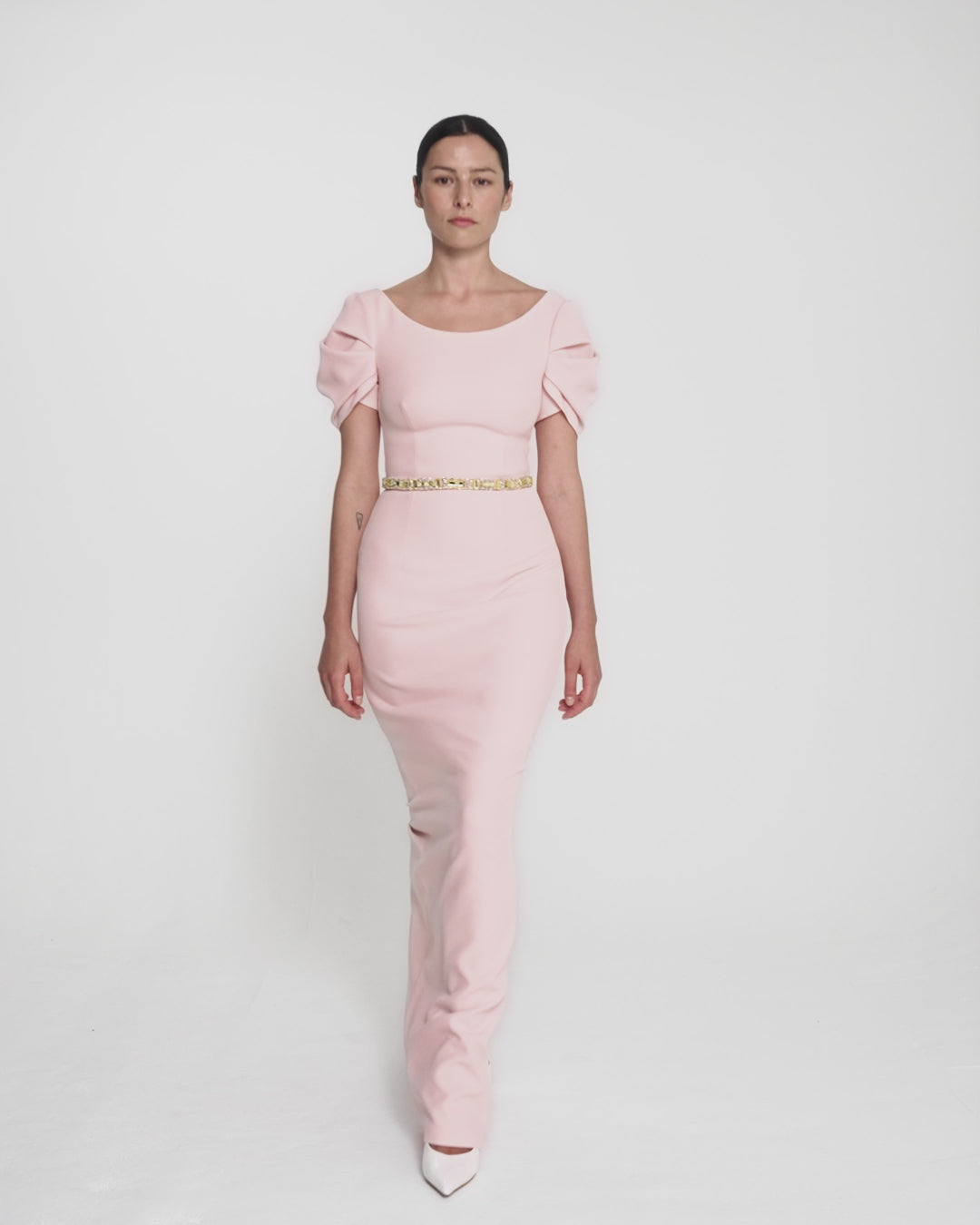 Column gown with sculptural draped sleeves