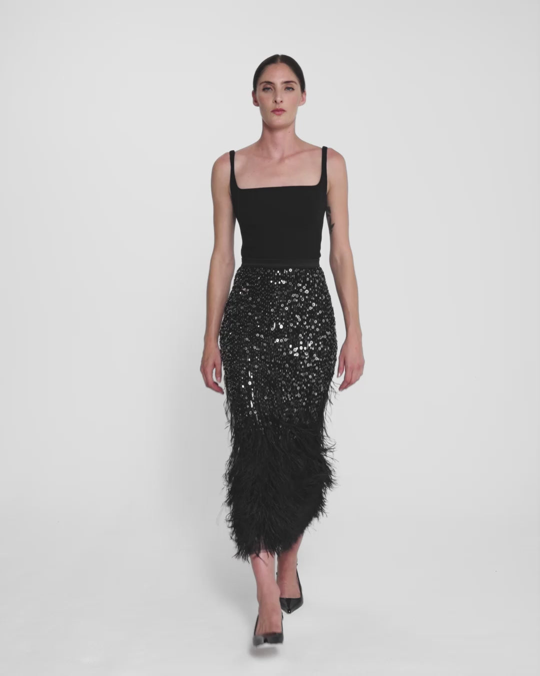 From the Spring Summer ’26 collection, the Vivica Skirt delivers a confident statement through texture and fluidity. Crafted on a light tulle base, the midi silhouette is intricately embroidered and finished with feather embellishments that introduce sparkle and expressive movement. Style with the matching Fabianna Jacket for a cohesive, elevated look.