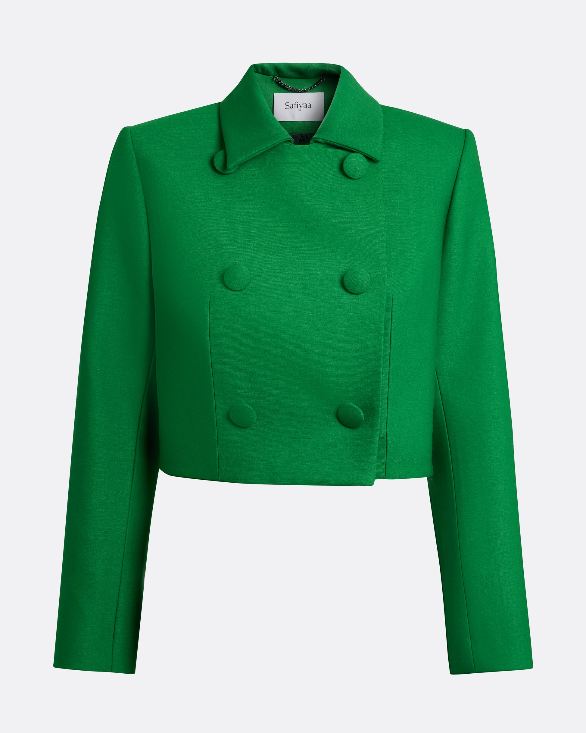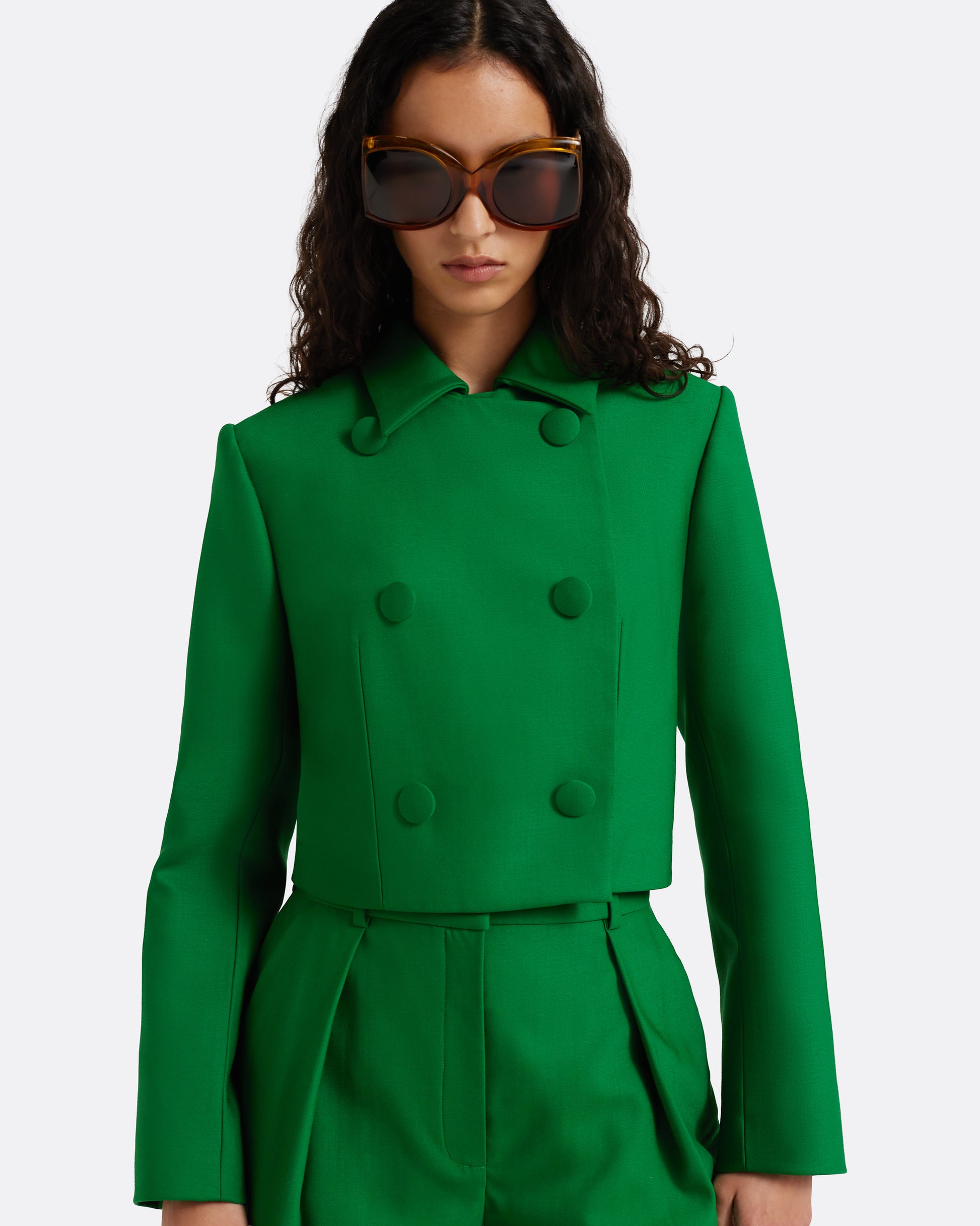 From the Pre-Fall ’26 collection, the Yui Jacket in blade green offers a refined approach to tailored daywear and workwear dressing. Cut to a cropped, double-breasted silhouette in wool, it features self-covered buttons for a clean, polished finish. Designed to pair with the matching Cierra Shorts or Yuki Skirt for a coordinated look, with the option to coordinate with other separates in the group through custom order.