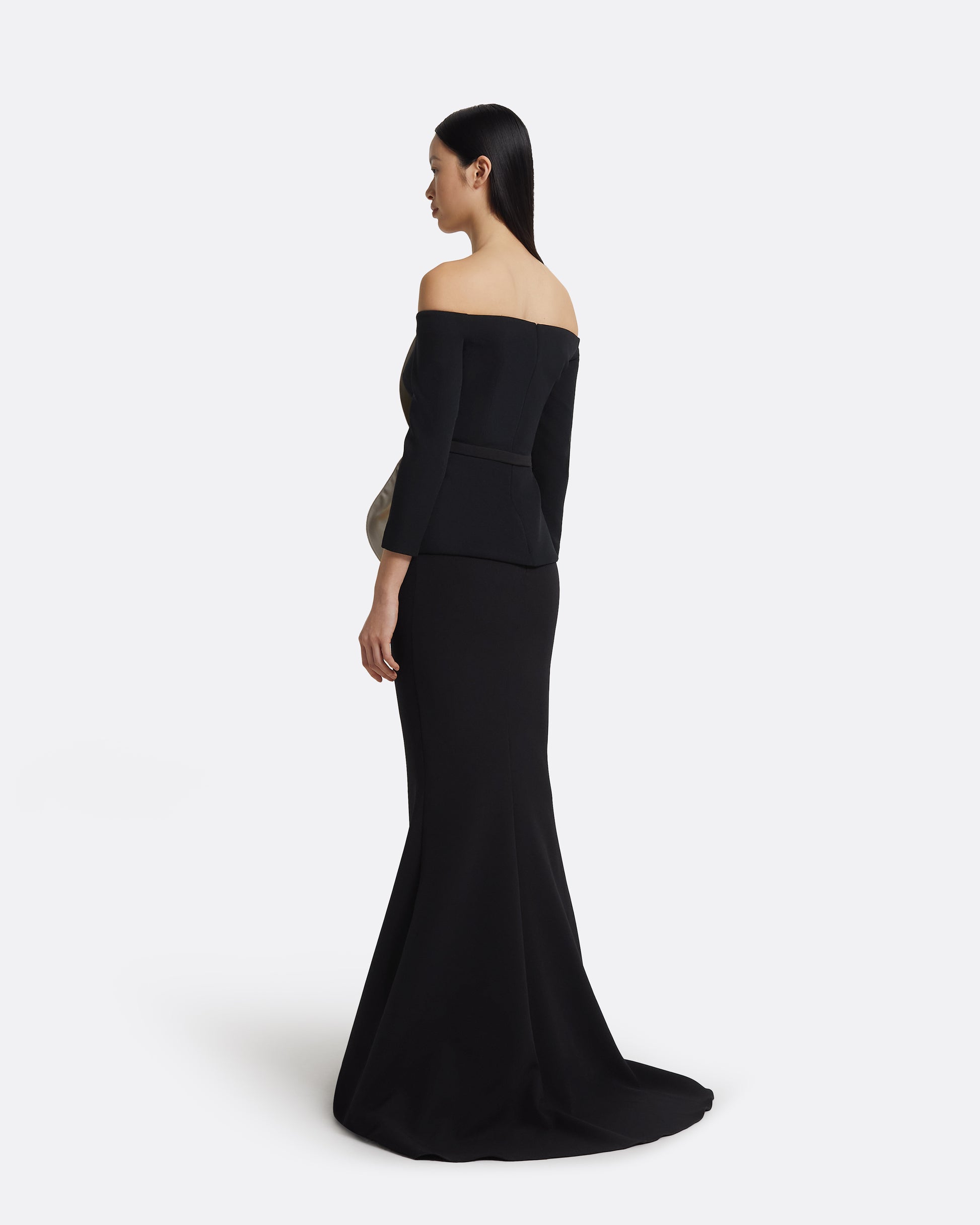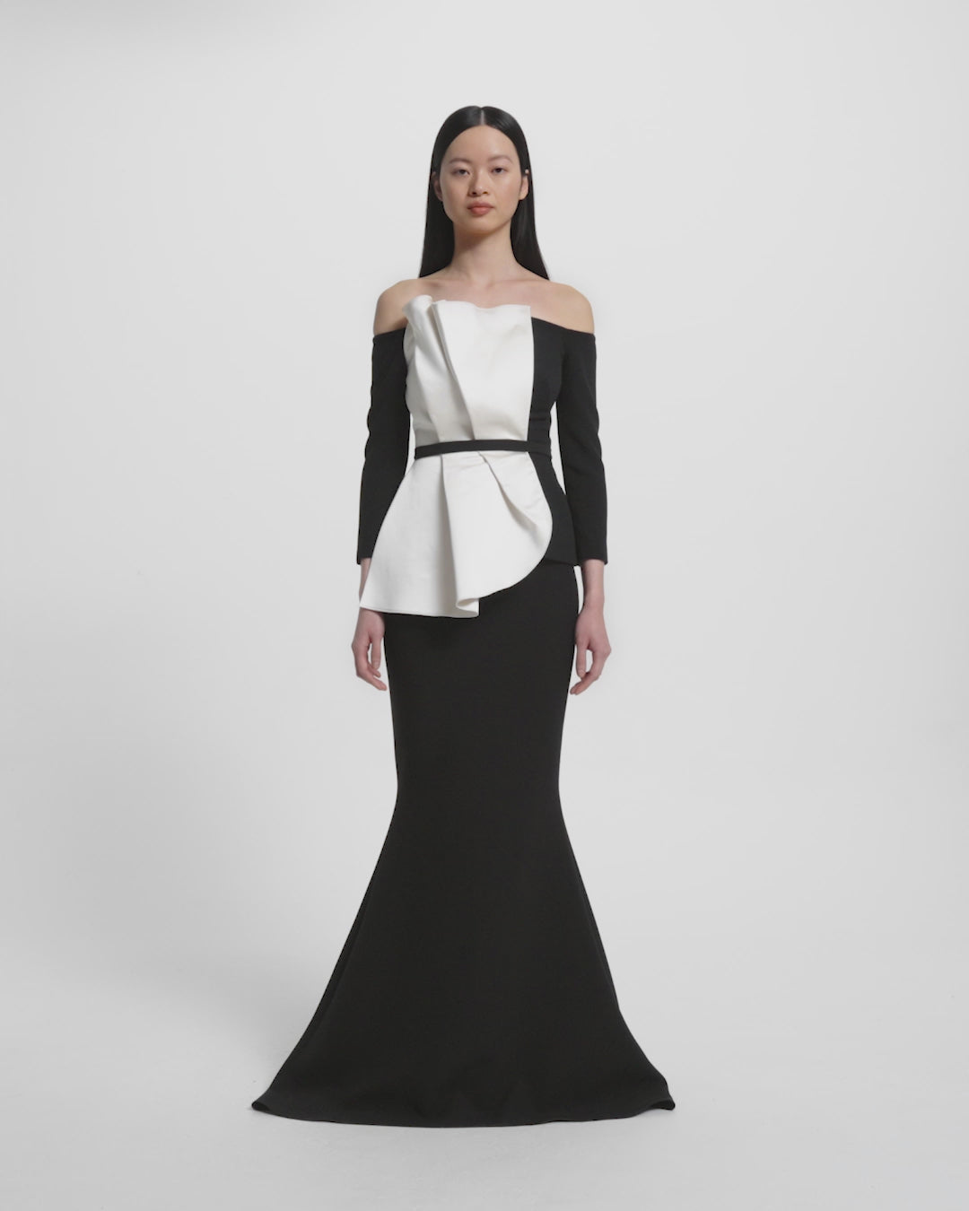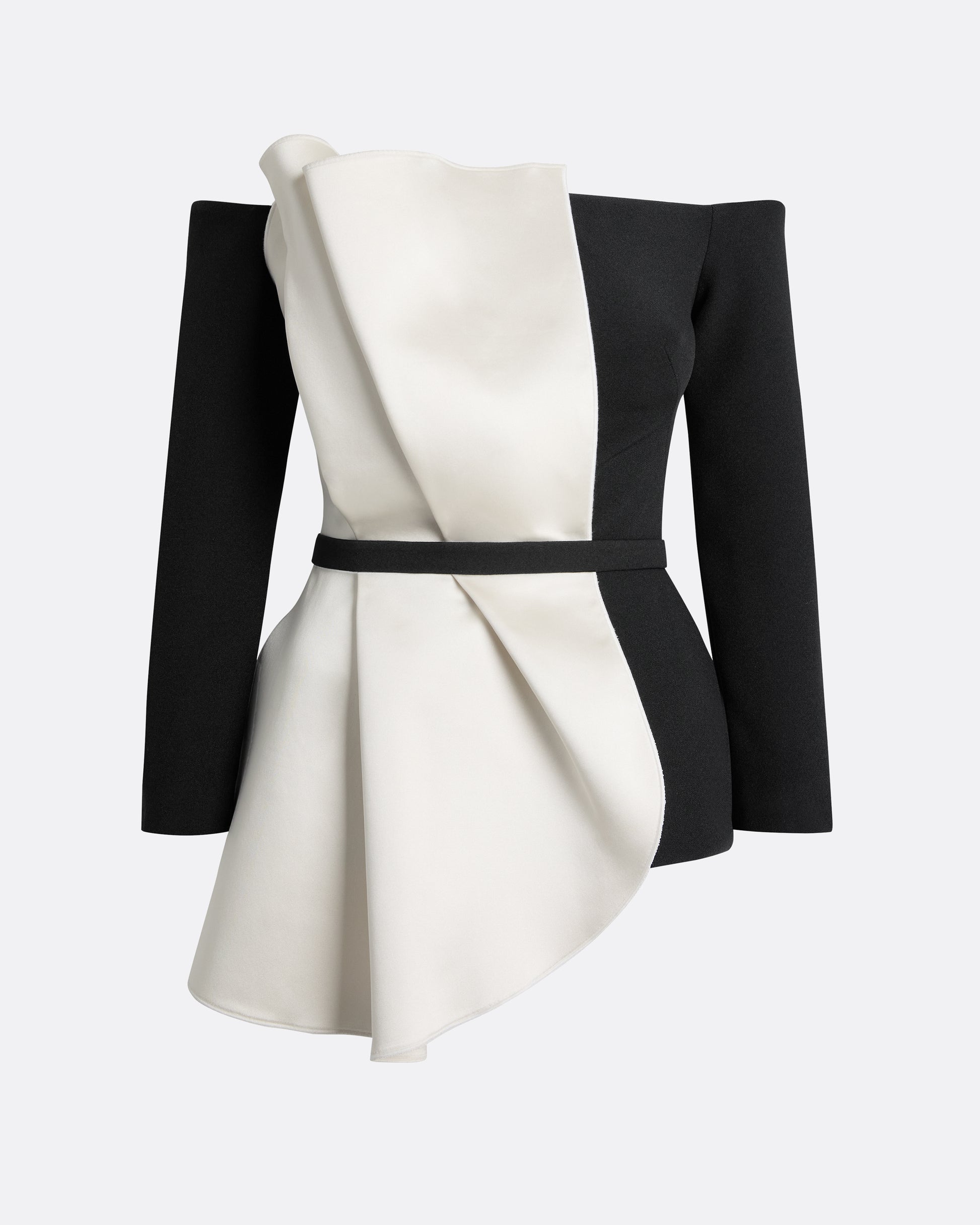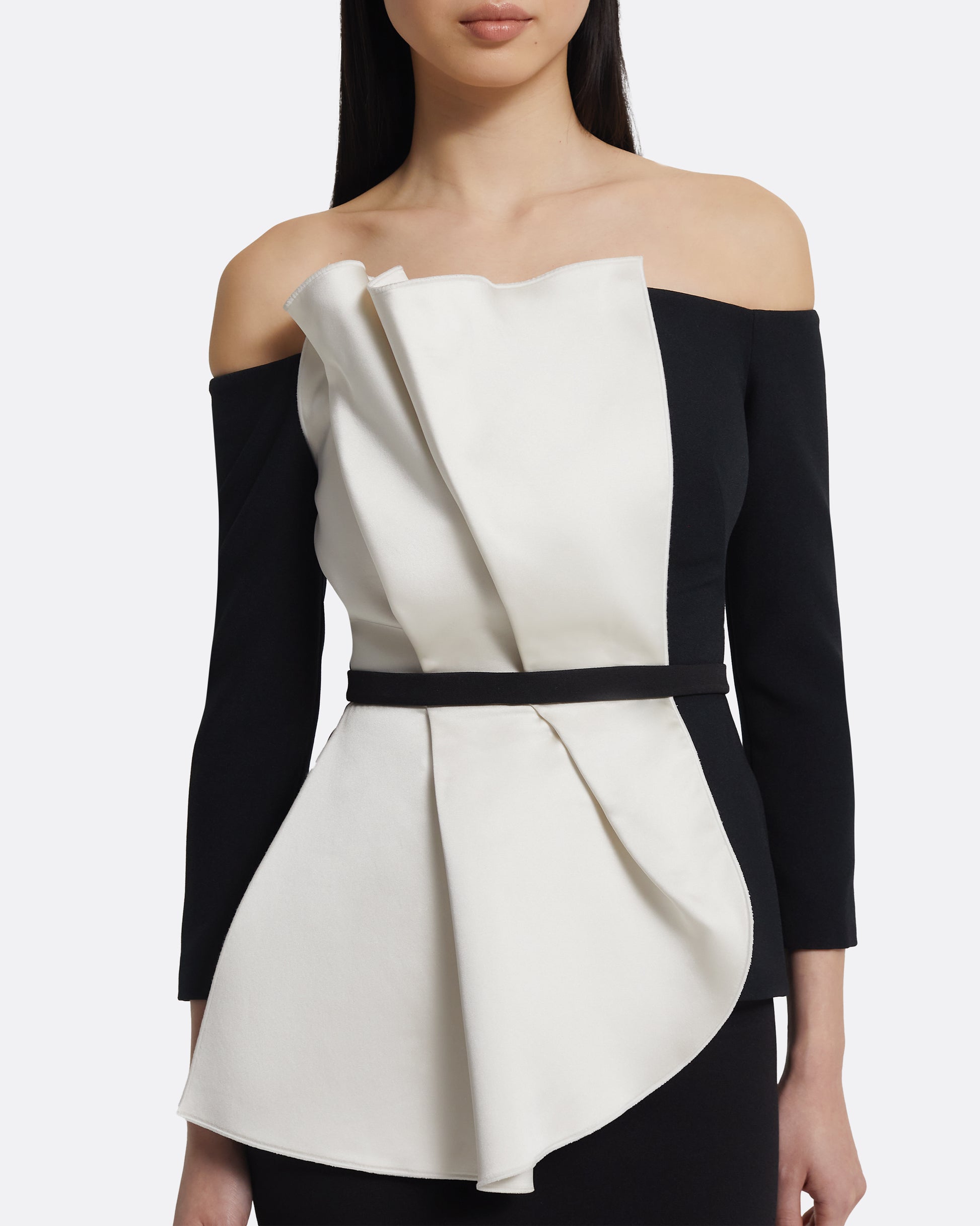 From the Autumn Winter '25 collection, the Yuka top in ivory on black plays with directional line and tonal contrast. The pleated drape falls from a bold off-shoulder neckline, framing the body with poised movement.
