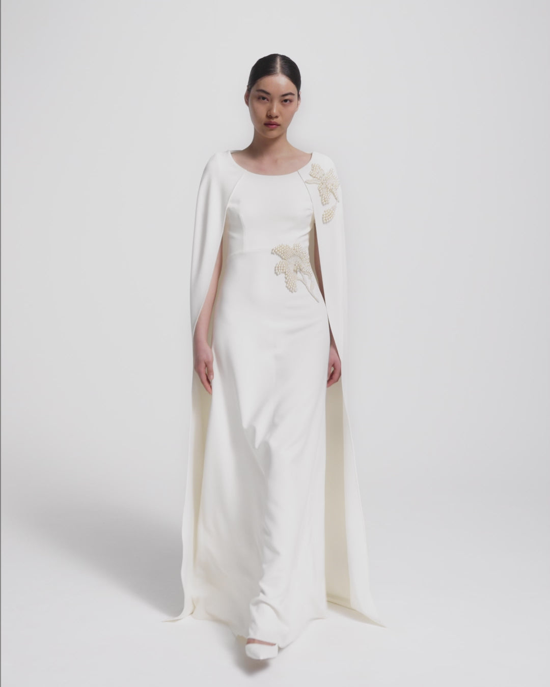 From the Bridal '26 collection, the Yuna dress in ivory is designed with poise and luminosity. A sweeping cape overlay lends sculptural motion, while the clean cut of the base creates a quietly commanding presence.